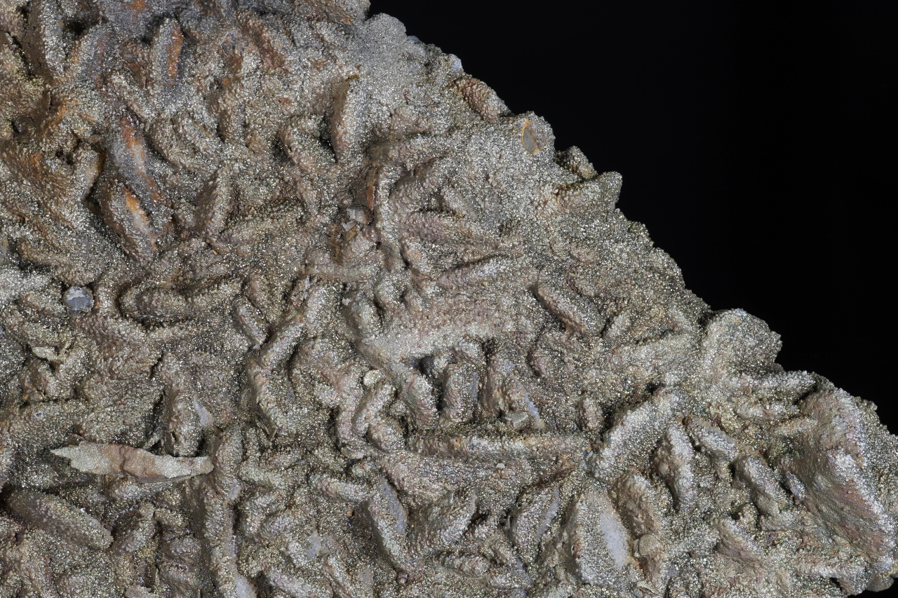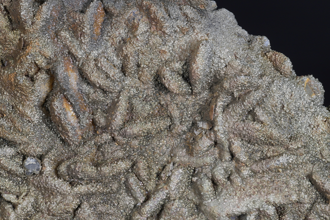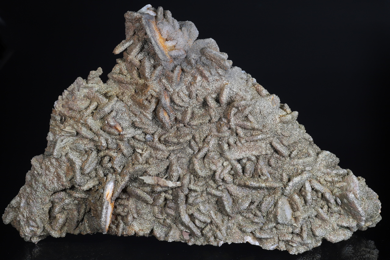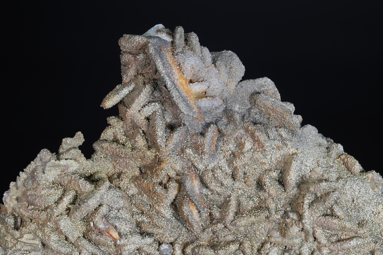 Große flache Druse von tafeligen Baryt-Kristallen bedeckt mit einer Kruste aus kristallinem Quarz und feinkristallinem Pyrit. Pyrit erzeugt auf der Oberfläche der Probe eine schöne goldgelbe Farbe.