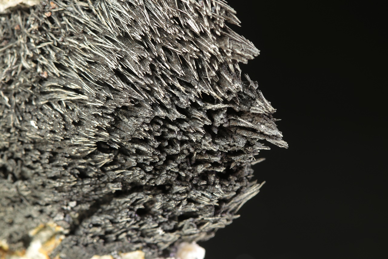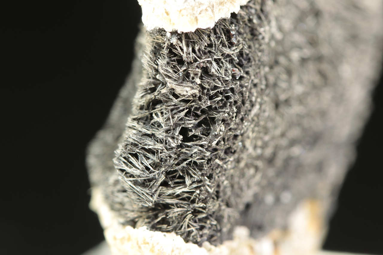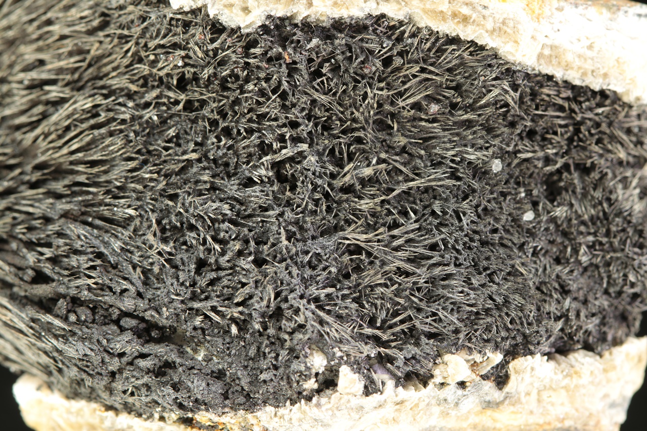 Komplettes Profil einer Ader, gebildet aus drahtförmigen Kristallen des silbernen Dyskrazit von 2 bis 5 mm Größe in matt-schwarzem Arsen. Die Drähte gehen von einer eher zufälligen Anordnung an einer Kante zu einer mehr fächerartigen Anordnung an der gegenüberliegenden über.