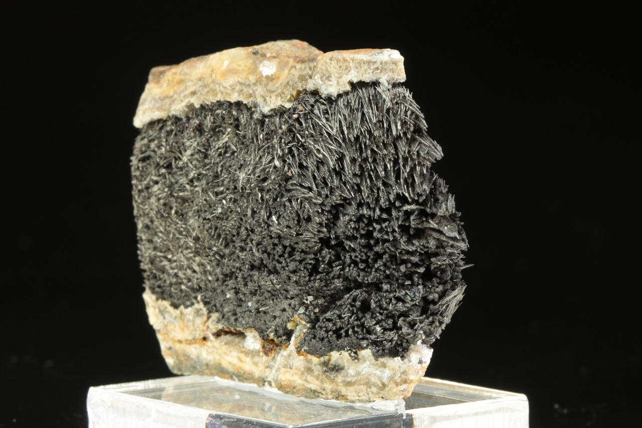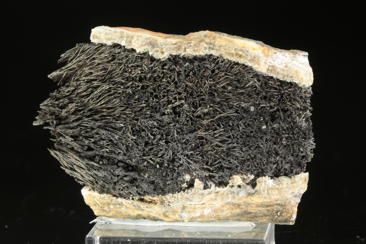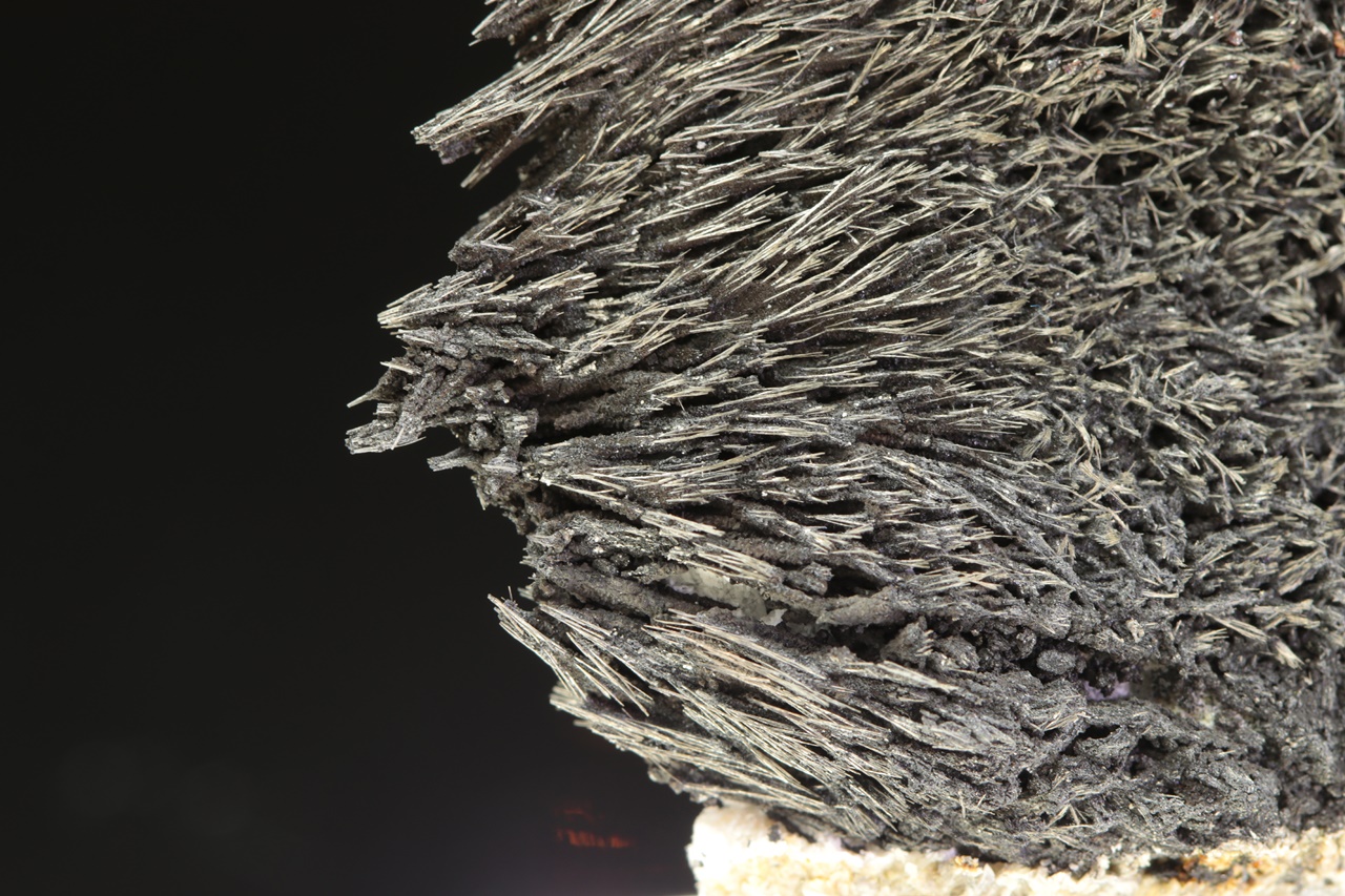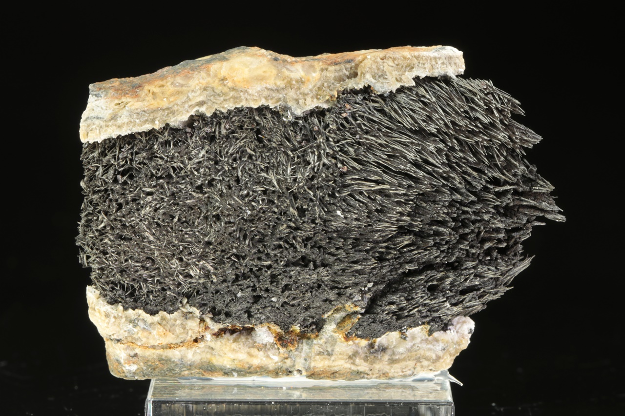 Komplettes Profil einer Ader, gebildet aus drahtförmigen Kristallen des silbernen Dyskrazit von 2 bis 5 mm Größe in matt-schwarzem Arsen. Die Drähte gehen von einer eher zufälligen Anordnung an einer Kante zu einer mehr fächerartigen Anordnung an der gegenüberliegenden über.