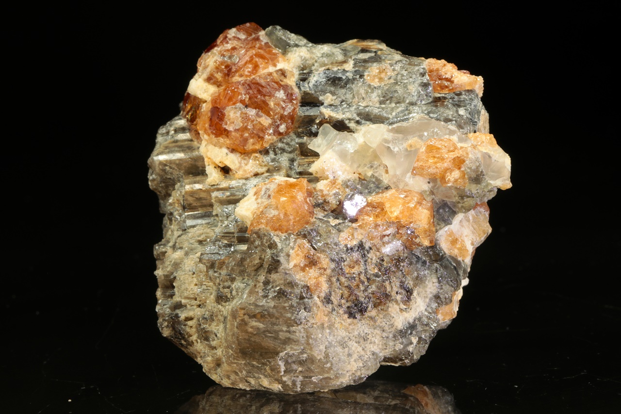 Cluster von glänzenden braun-orange Hessonit-Kristallen in grauem Diopsid. Der größgröste Kristall ist 12 mm groß .