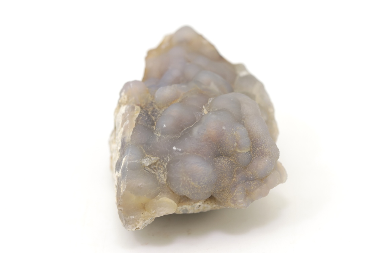 Chalcedony forms translucent and ash-gray kidney-shaped aggregates that intergrow and seemingly resemble a bunch of grapes. This sample of chalcedony comes from the Slovak locality Byšta .