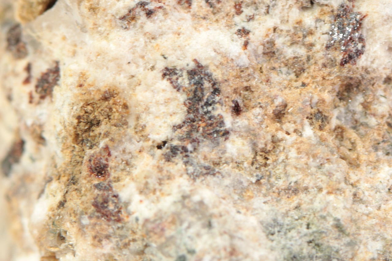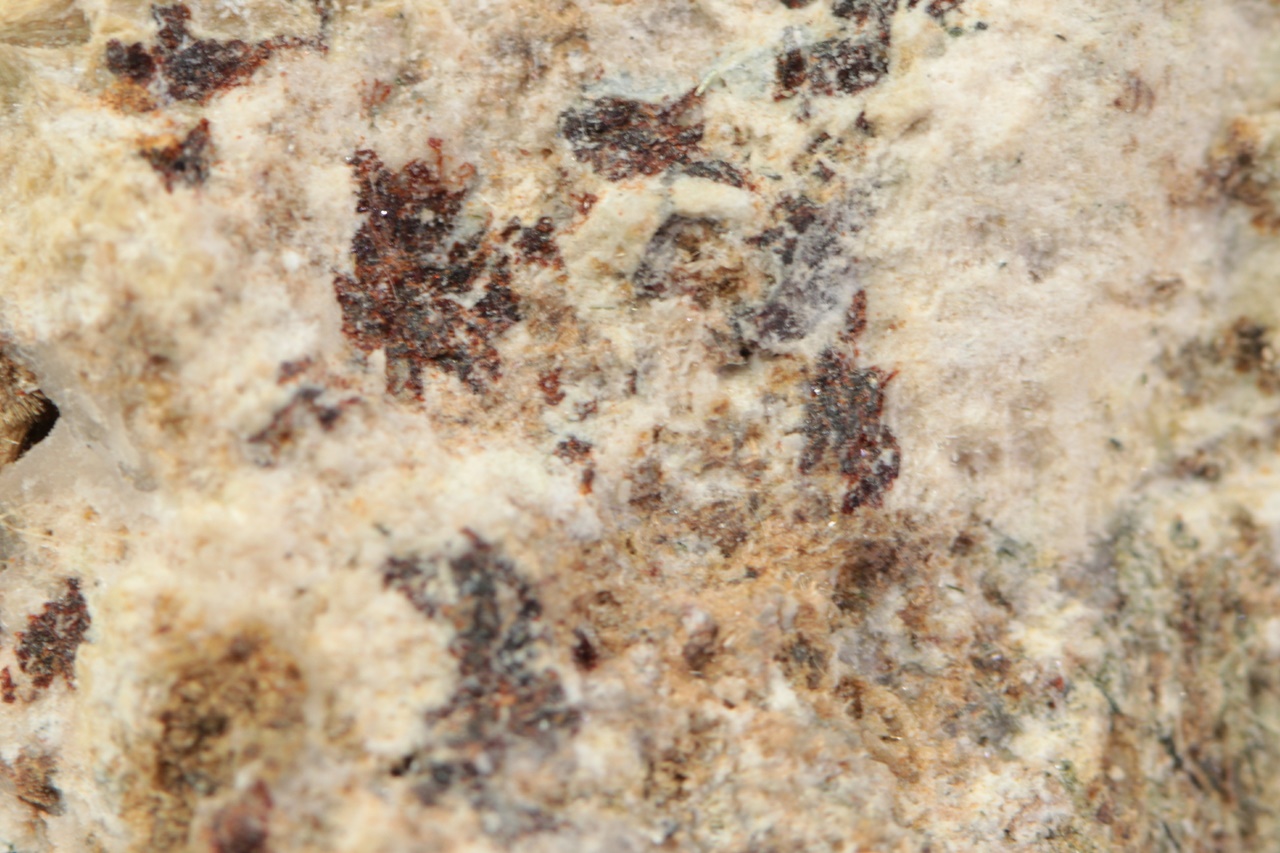 Vzácná ukázka minerální asociace bílého na pohled plstnatého mountainitu (známý pouze z 5 světových lokalit) s červeným lemem s bežovým šupinatým až tabulkovatým bornemanitem (jediná a typová lokalita).