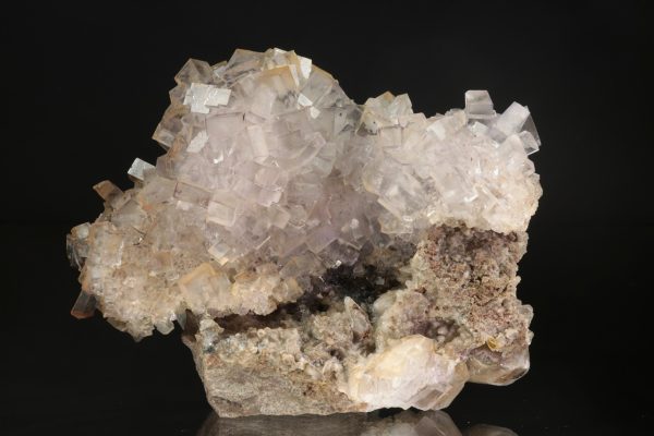 Velmi bohatý vzorek oboustranně narostlých krystalů čirého fluoritu na podložce. Ten tvoří nerovnoměrně vyvinuté kubické krystaly o hraně až 15 mm. Dále jsou na vzoru přítomné skalenoedry světle žlutého kalcitu.