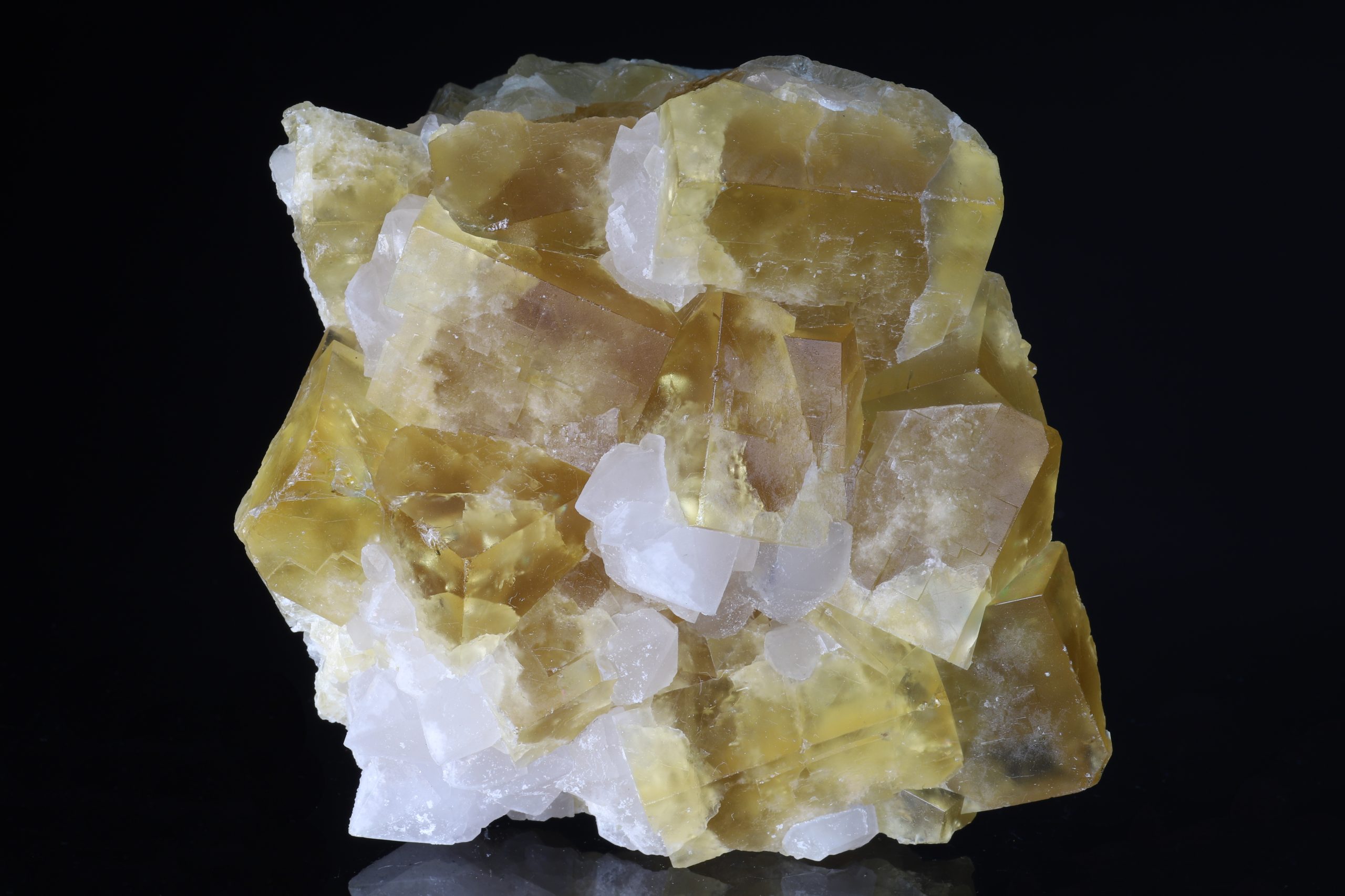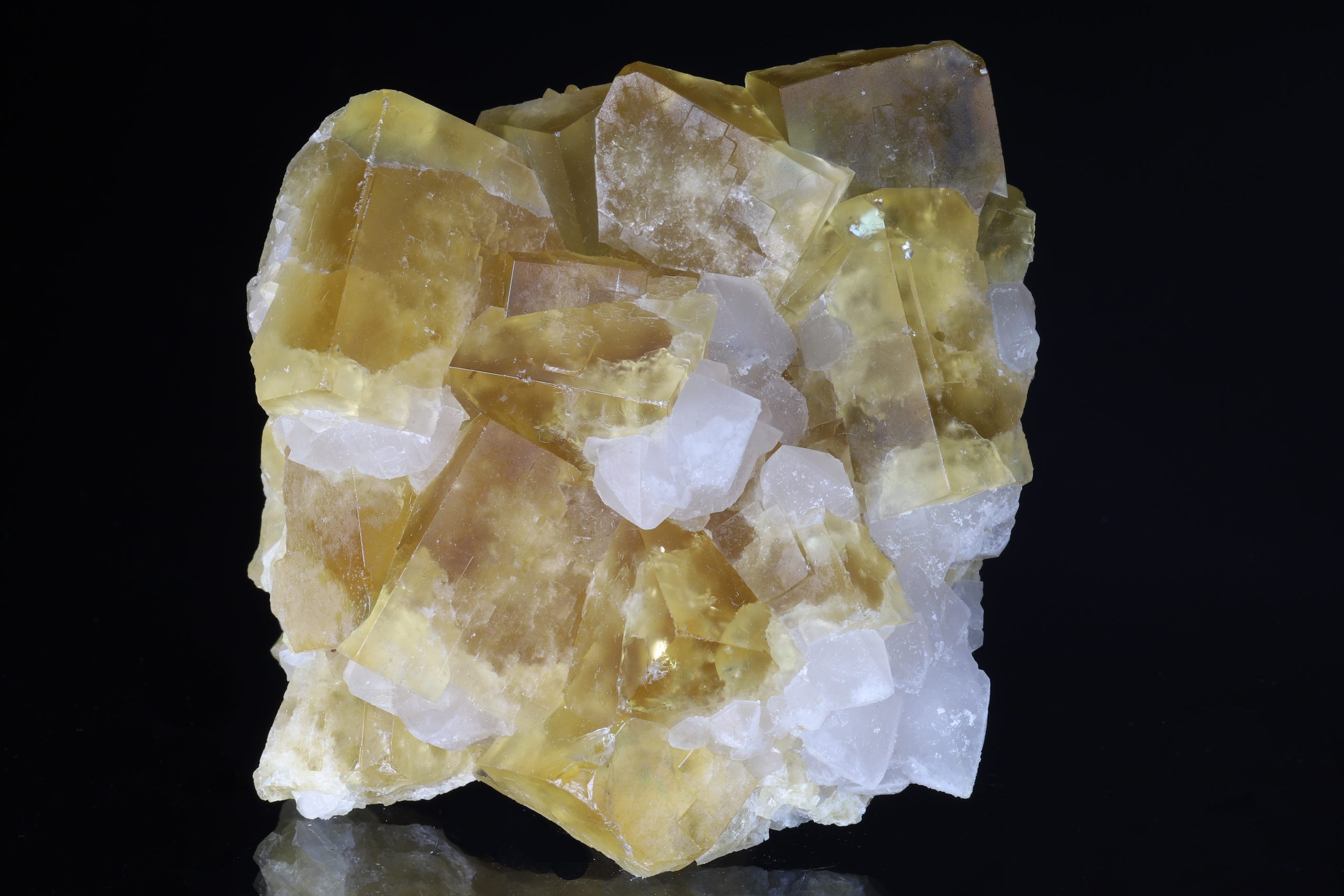 Elegantní drúza až 33 mm velkých krychlových krystalů krásně žlutého fluoritu s krystaly bílého křemene. Velmi reprezentativní vzorek fluoritu z marockého naleziště Aouli.