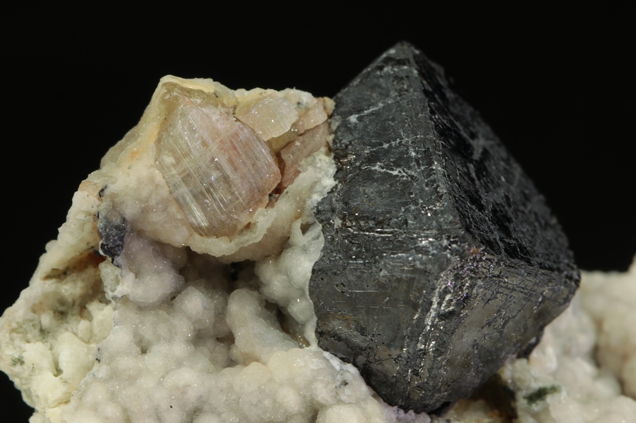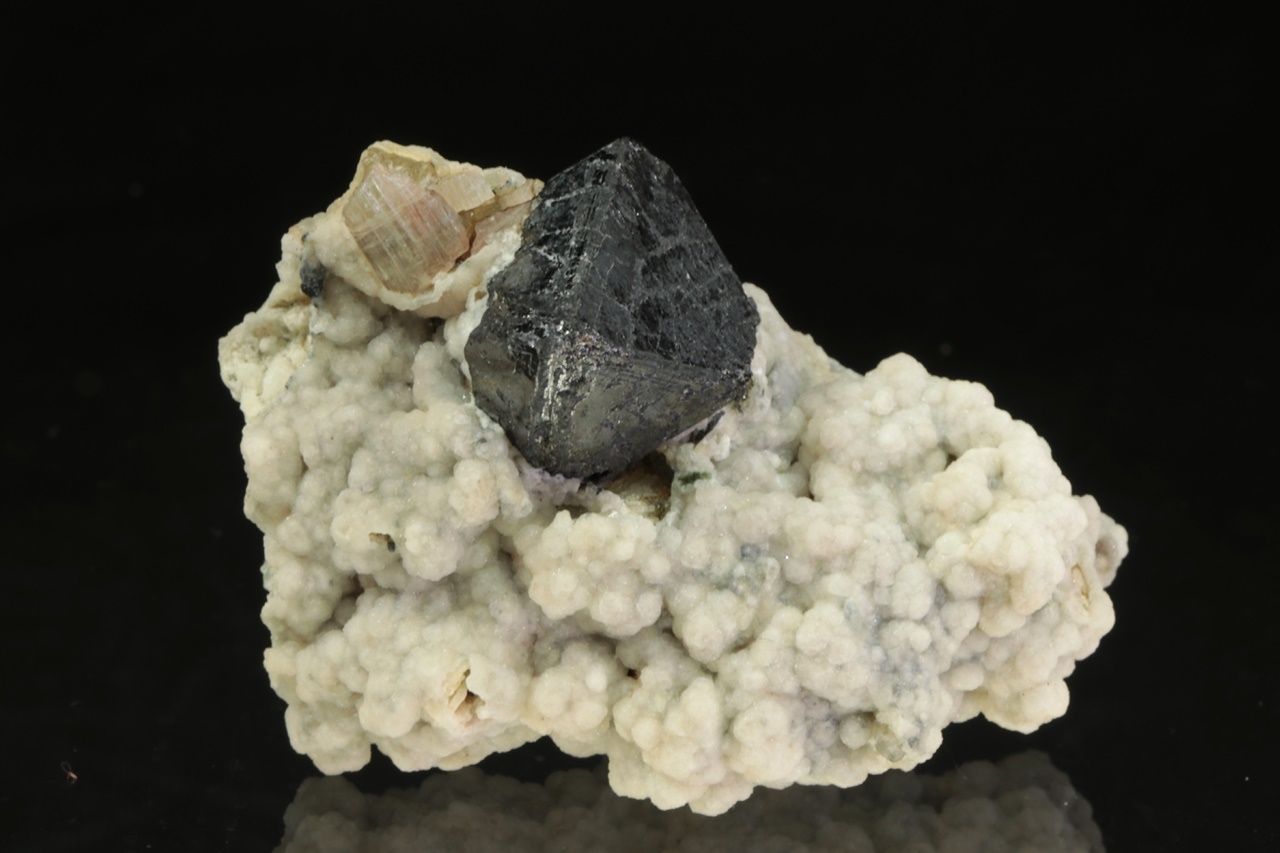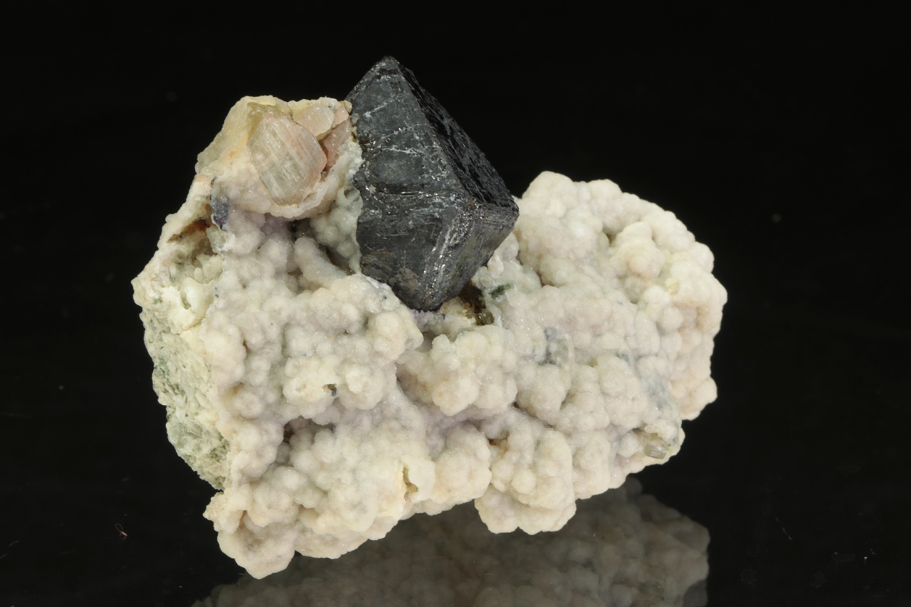 Dva centimetry velký oktaedr magnetitu s béžovým apatitem (7 mm velkým) s výrazným prismatickým rýhováním zarostlé v hroznovitém bílém kalcitu.