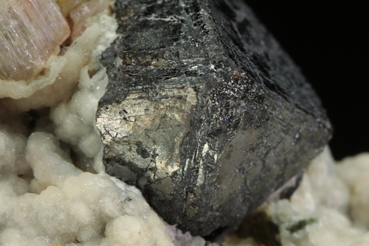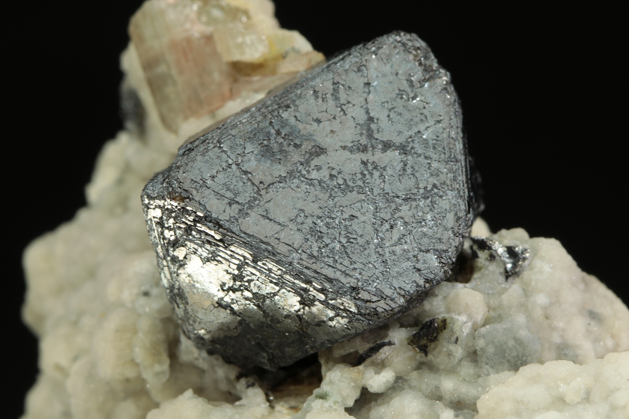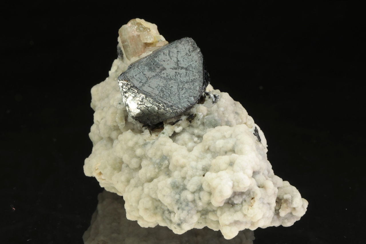 Dva centimetry velký oktaedr magnetitu s béžovým apatitem (7 mm velkým) s výrazným prismatickým rýhováním zarostlé v hroznovitém bílém kalcitu.