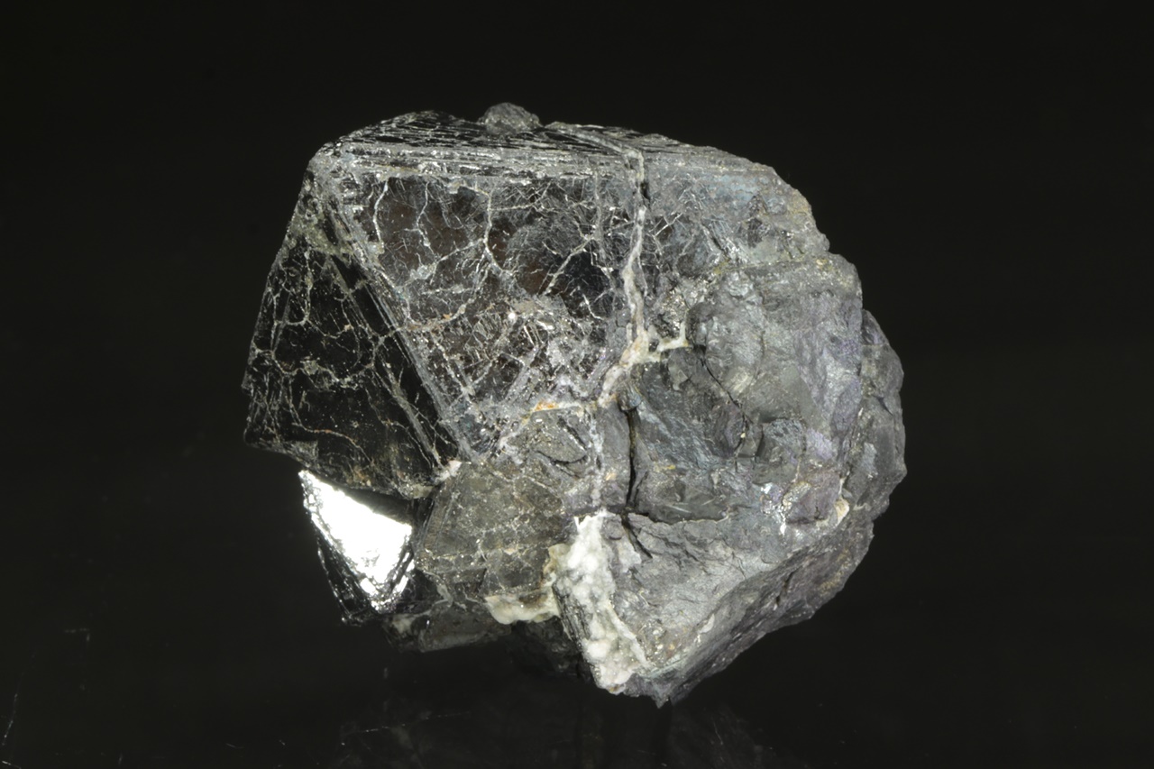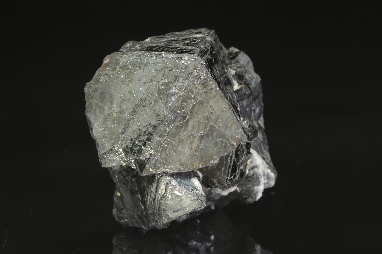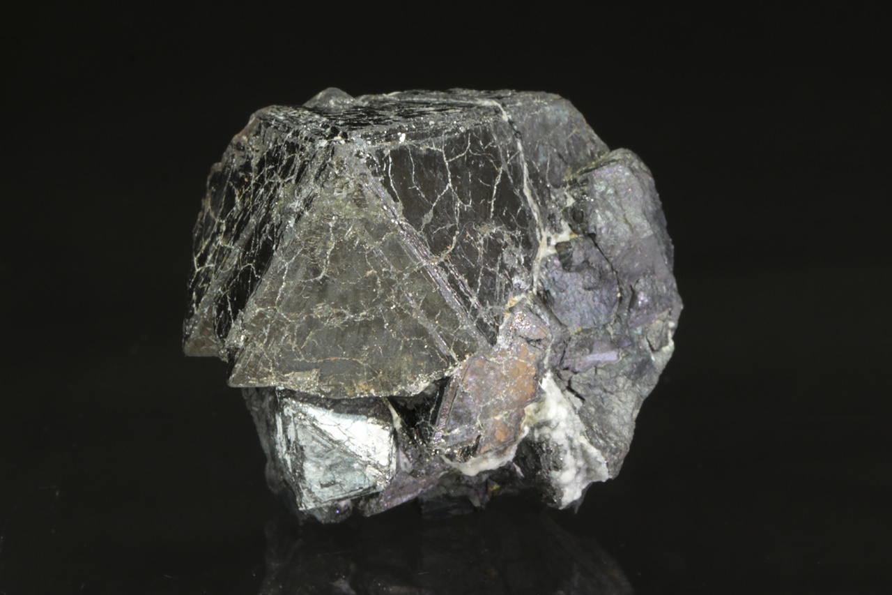 Tři a půl centimetru velký, lesklý krystal magnetitu srůstající s menšími krystaly.