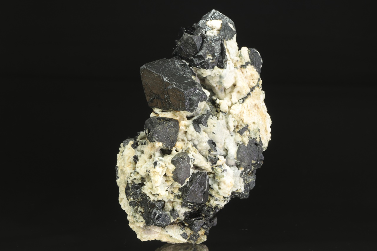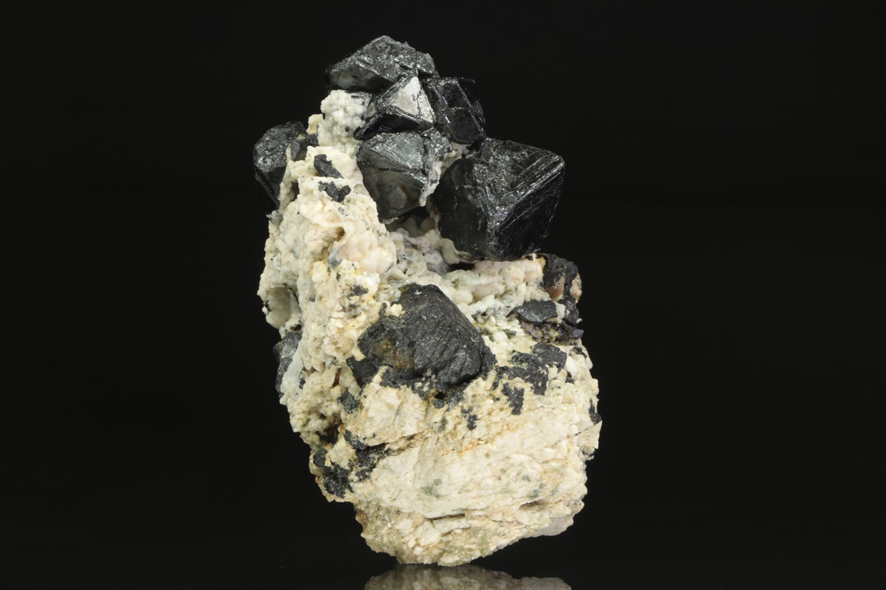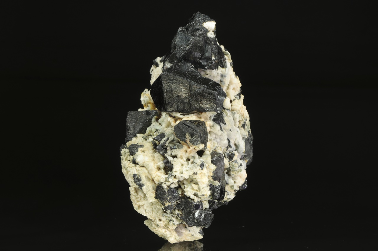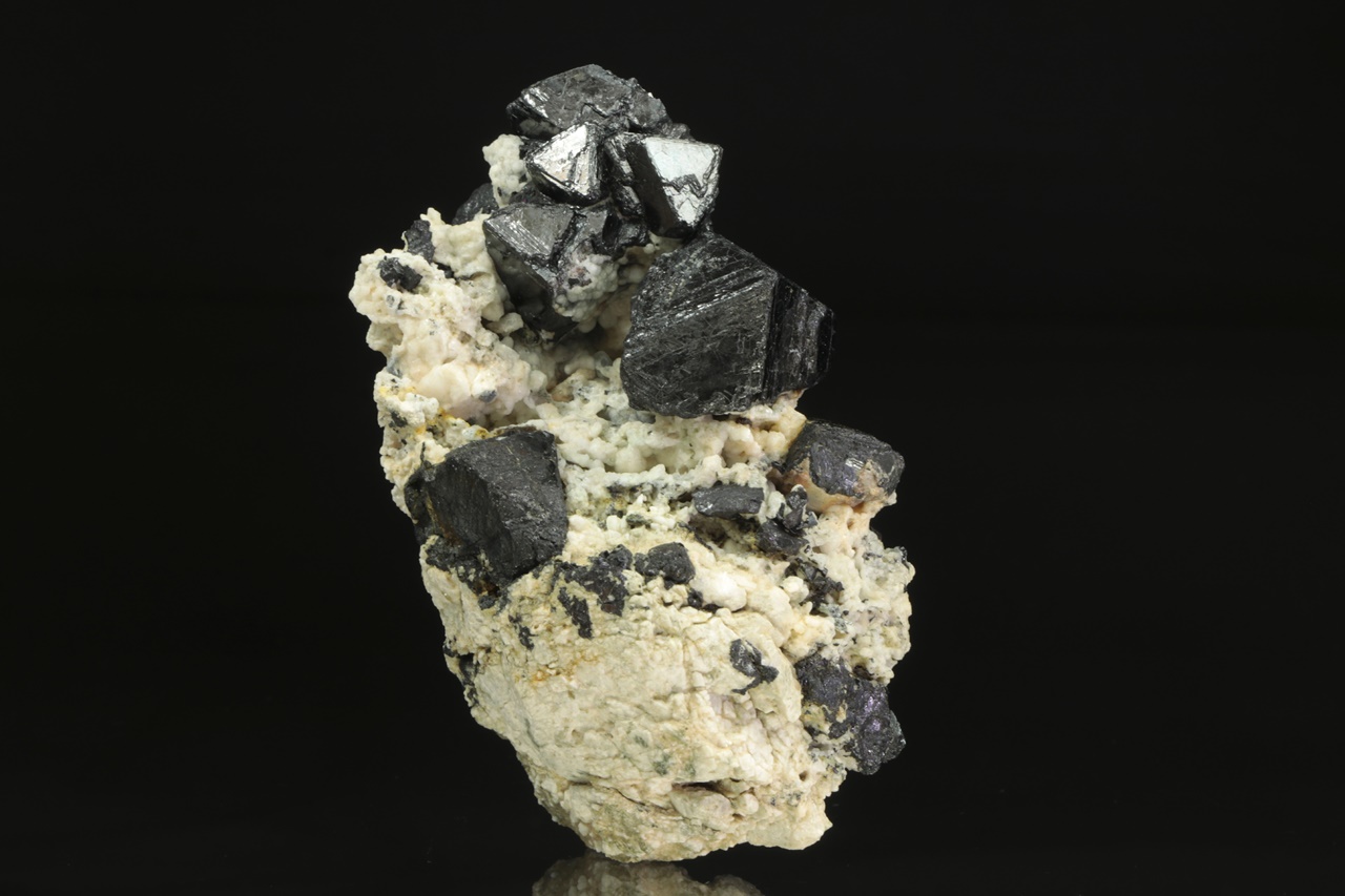 Bohatý vzorek oktaedrických krystalů lesklého magnetitu v živcové matrix. Největší krystal je 3 cm velký.