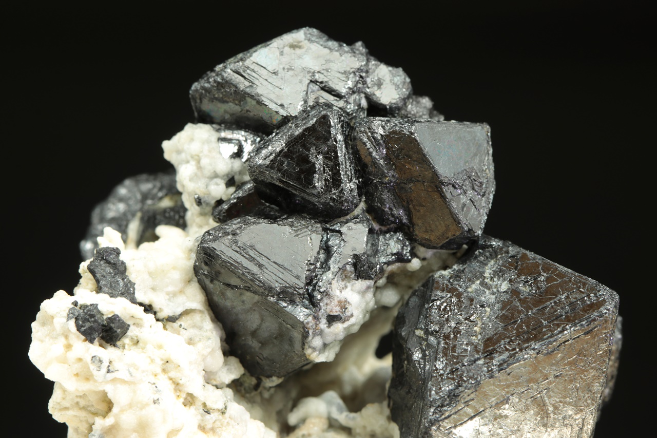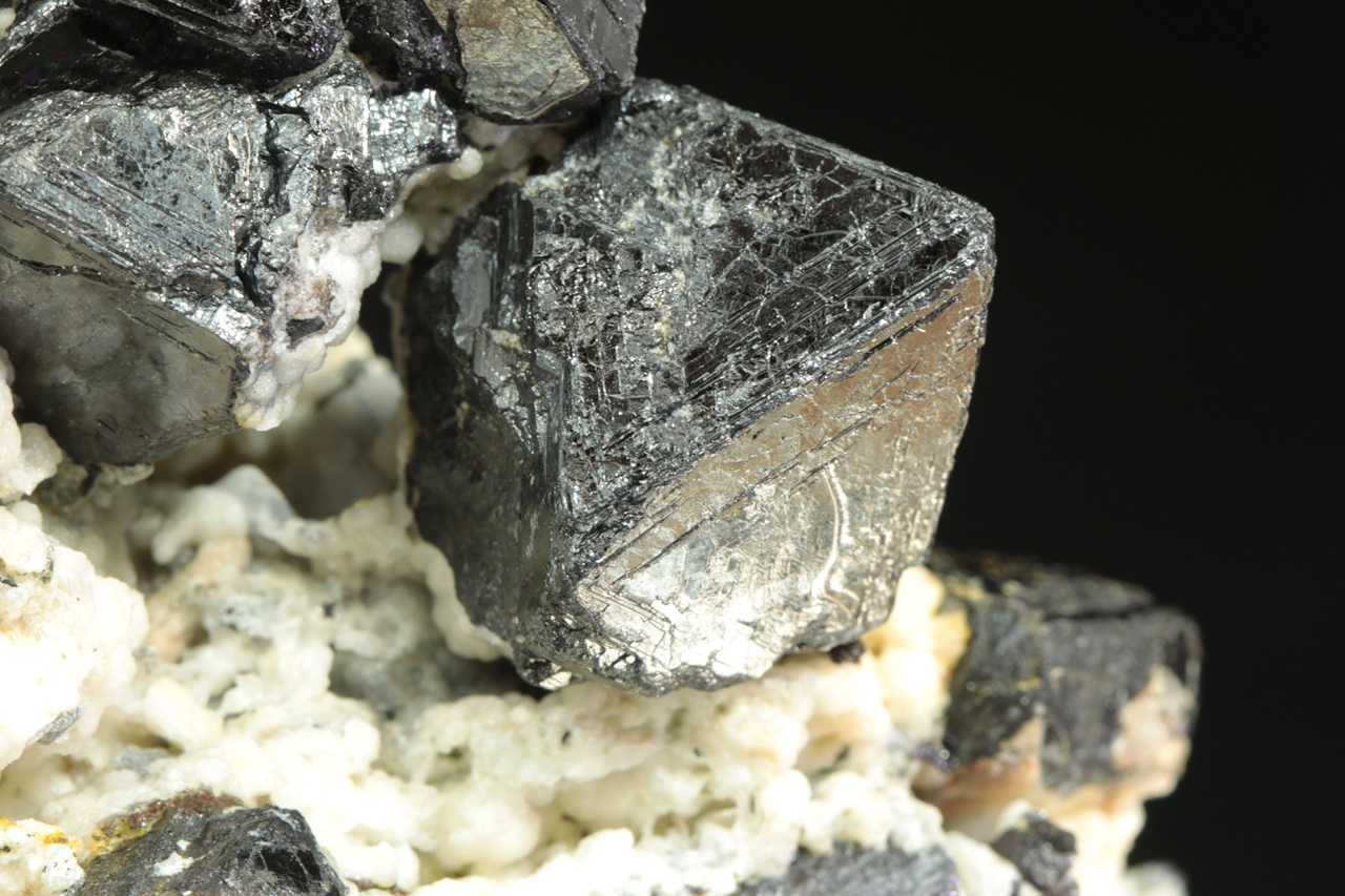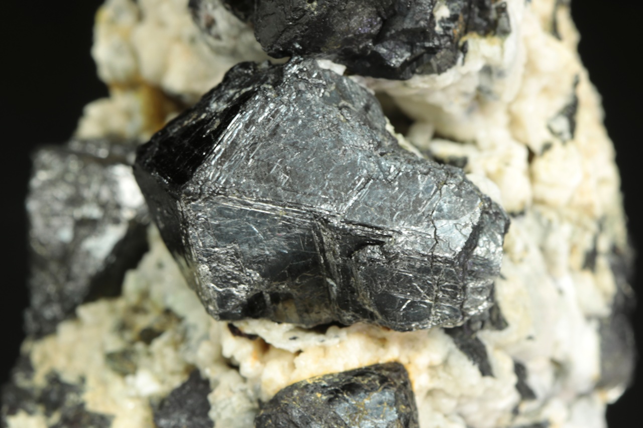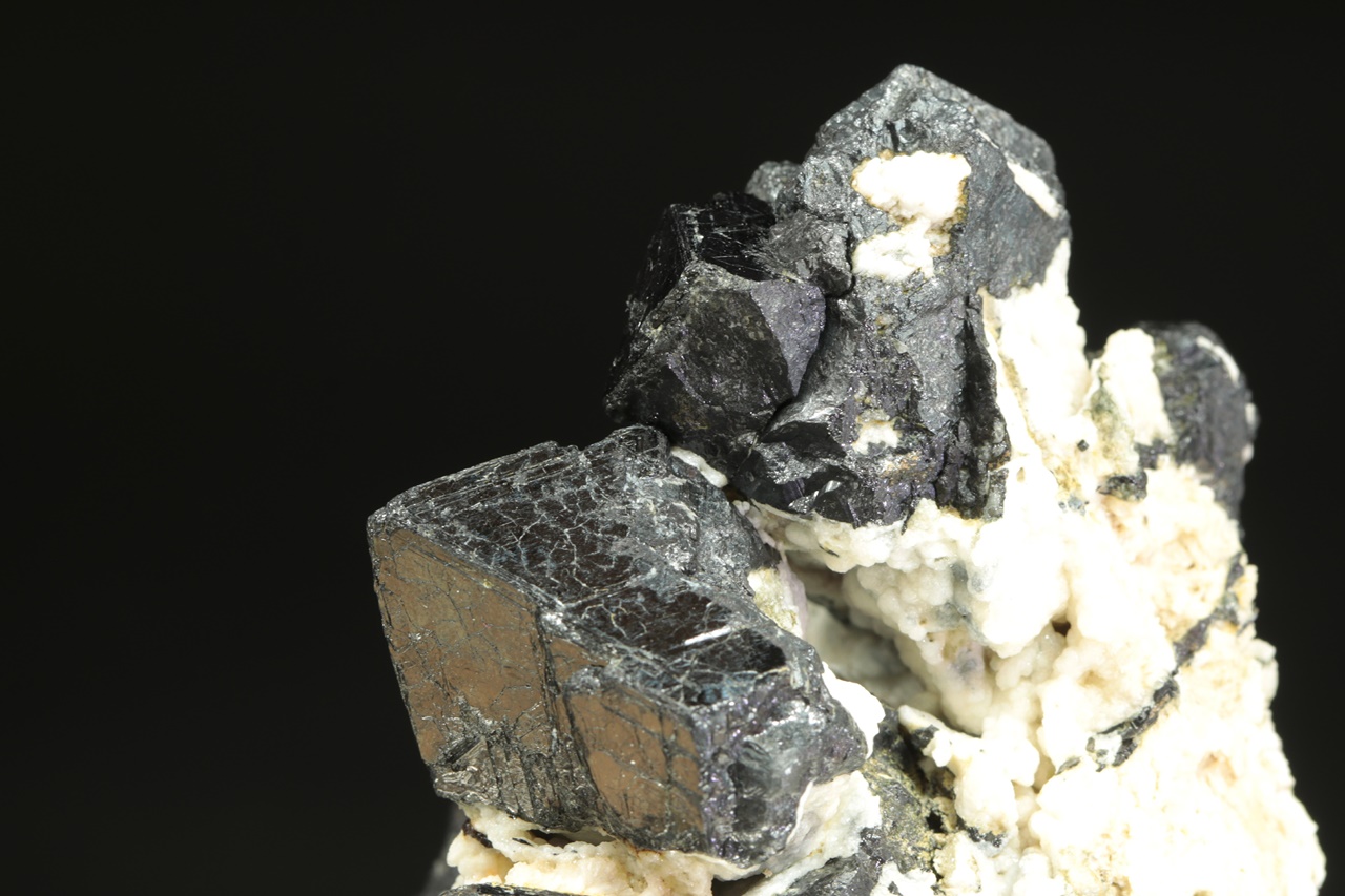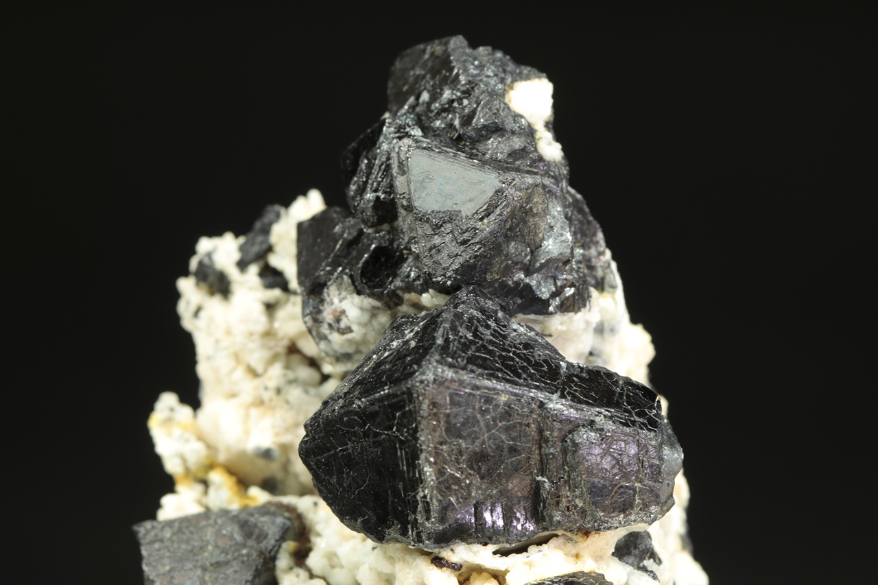 Bohatý vzorek oktaedrických krystalů lesklého magnetitu v živcové matrix. Největší krystal je 3 cm velký.
