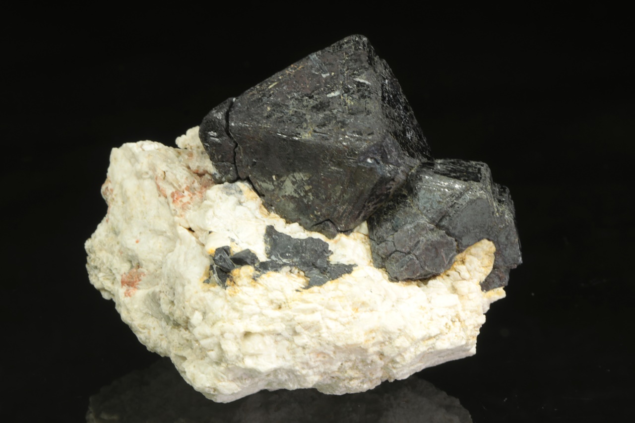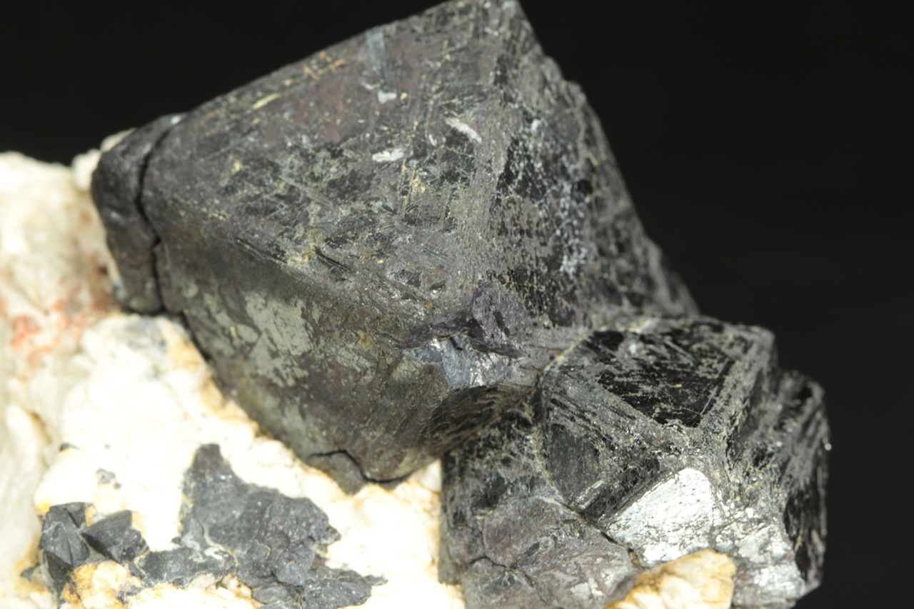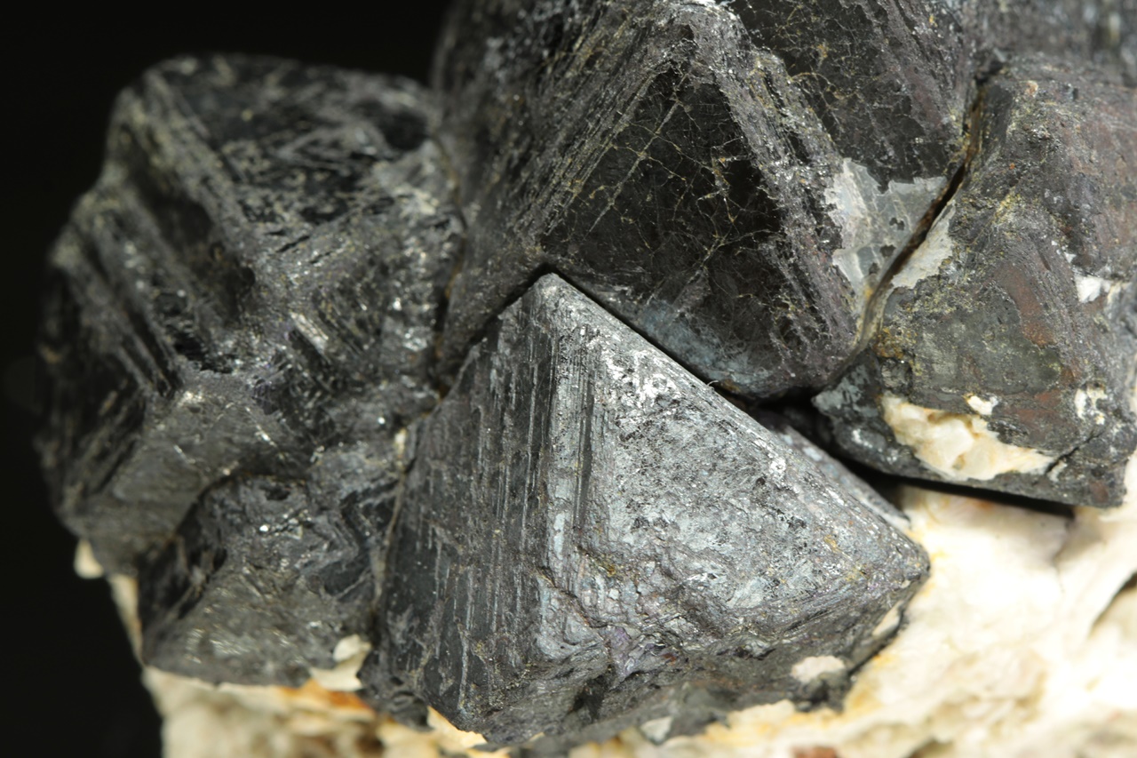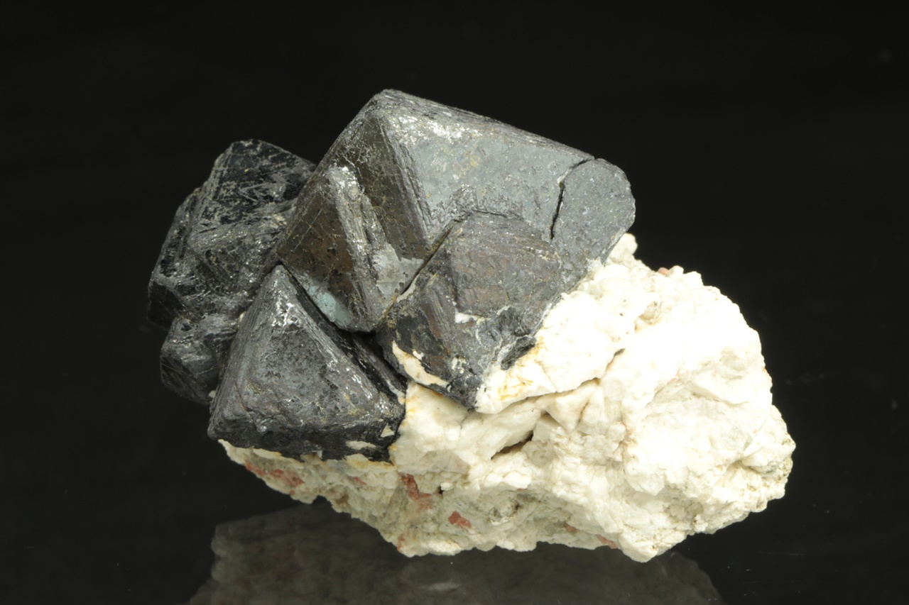 Srostlice oktaedrických krystalů magnetitu na bílé živcové podložce. Největší krystal je 3 cm velký.