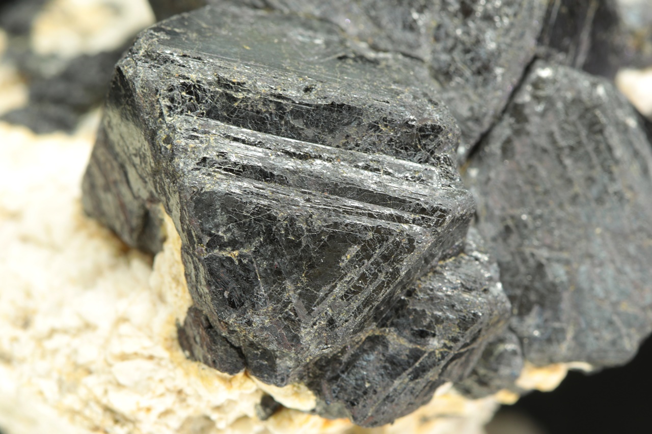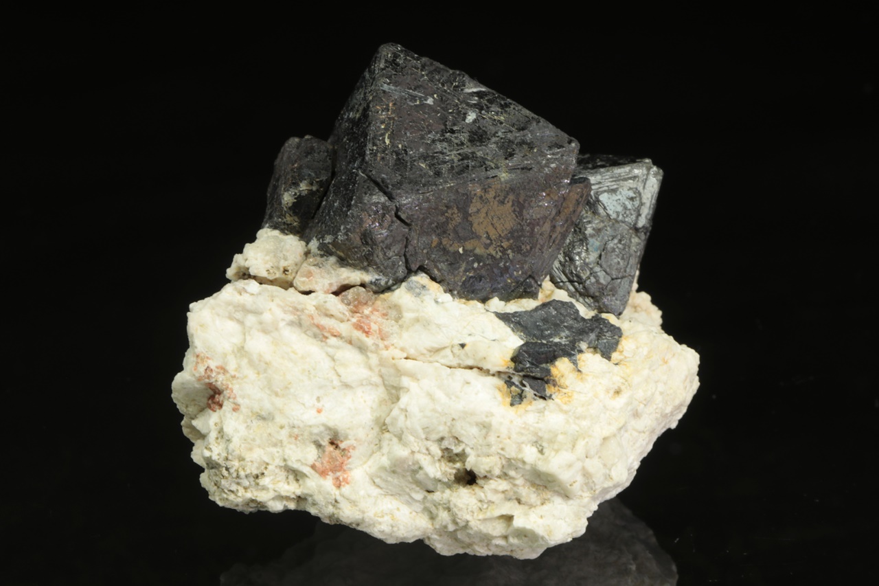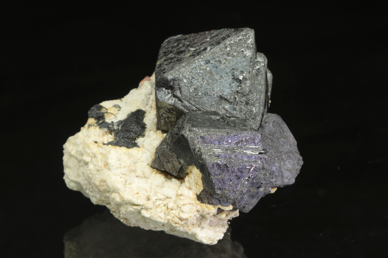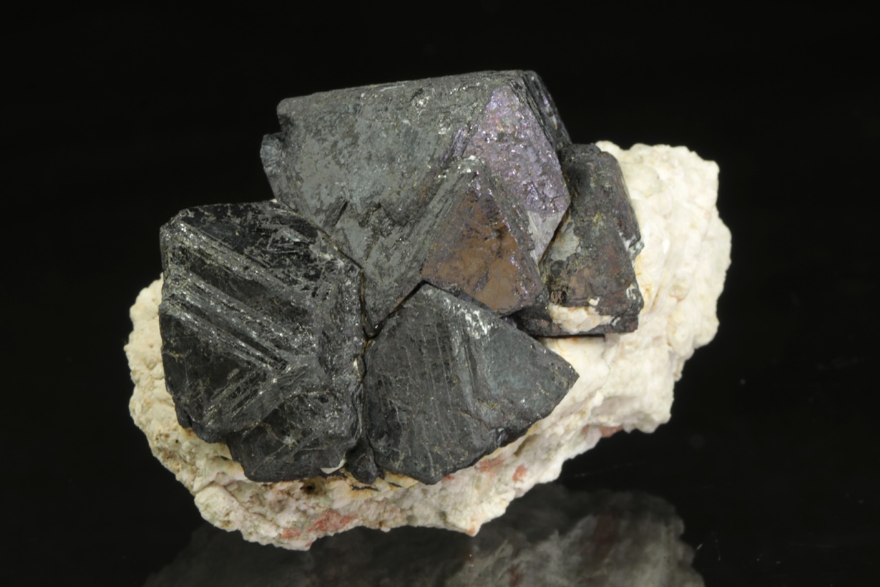 Srostlice oktaedrických krystalů magnetitu na bílé živcové podložce. Největší krystal je 3 cm velký.