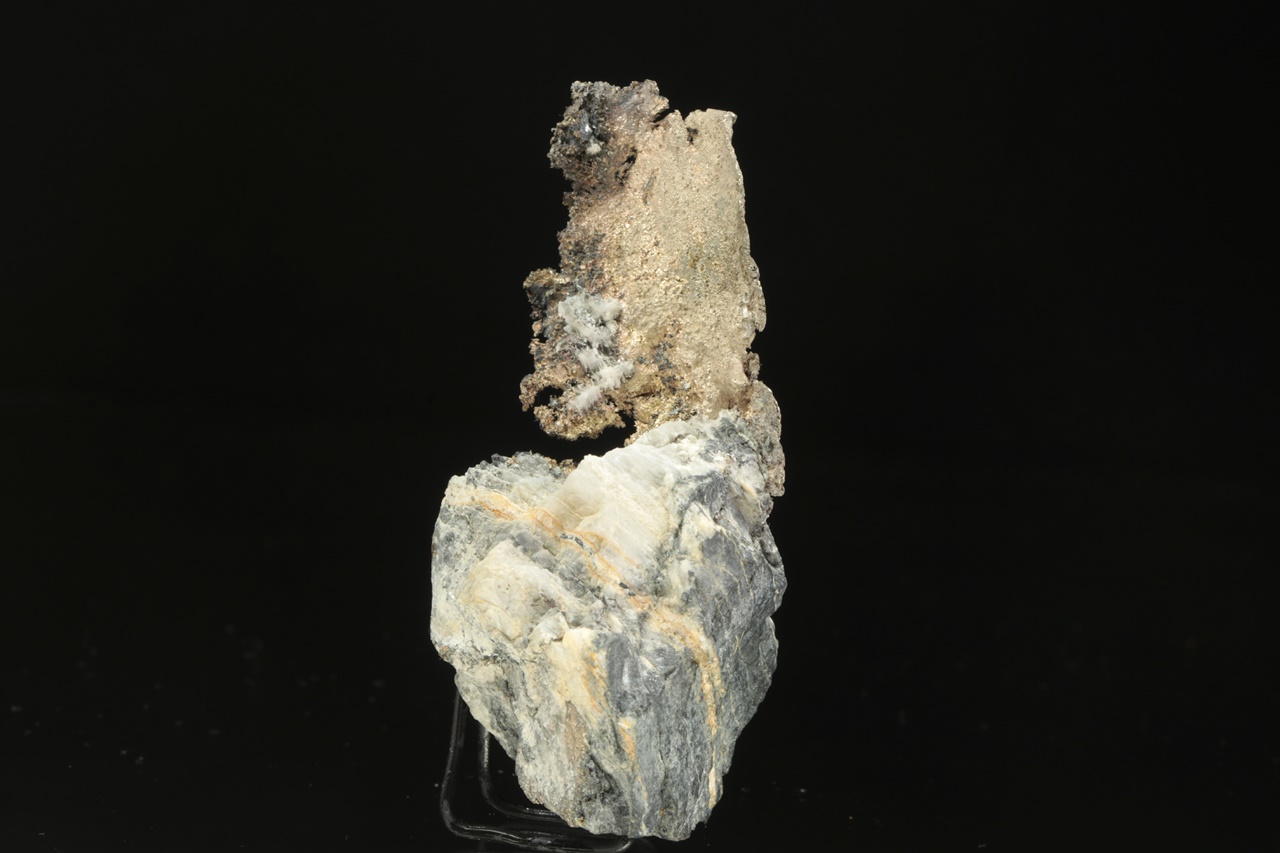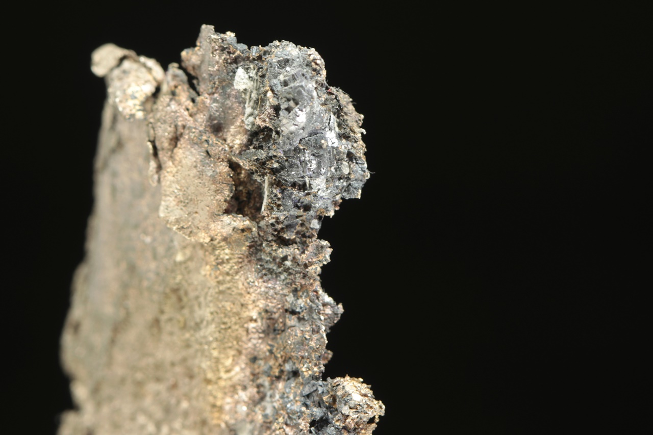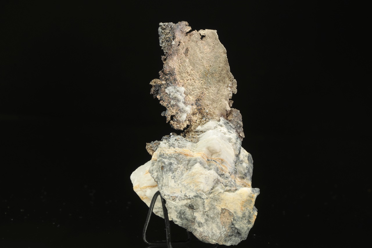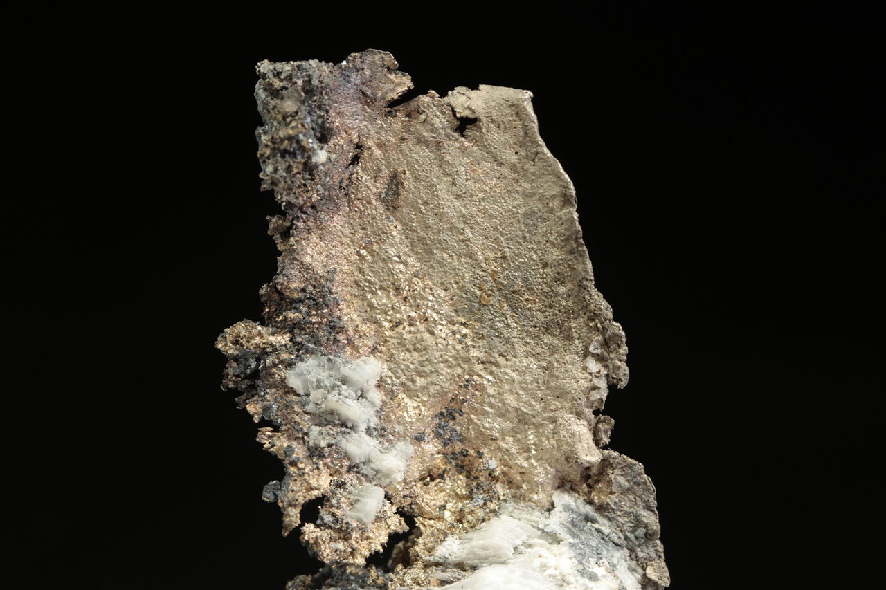 Plech přírodního stříbra vystupující z karbonátové podložky s černým matným galenitem. Rozměry plechu jsou 4 × 3 cm.