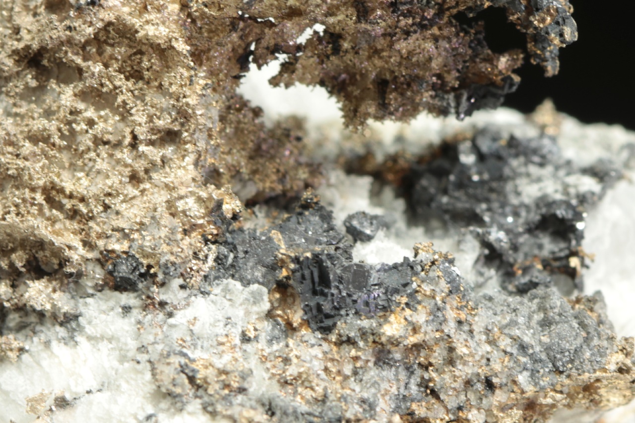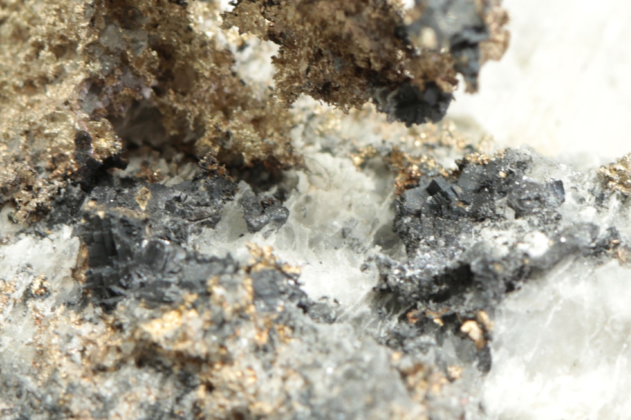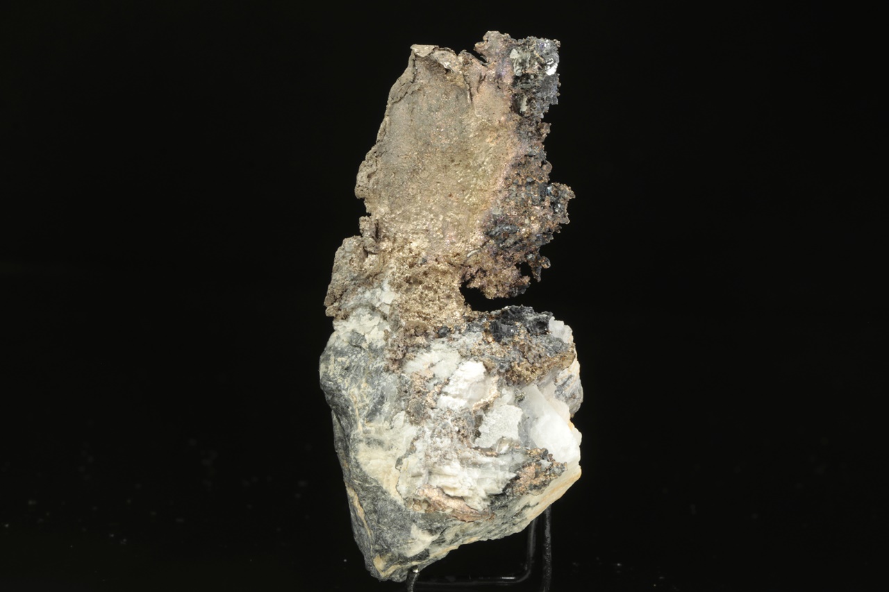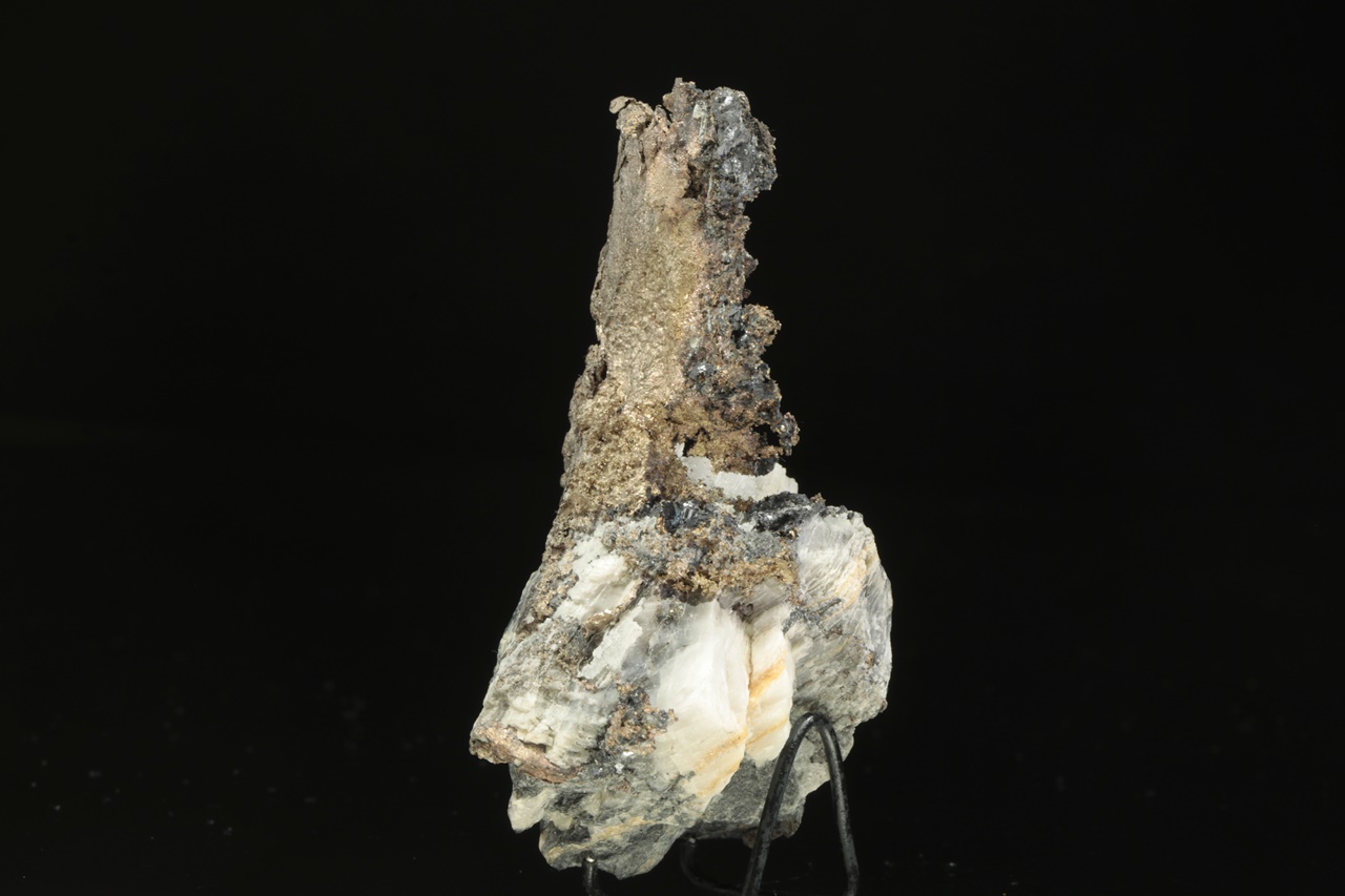 Plech přírodního stříbra vystupující z karbonátové podložky s černým matným galenitem. Rozměry plechu jsou 4 × 3 cm.