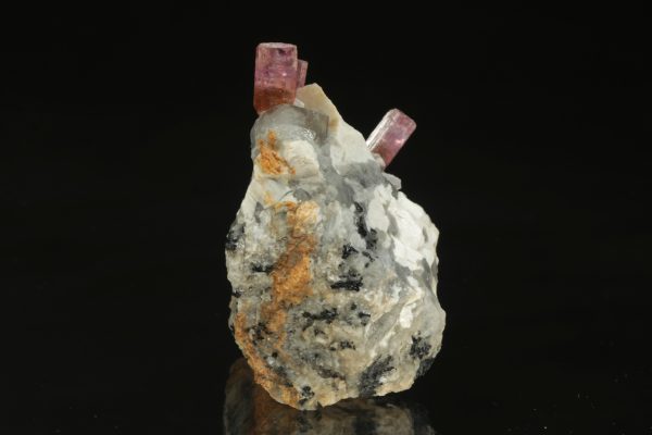Tři krystaly růžového turmalínu na křemeno živcové podložce. Krystaly vystupují zhruba 10 mm nad okolní horninu. Nejmenší krystal je otlačený.