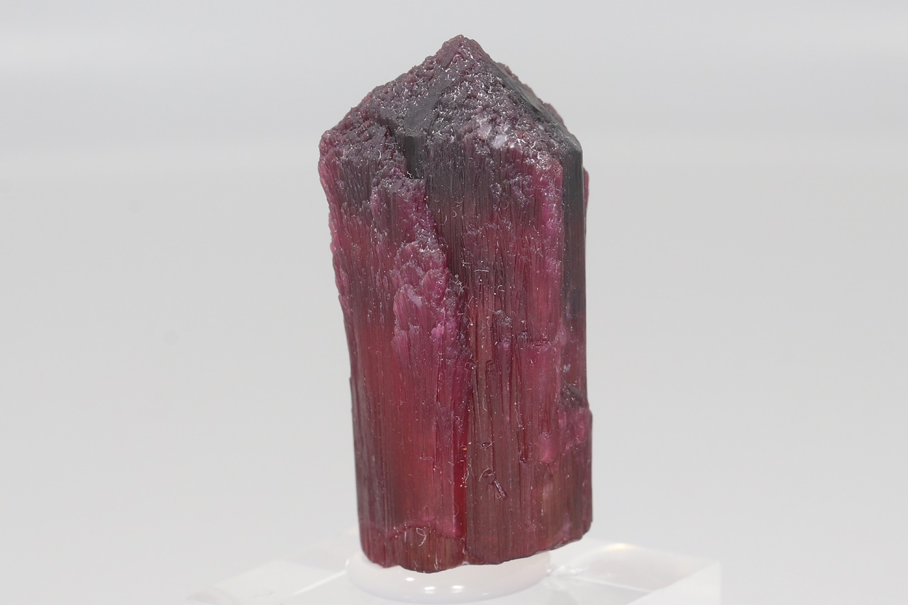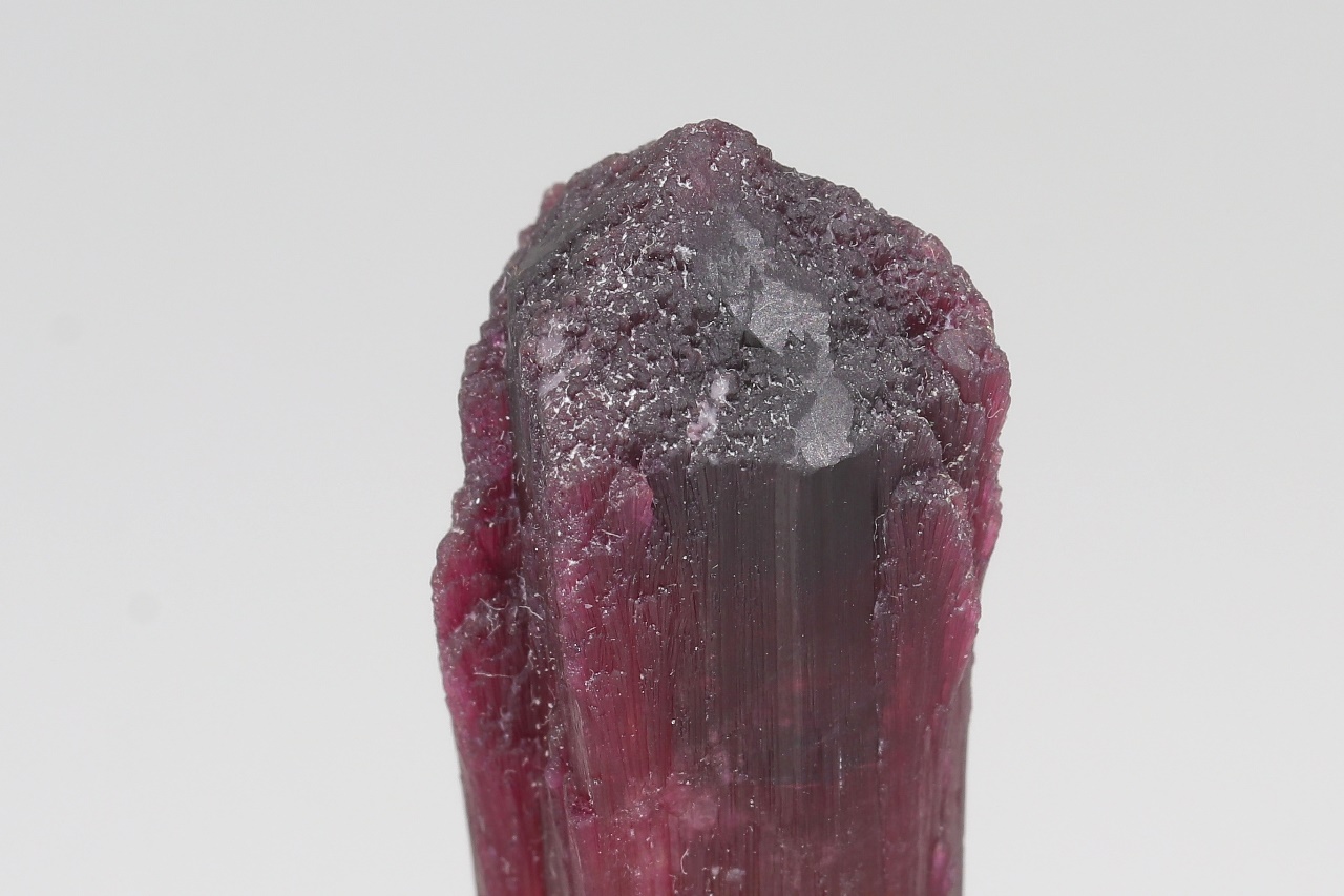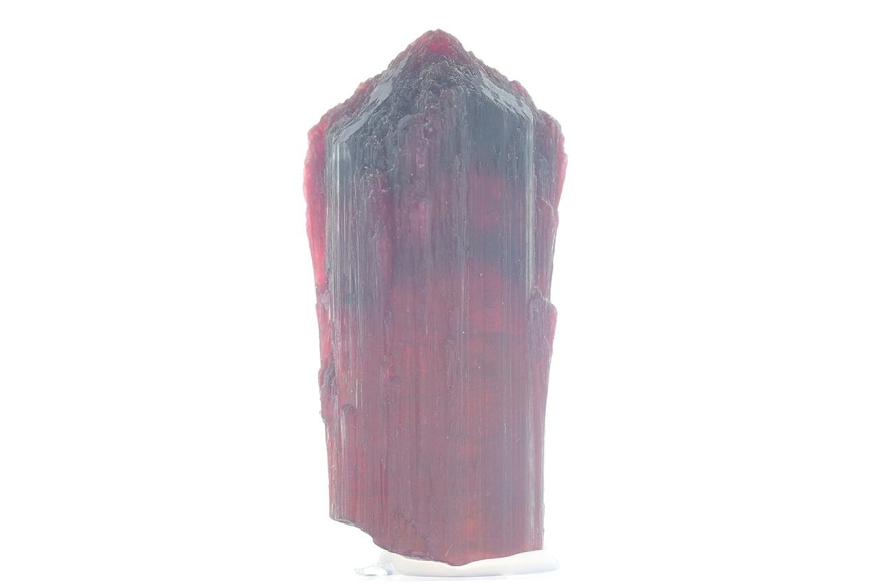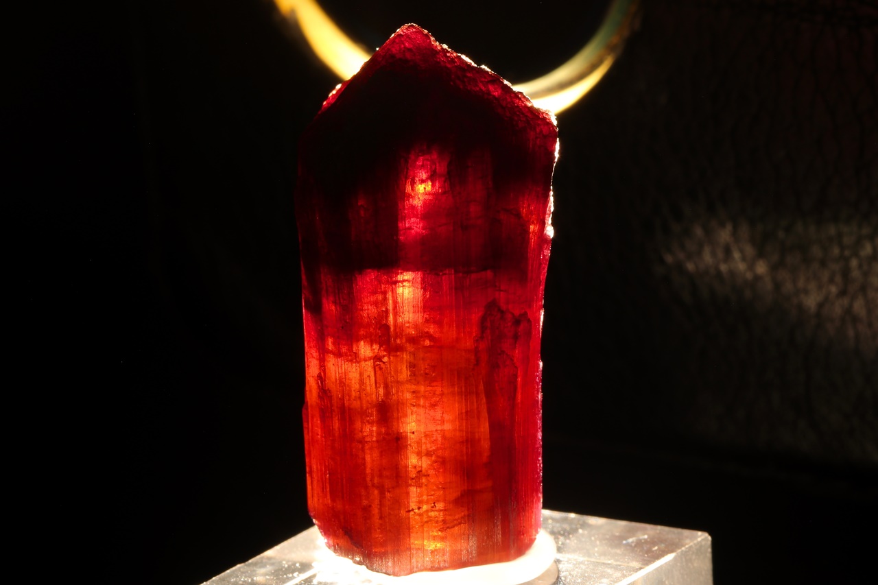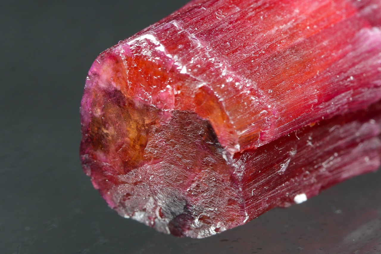 Nádherný krystal zonálního turmalínu, kde ve spodní části je oranžové jádro, které zvenku a ve vrchní části přerůstá intenzivně červený turmalín. Krystal je ze spodní části dohojený.