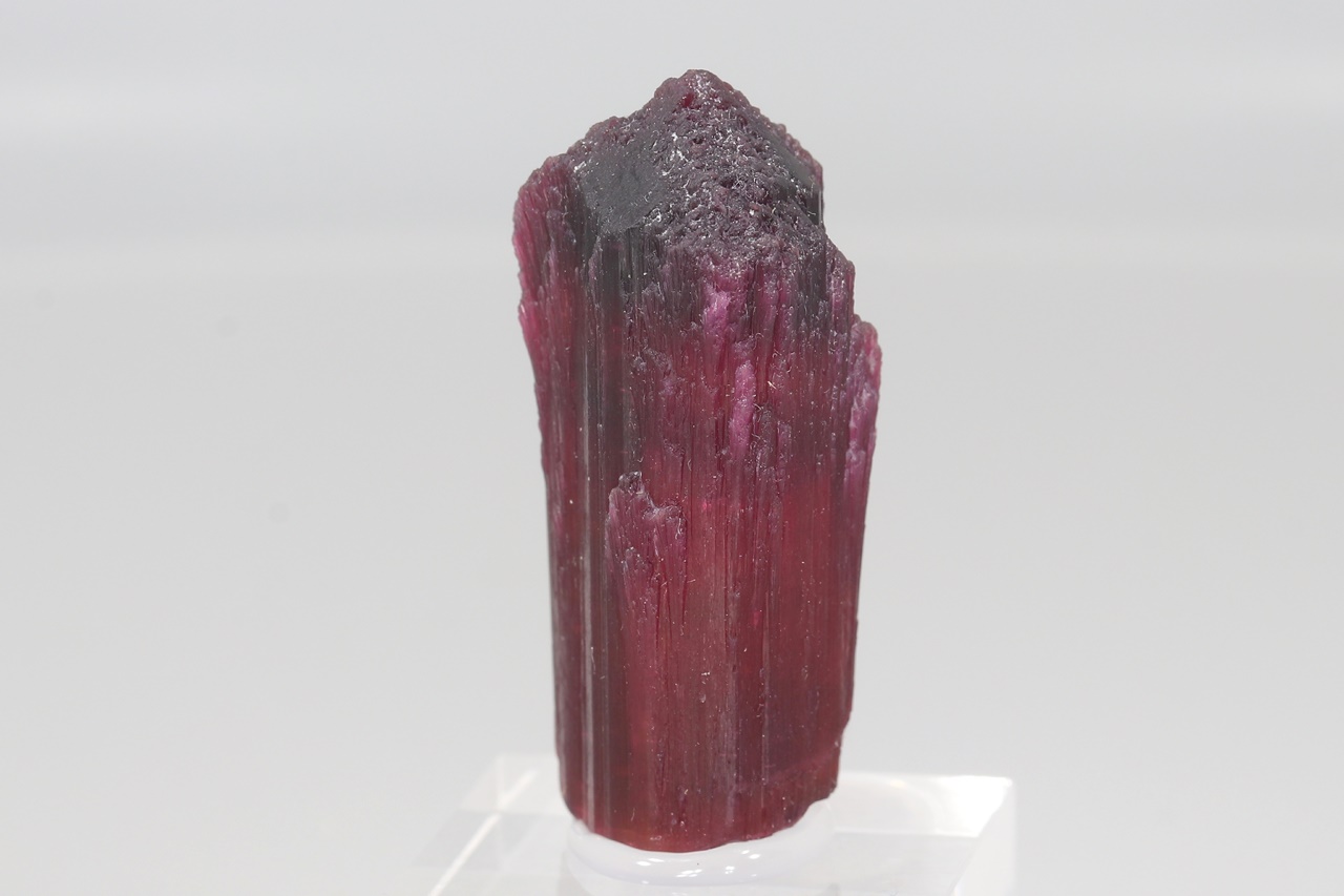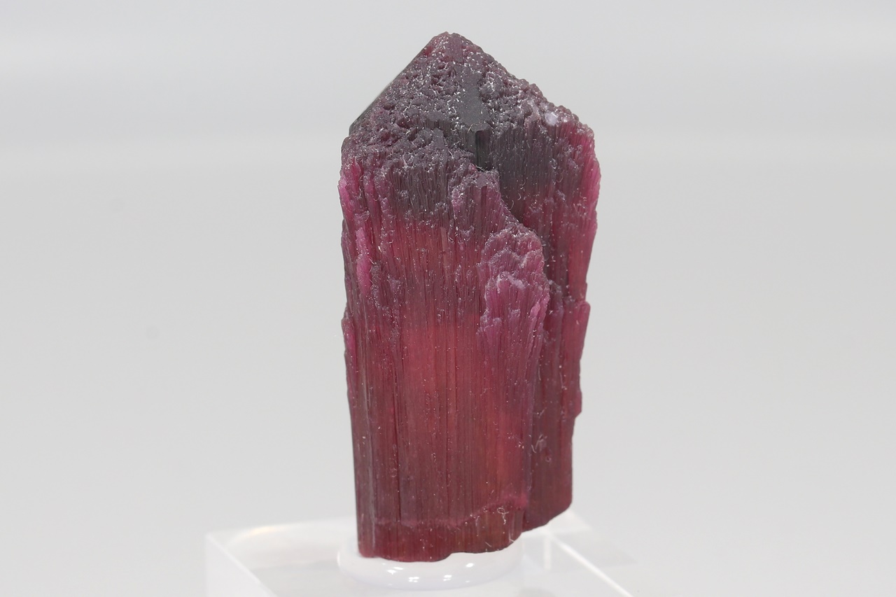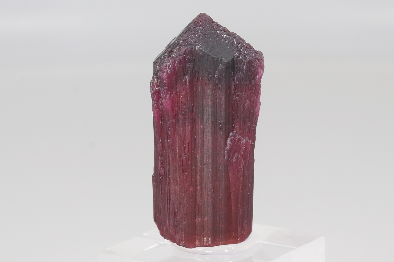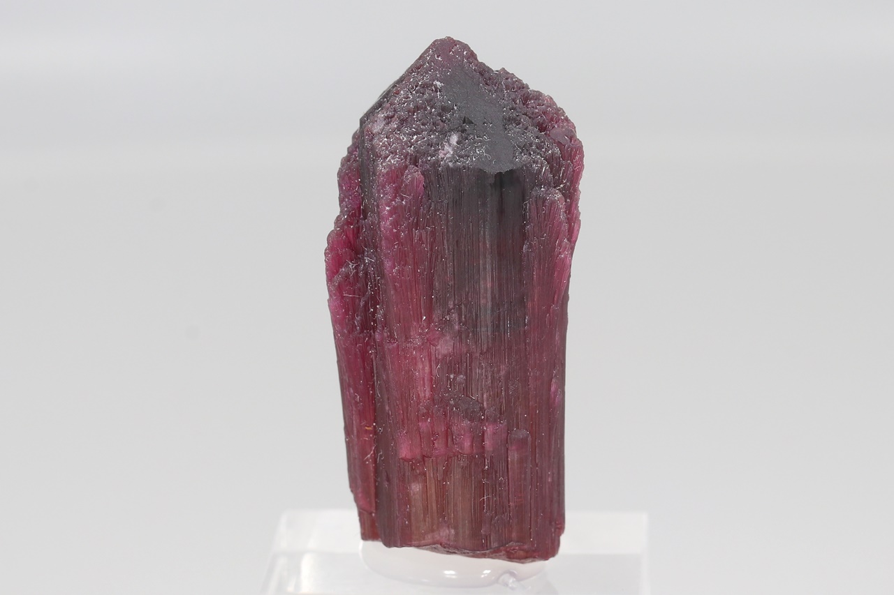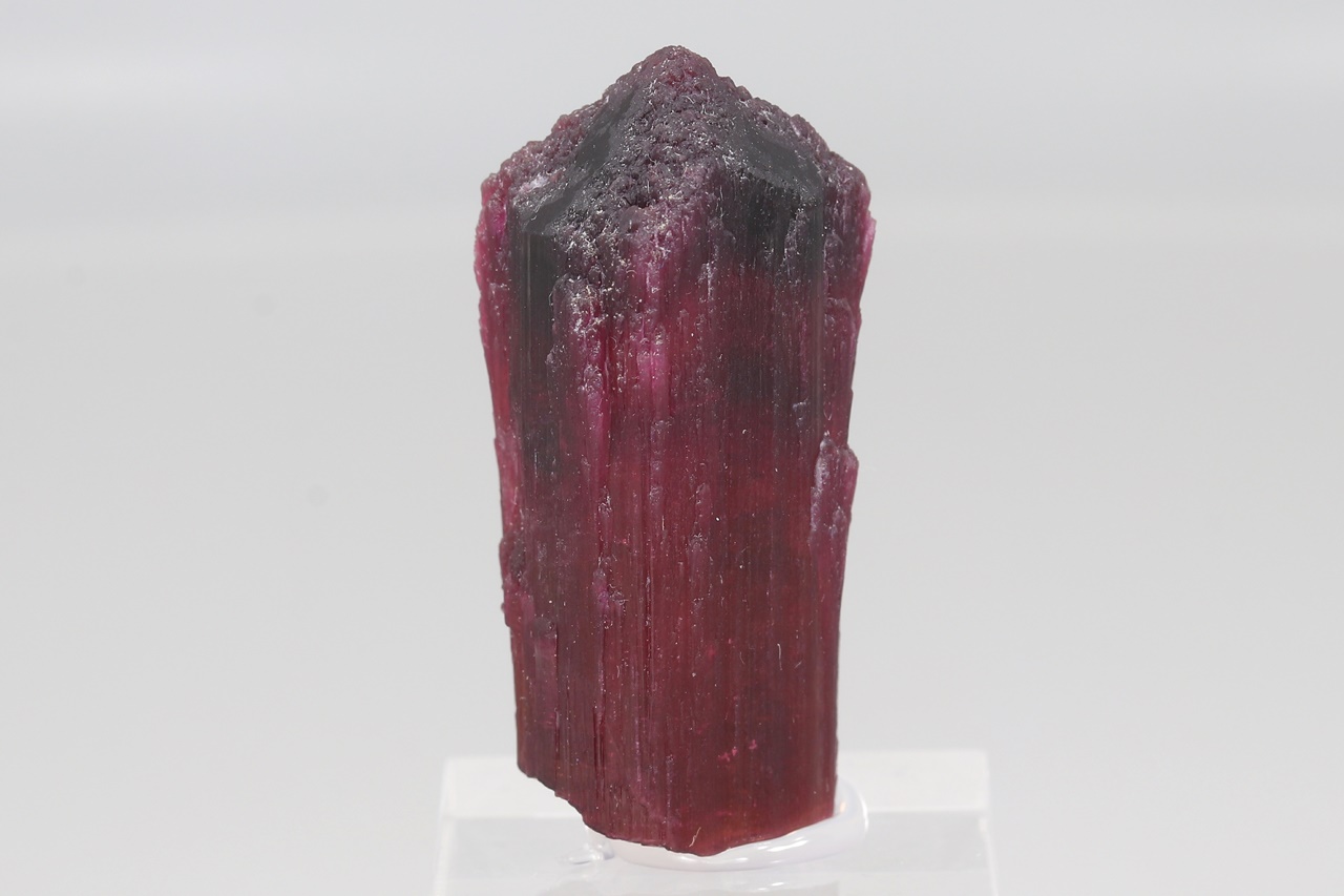 Nádherný krystal zonálního turmalínu, kde ve spodní části je oranžové jádro, které zvenku a ve vrchní části přerůstá intenzivně červený turmalín. Krystal je ze spodní části dohojený.