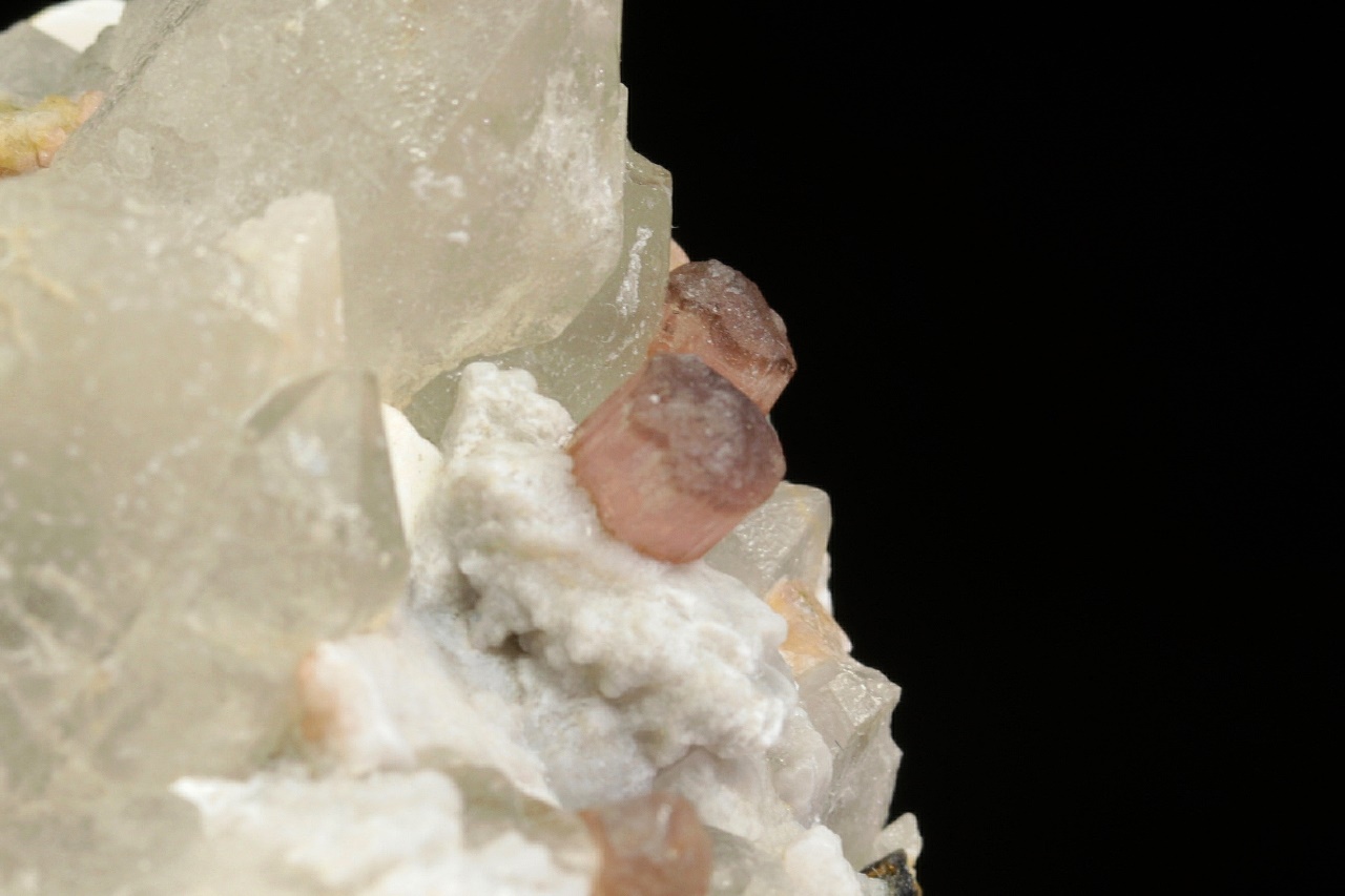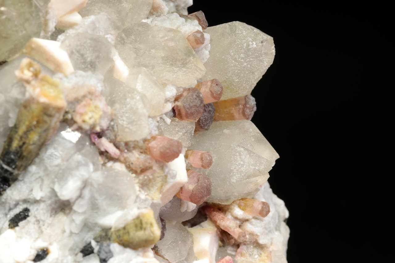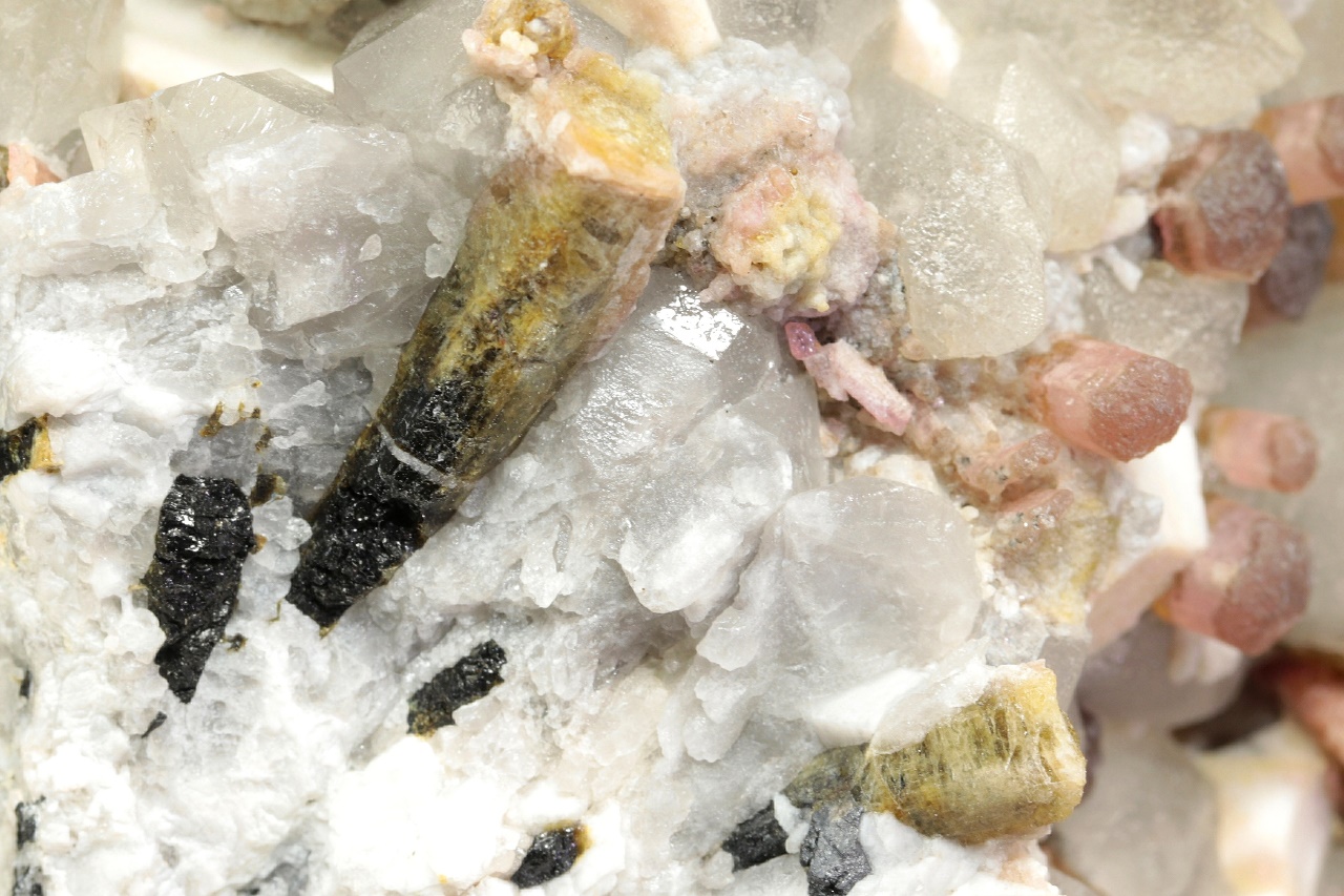 Krystaly barevného turmalínu v odstínech růžové, žluté a zelené roustoucí do dutiny tvořené bílým ortoklasem a šedivým křemenem. Průměr krystalů turmalínu je 3 až 5 mm.