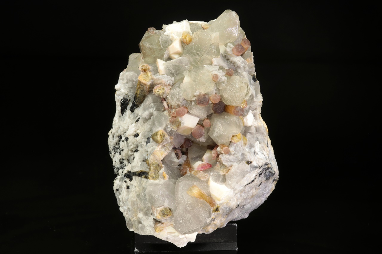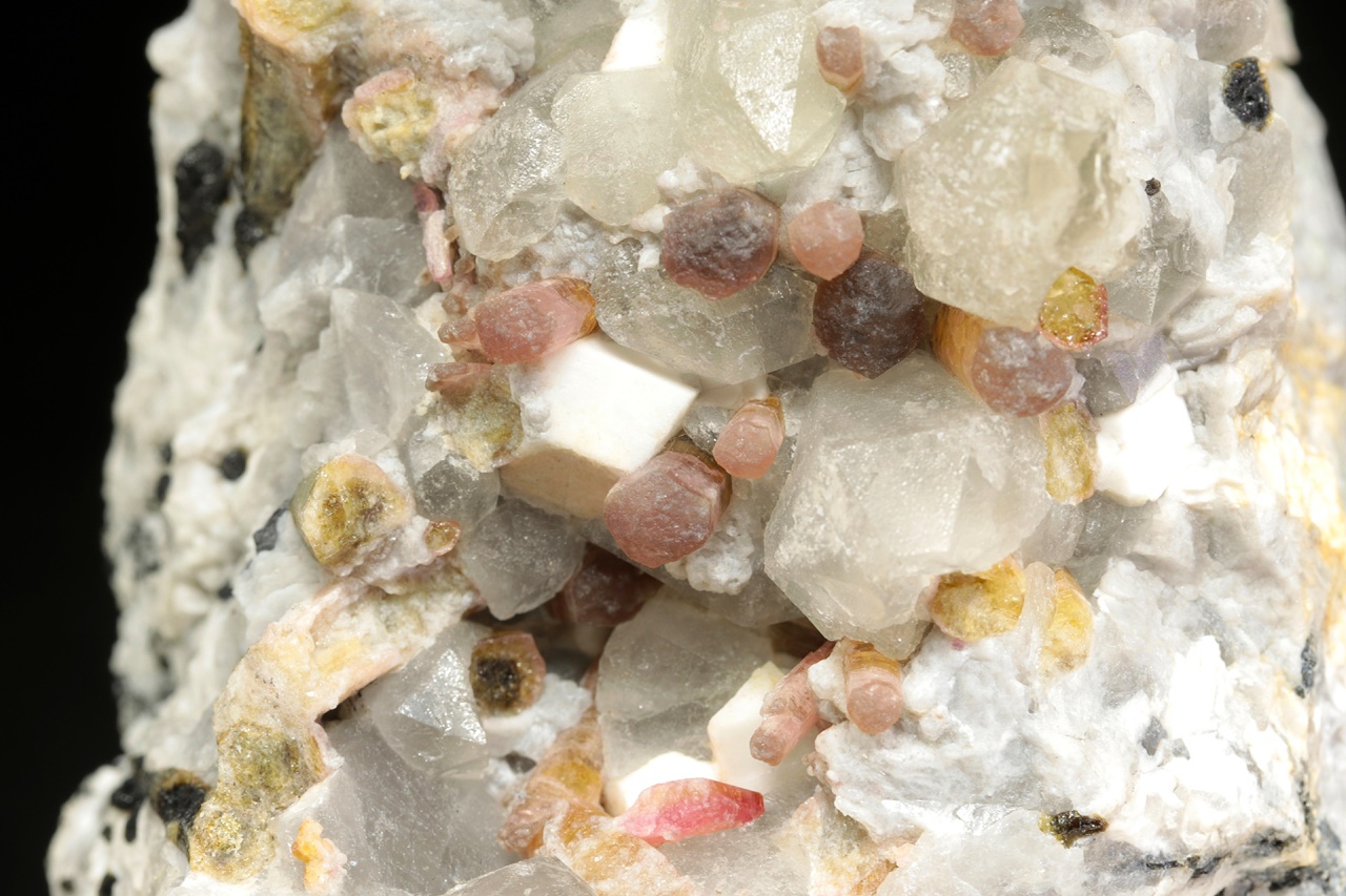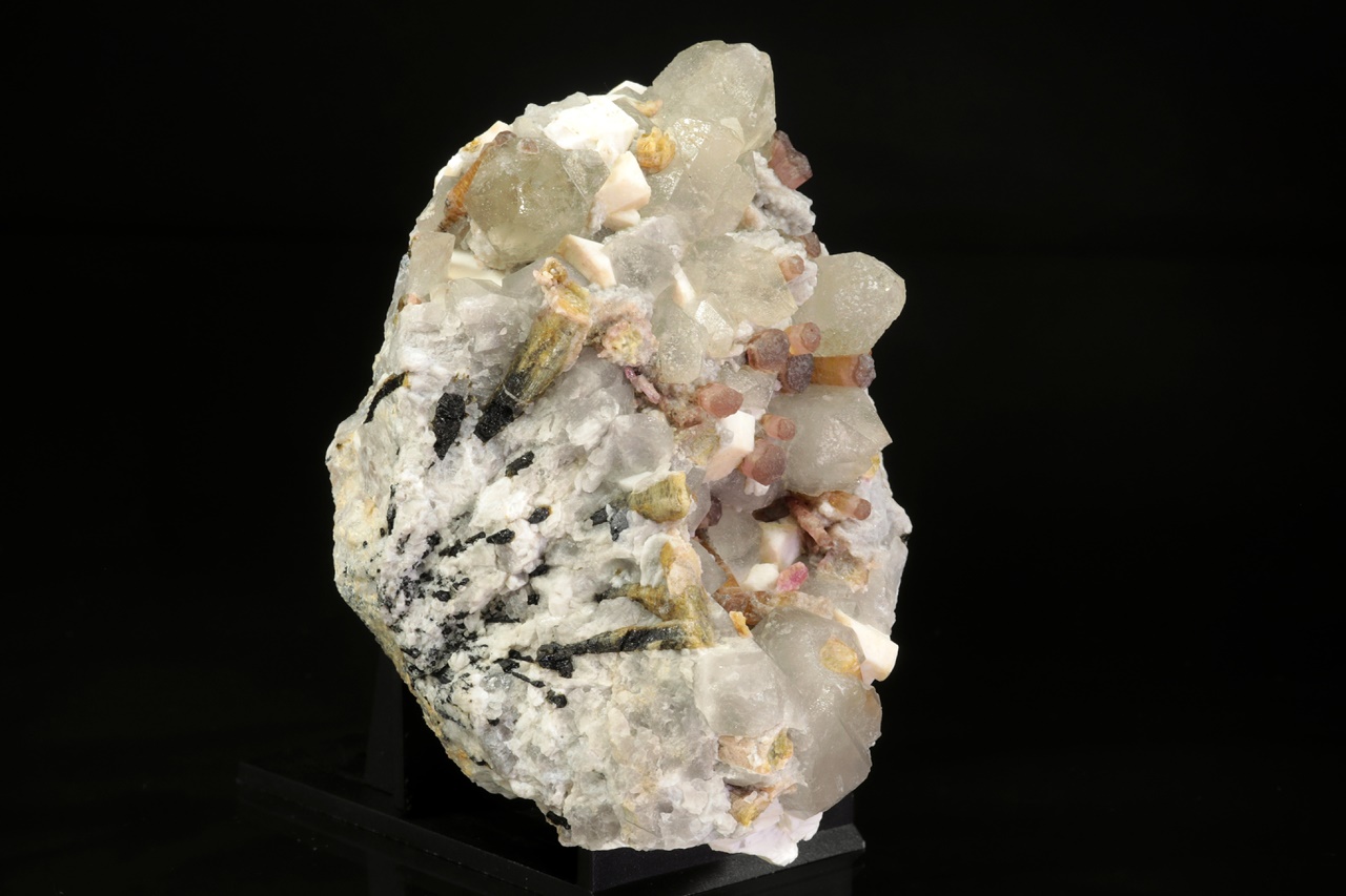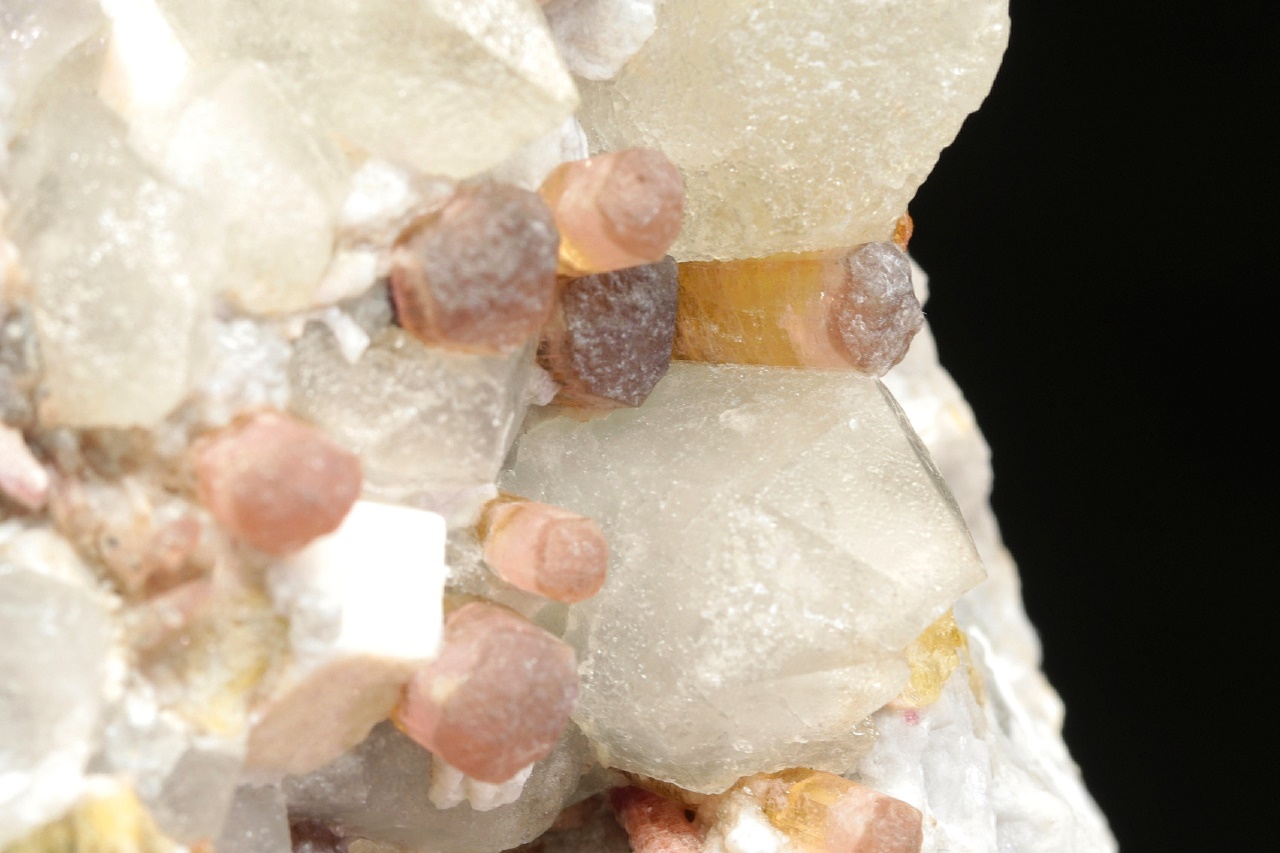 Krystaly barevného turmalínu v odstínech růžové, žluté a zelené roustoucí do dutiny tvořené bílým ortoklasem a šedivým křemenem. Průměr krystalů turmalínu je 3 až 5 mm.