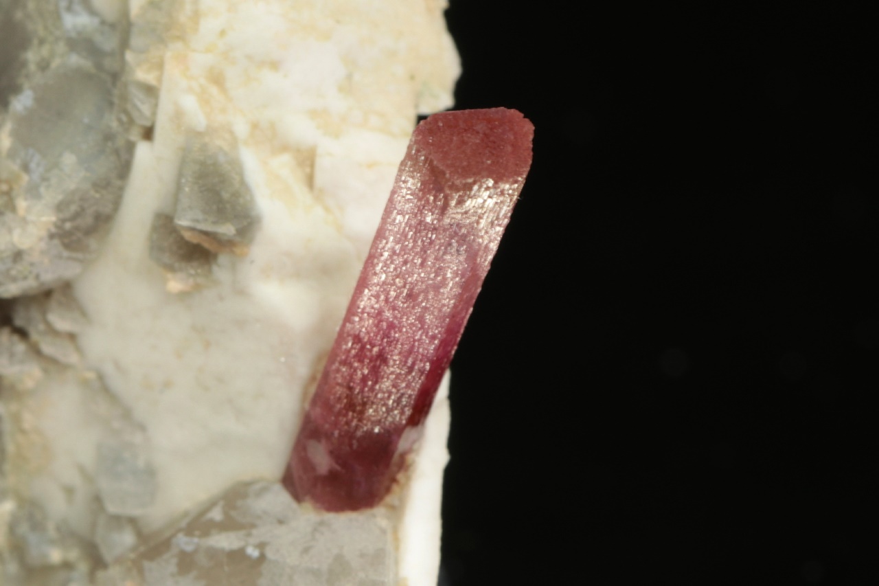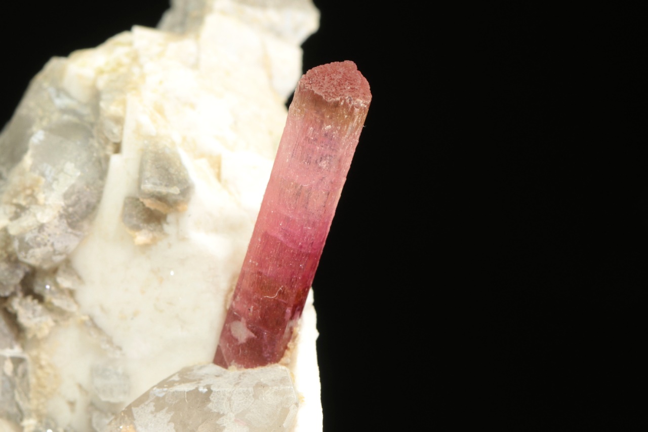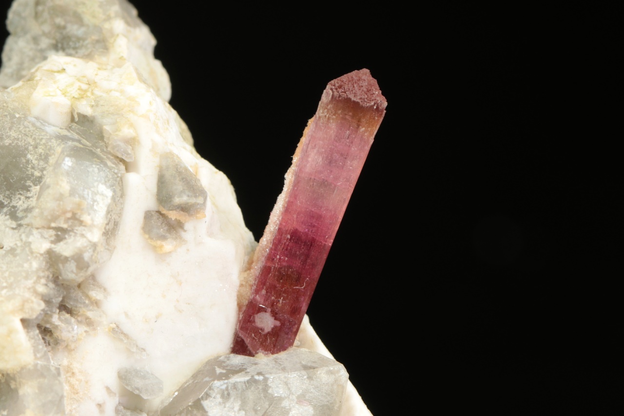 Krystal dobře omezeného růžového turmalínu vystupující do prostoru z křemeno živcové podložky. Krystal je v horní polovině světlejší, délka krystalu je 2 cm.