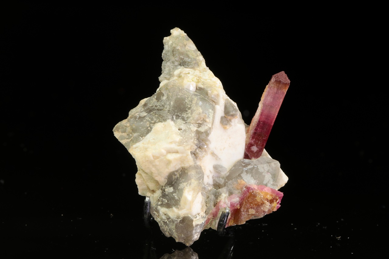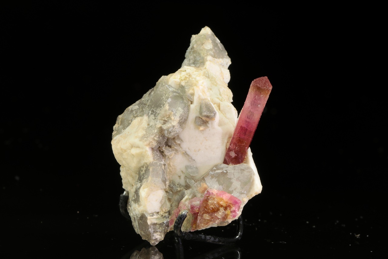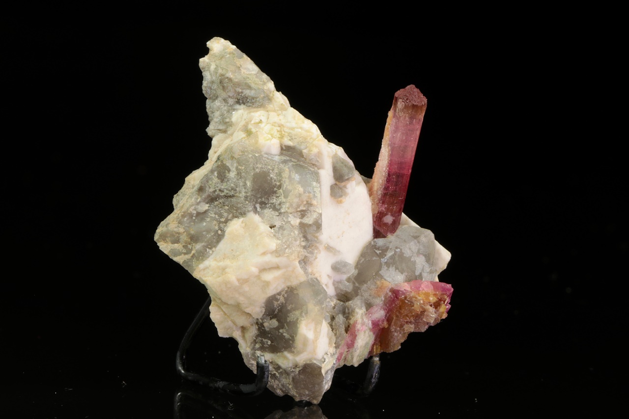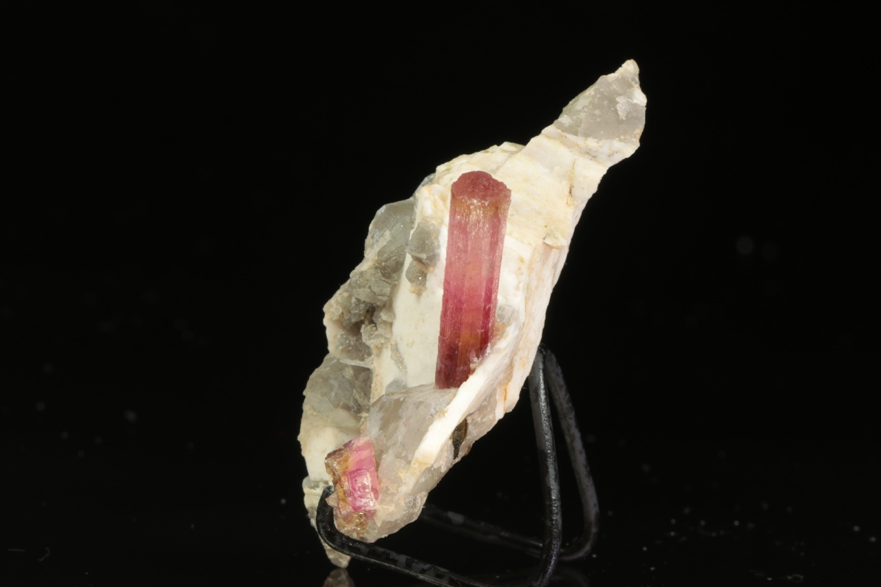Krystal dobře omezeného růžového turmalínu vystupující do prostoru z křemeno živcové podložky. Krystal je v horní polovině světlejší, délka krystalu je 2 cm.