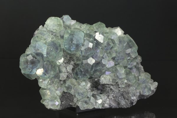 Přenádherná drúza krystalů světle zeleného fluoritu s fialovými středy tvořených spojkami krychle s osmistěnem. Fluorit je velmi čistý až průhledný, největší krystaly jsou až 2,5 cm velké.