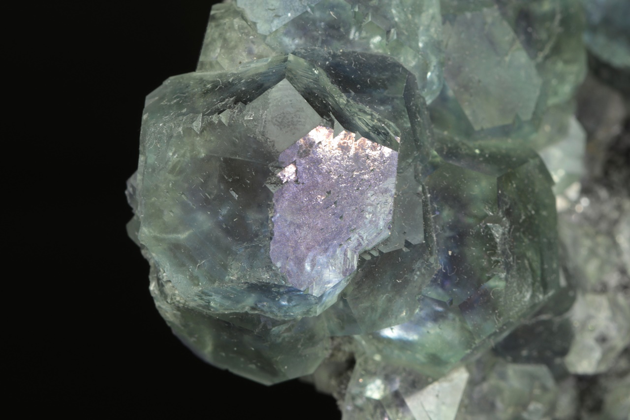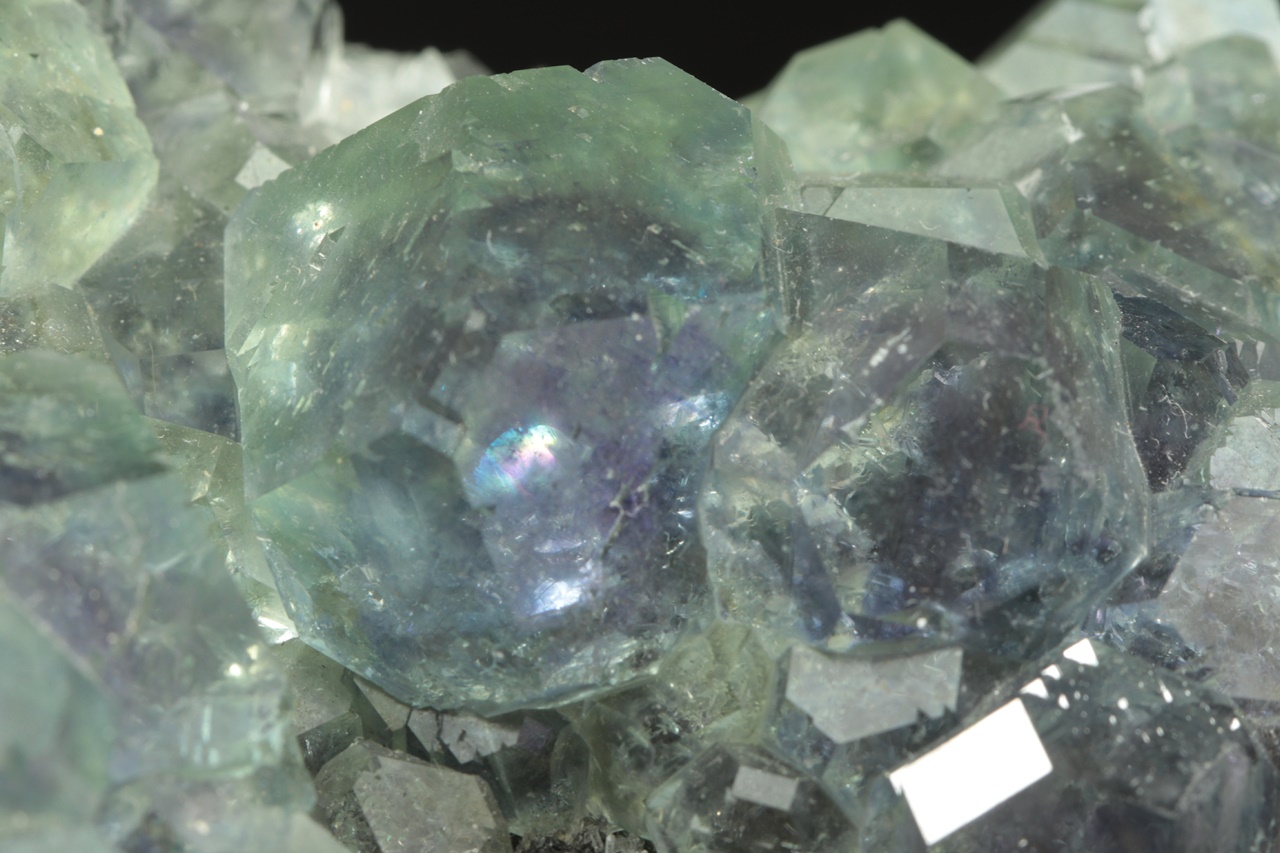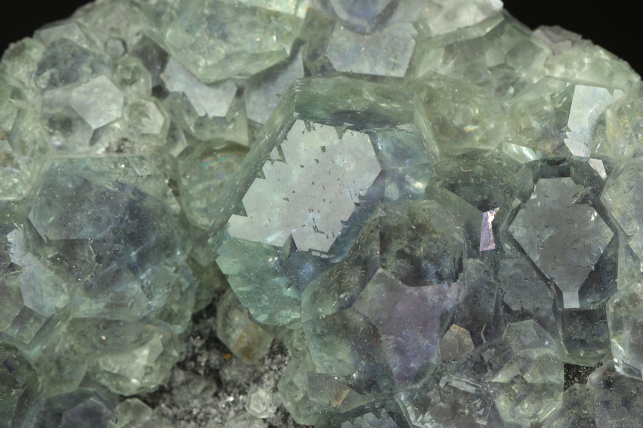 Přenádherná drúza krystalů světle zeleného fluoritu s fialovými středy tvořených spojkami krychle s osmistěnem. Fluorit je velmi čistý až průhledný, největší krystaly jsou až 2,5 cm velké.