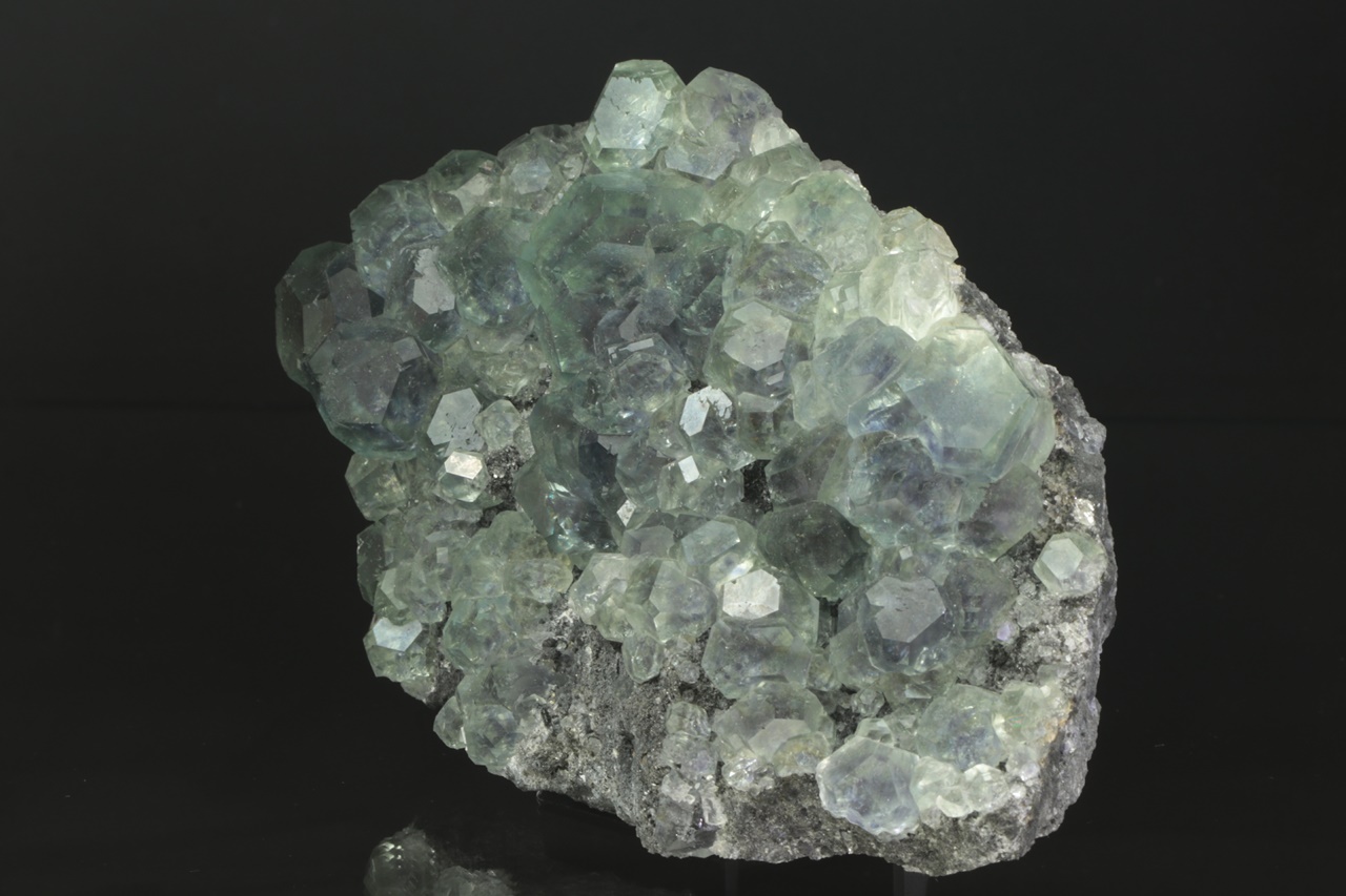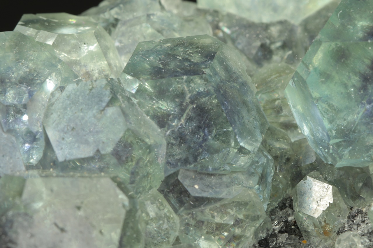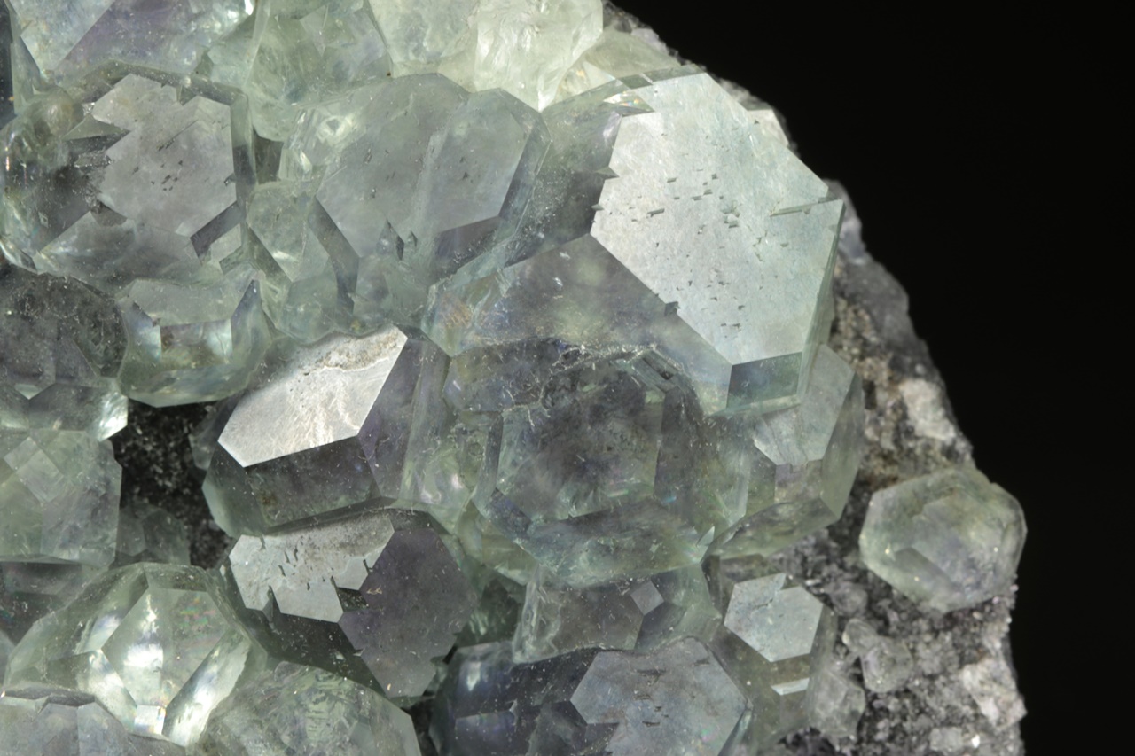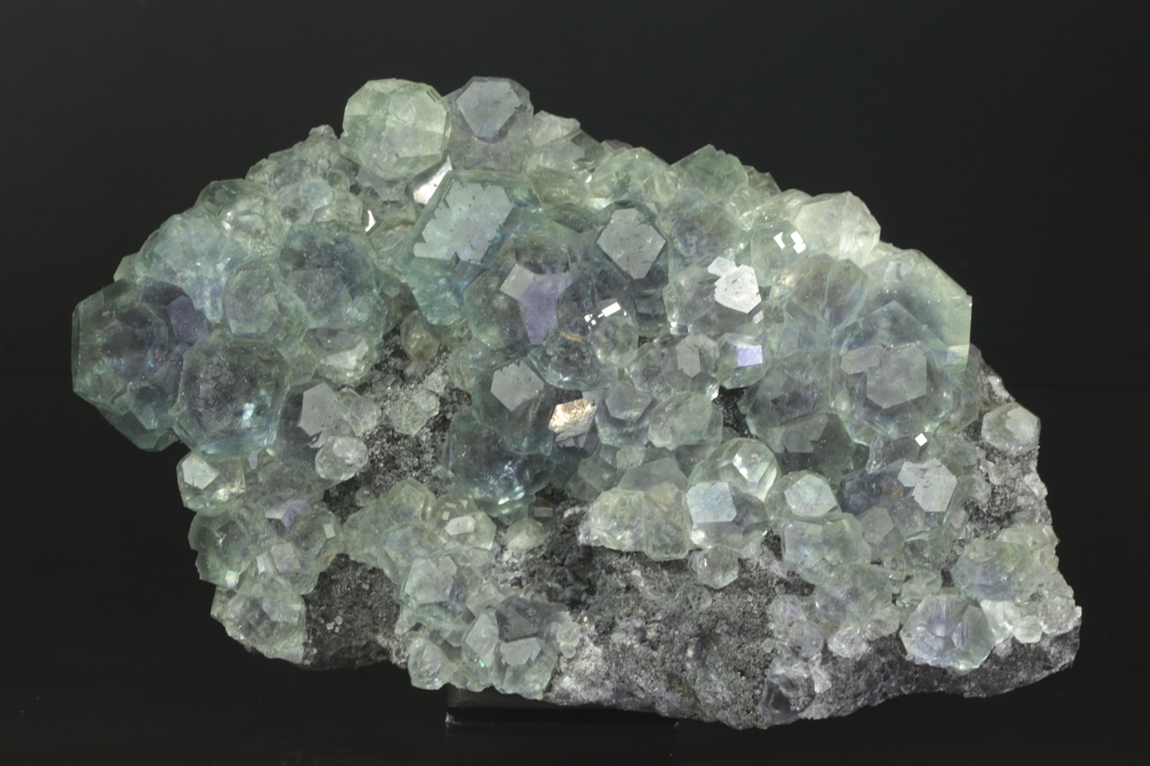 Přenádherná drúza krystalů světle zeleného fluoritu s fialovými středy tvořených spojkami krychle s osmistěnem. Fluorit je velmi čistý až průhledný, největší krystaly jsou až 2,5 cm velké.