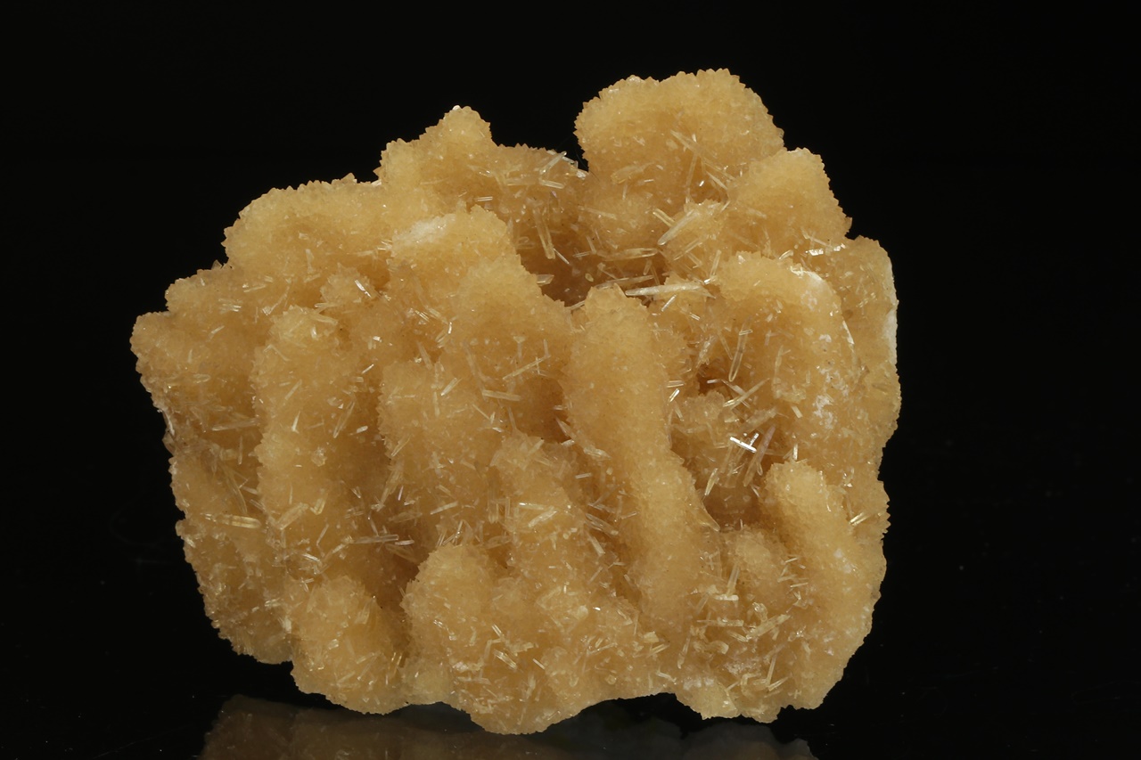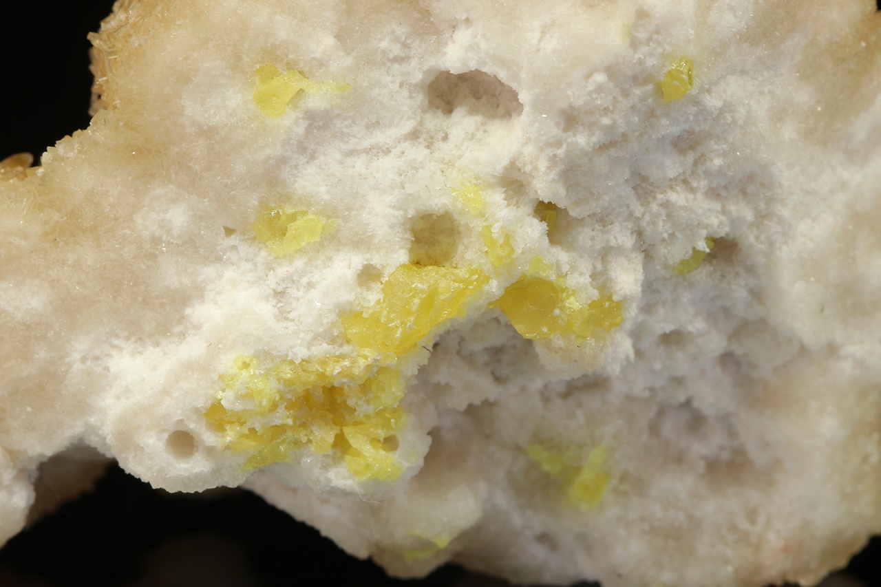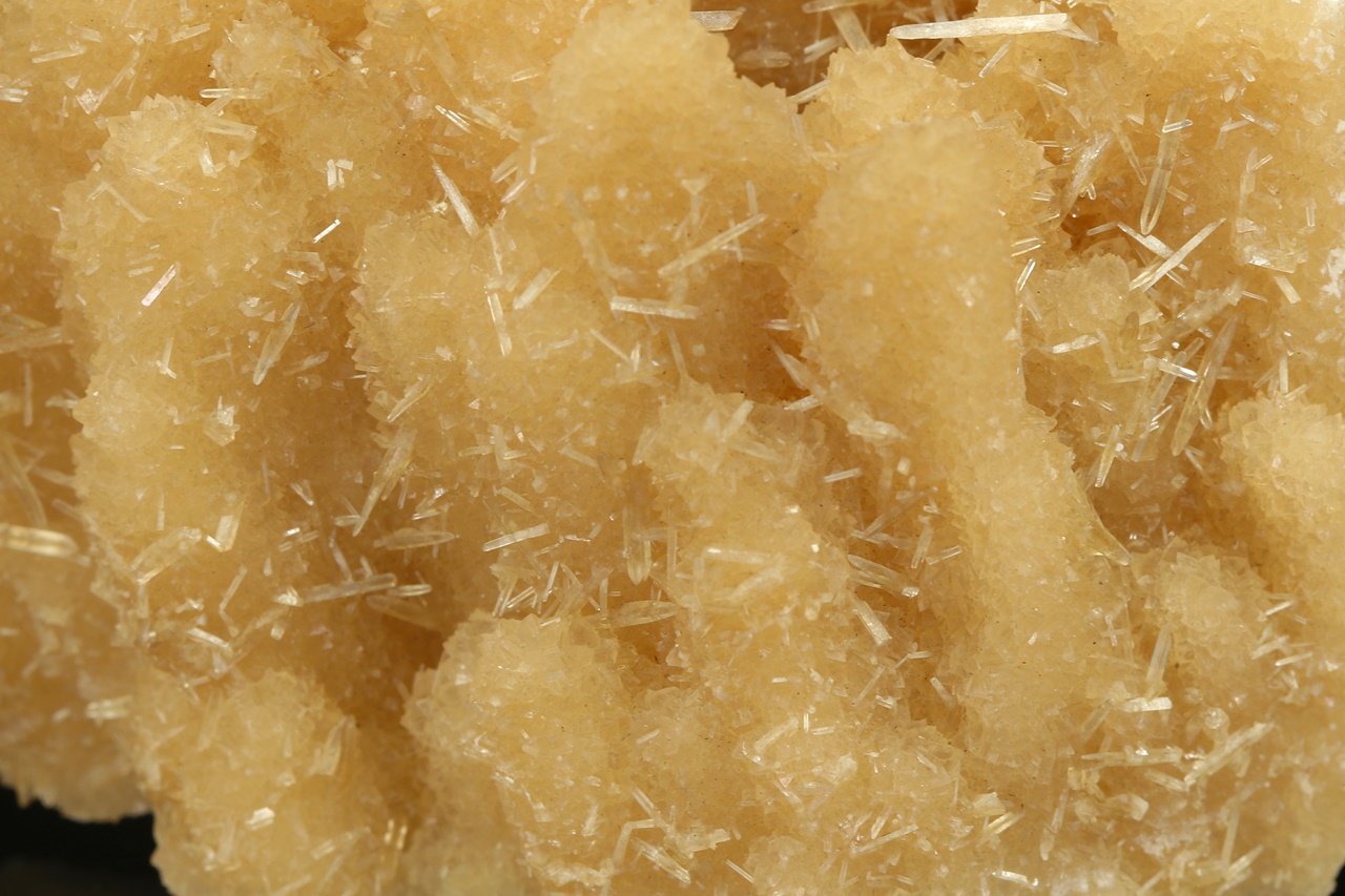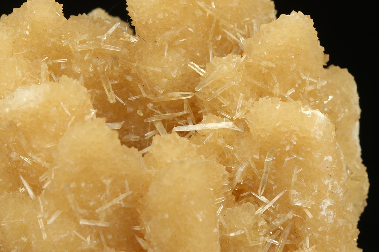 Protáhlé jehlice čirého celestýnu až 1 cm velké narostlé na béžovém aragonitu. Na spodu vzorku jsou přítomná žlutá zrna síry.