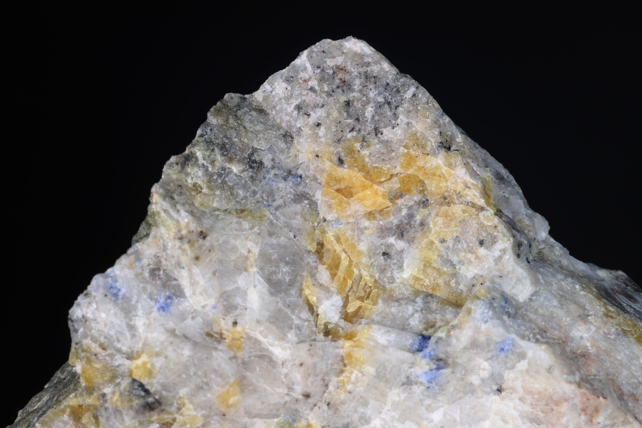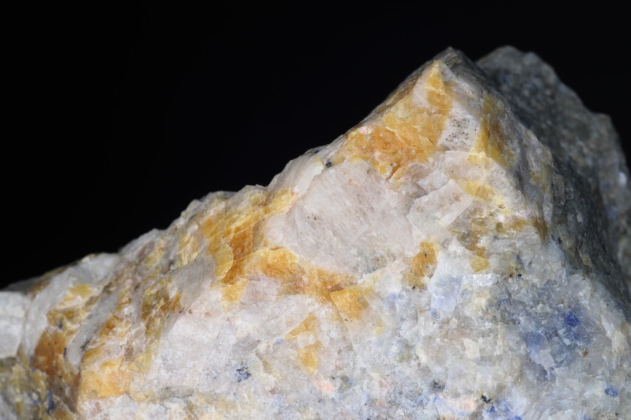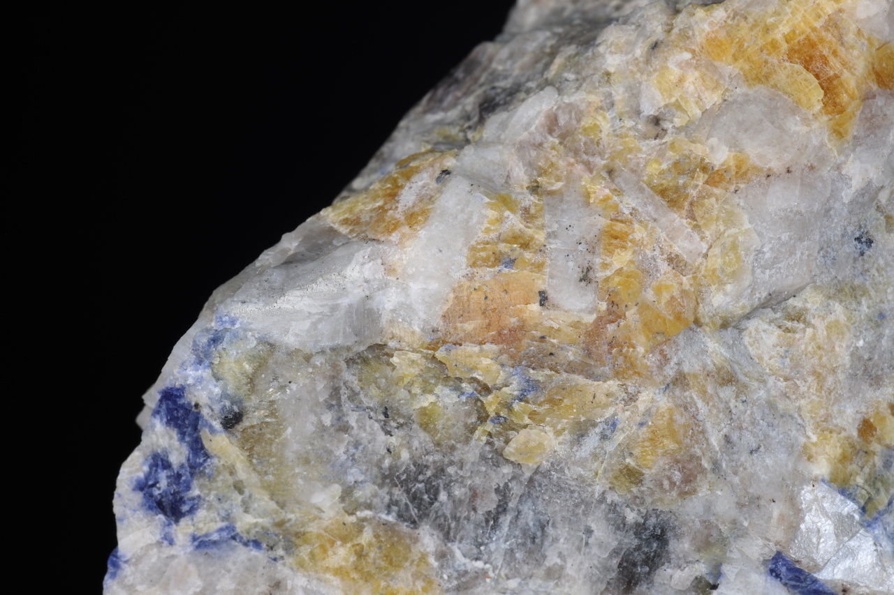 Velmi bohatý vzorek štěpných zrn žlutooranžového exotického silikátu Na, Ca a Al se síranovou a karbonátovou skupinou – kankrinitu v asociaci se sytě modrým sodalitem. Ukázka pochází z málo obvyklého naleziště Ditrau v Rumunsku.