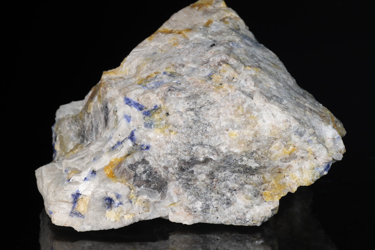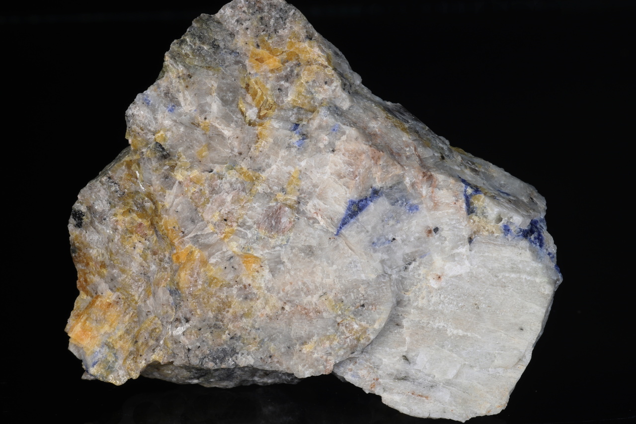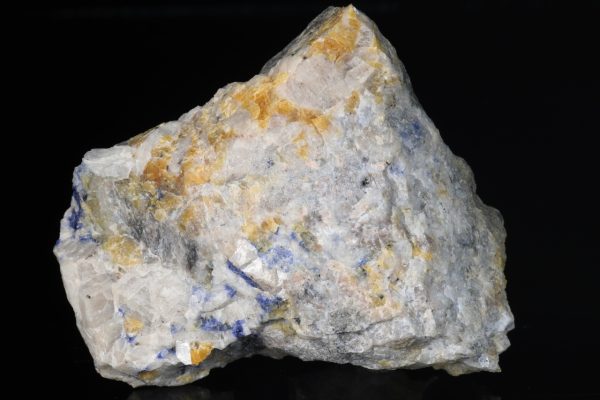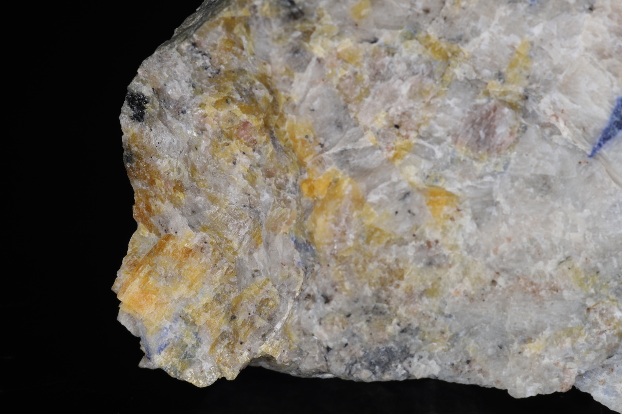 Velmi bohatý vzorek štěpných zrn žlutooranžového exotického silikátu Na, Ca a Al se síranovou a karbonátovou skupinou – kankrinitu v asociaci se sytě modrým sodalitem. Ukázka pochází z málo obvyklého naleziště Ditrau v Rumunsku.