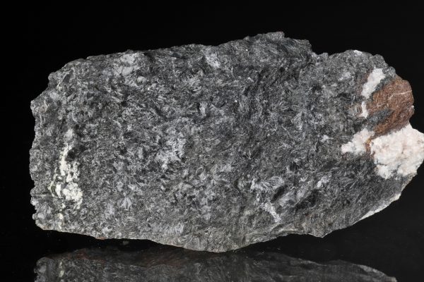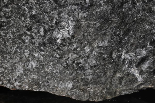 Masivní ukázka tvořená z velké části vláknitým radiálně paprsčitým černým ludwigitem. Ludwigit je nepříliš běžný borát železa a hořčíku. Tato bohatá ukázka pochází z jeho typové lokality Ocna de Fier v Rumunsku.