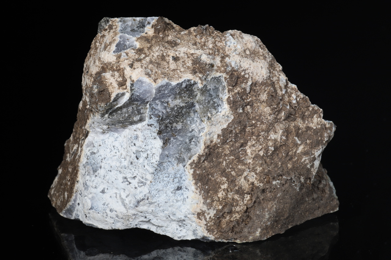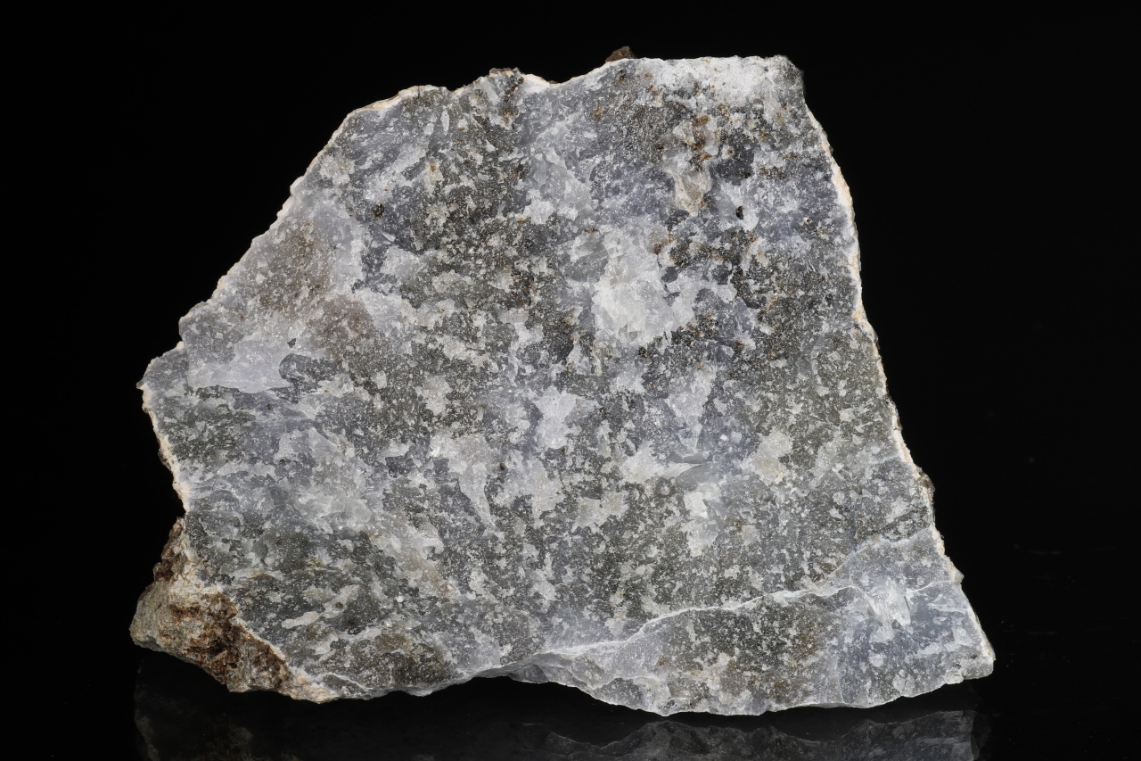 Masivní ukázka tvořená téměř výhradně světle namodralým spurritem, velmi vzácným silikátem vápníku s CO3 skupinou z vysokoteplotního skarnu spolu se žlutohnědým gehlenitem. Tento exotický minerál pochází z naleziště Cornet v Rumunsku.