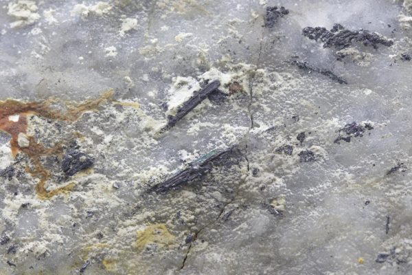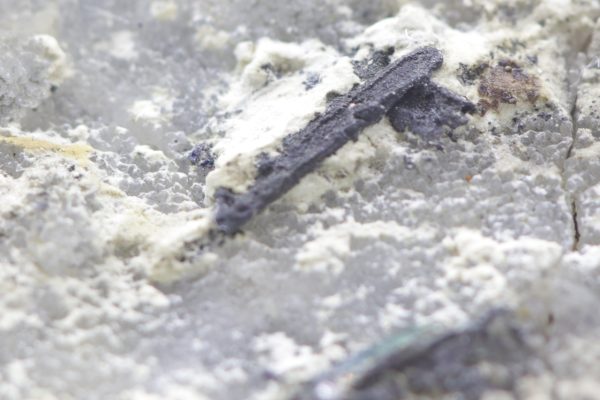Historický vzorek telluridu stříbra a zlata z typové lokality. Na vzorku vyniká velký (9 mm) izolovaný krystal. Vzorek je historicky lepený.