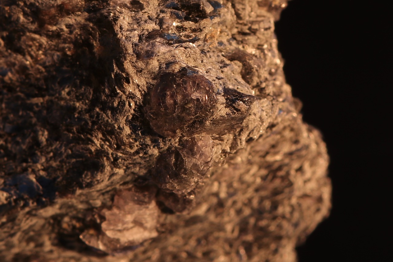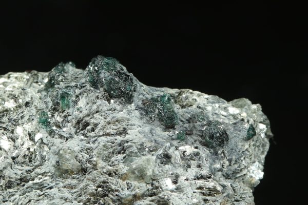 Až 5 mm velké krystaly barvoměnné odrůdy chryzoberylu ve slídové matrix. Alexandrit mění barvu na červenou pod světlem klasické wolframové žárovky.