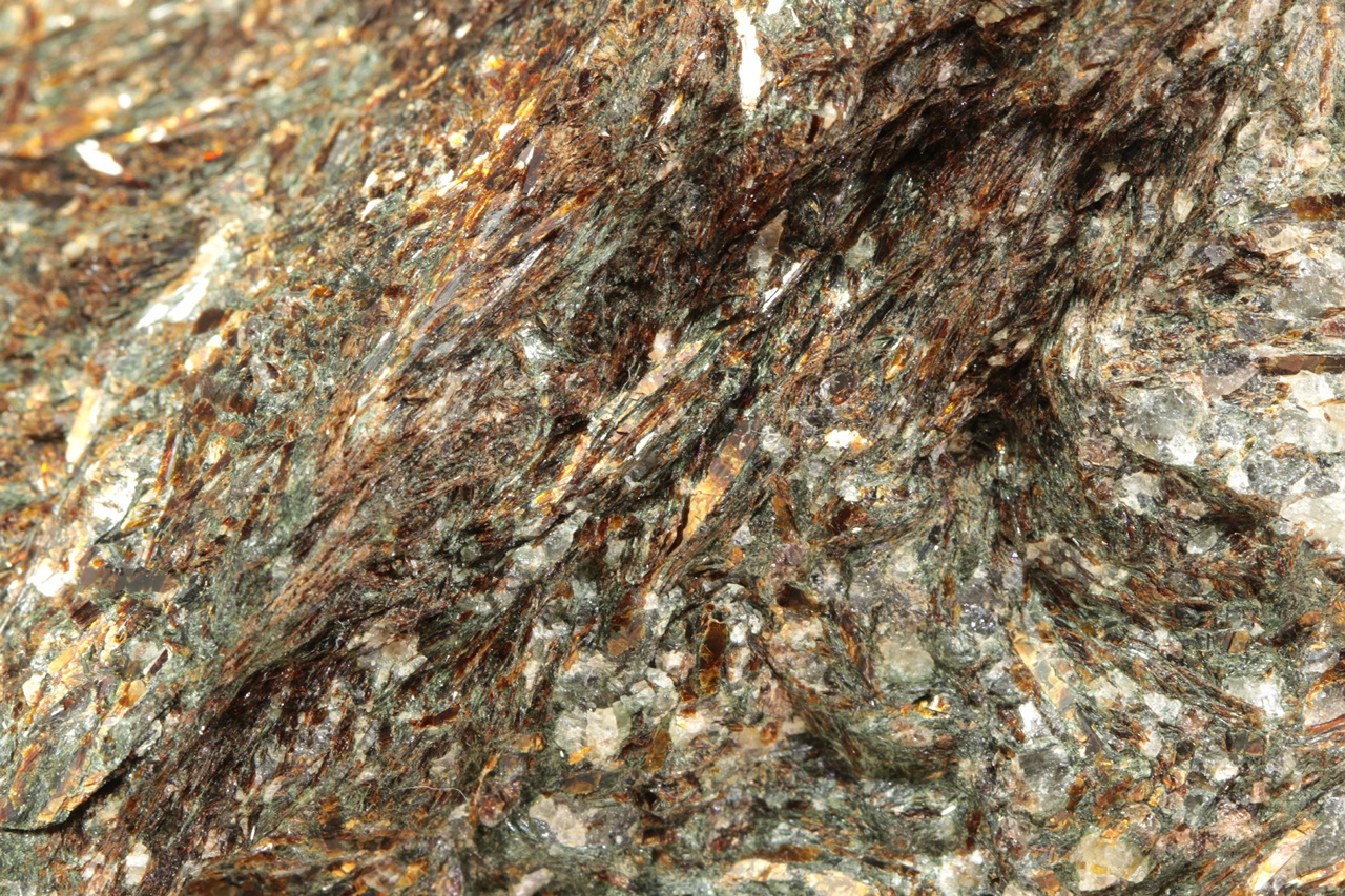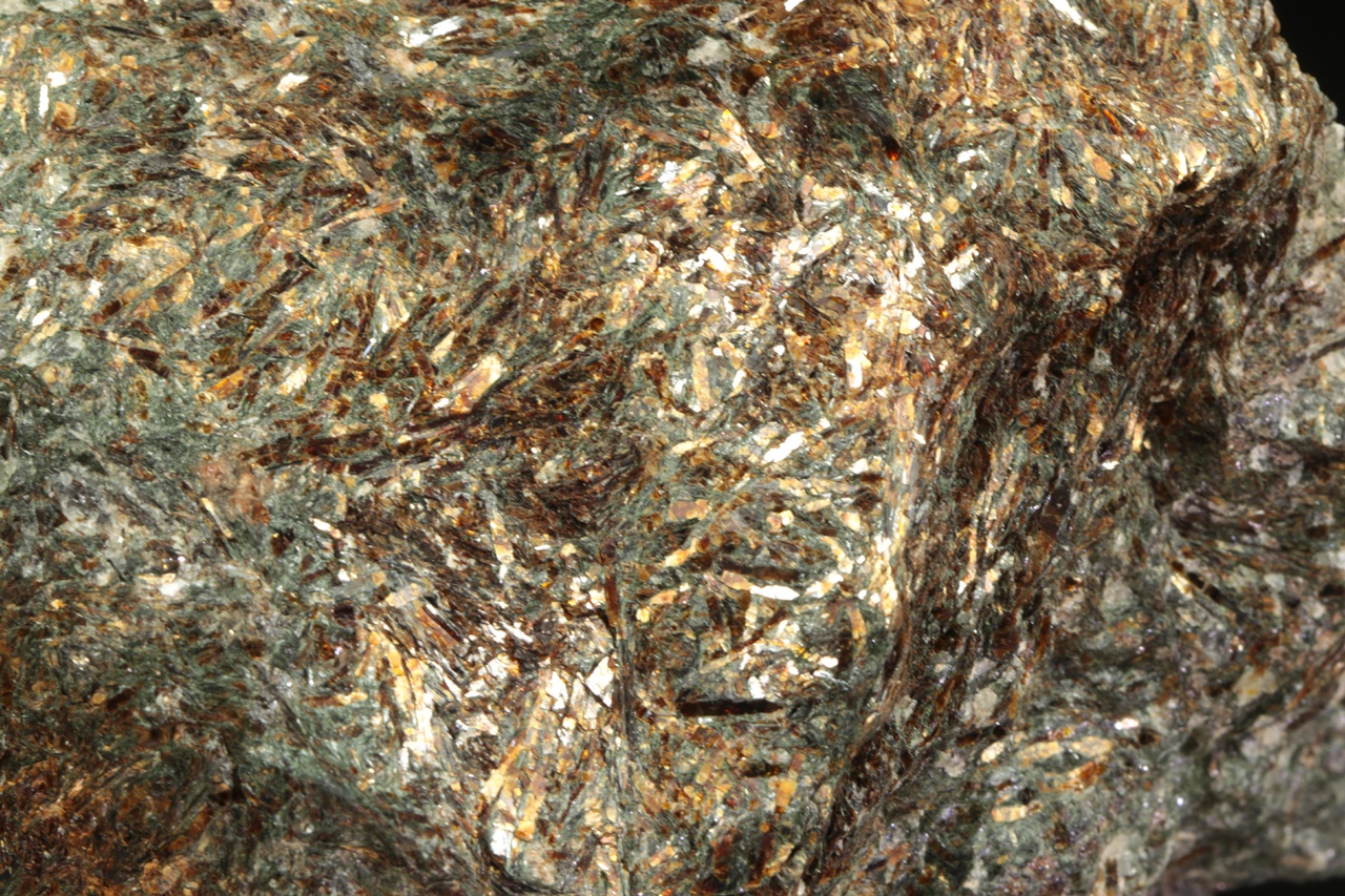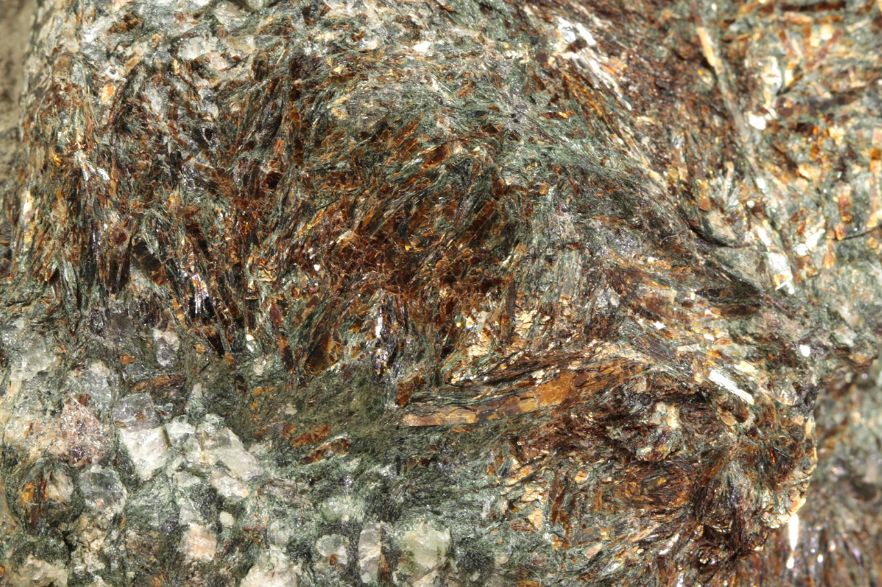 Bohatě narostlé lišty vzácného, bronzově lesklého astrofylitu až 1,5 cm.