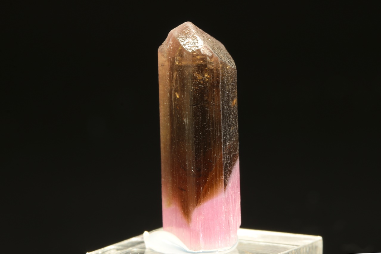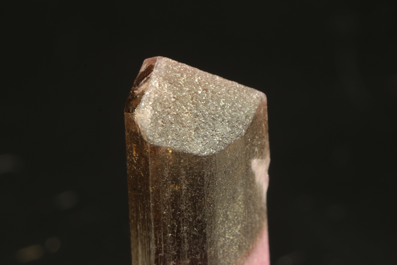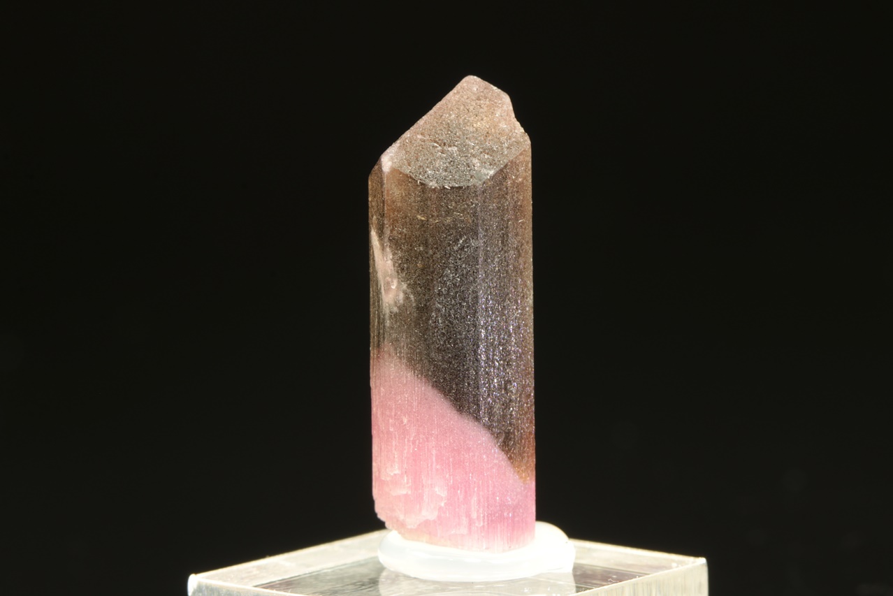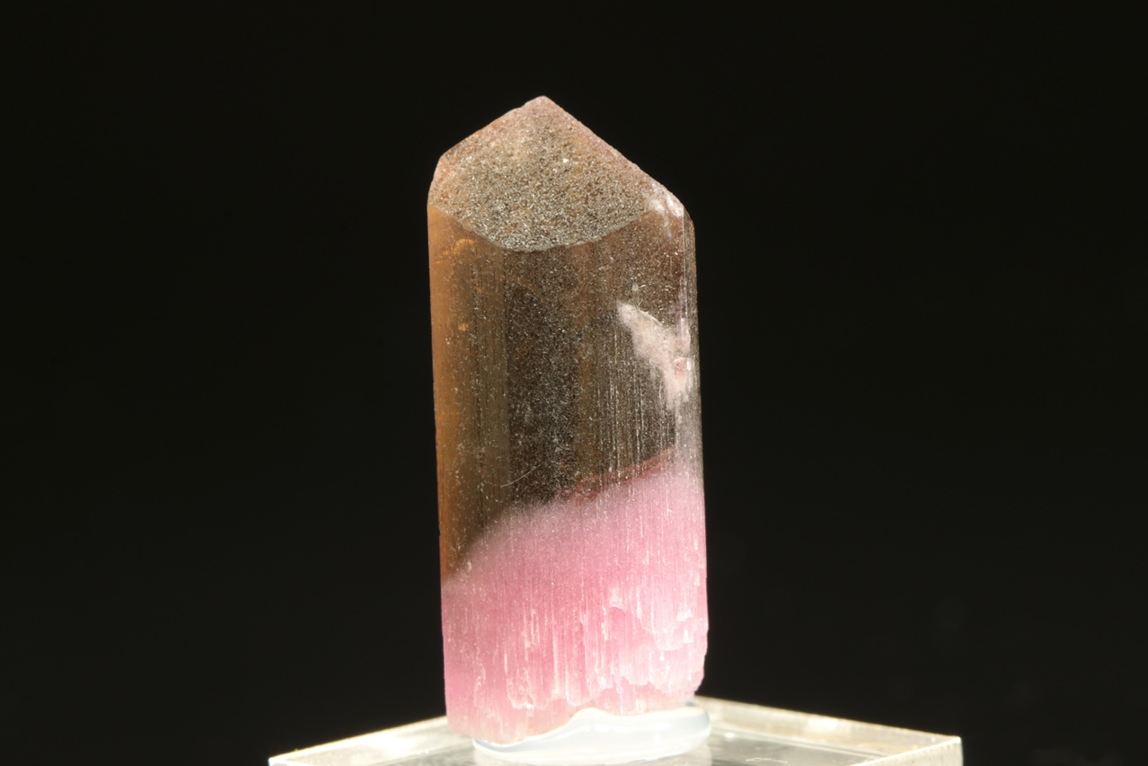 Oboustranně ukončený krystal turmalínu s béžovým, průsvitným vrškem a růžovým spodkem.