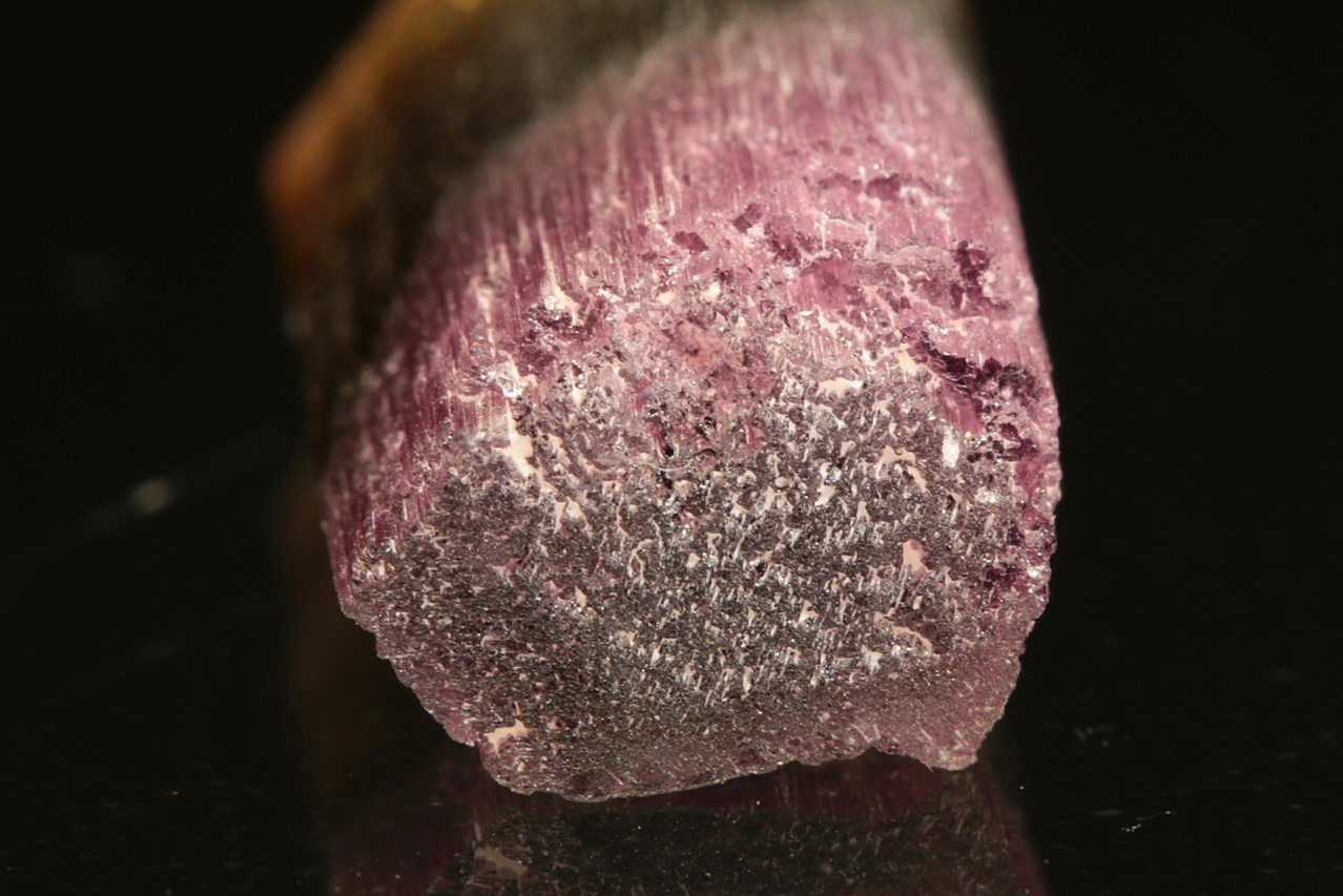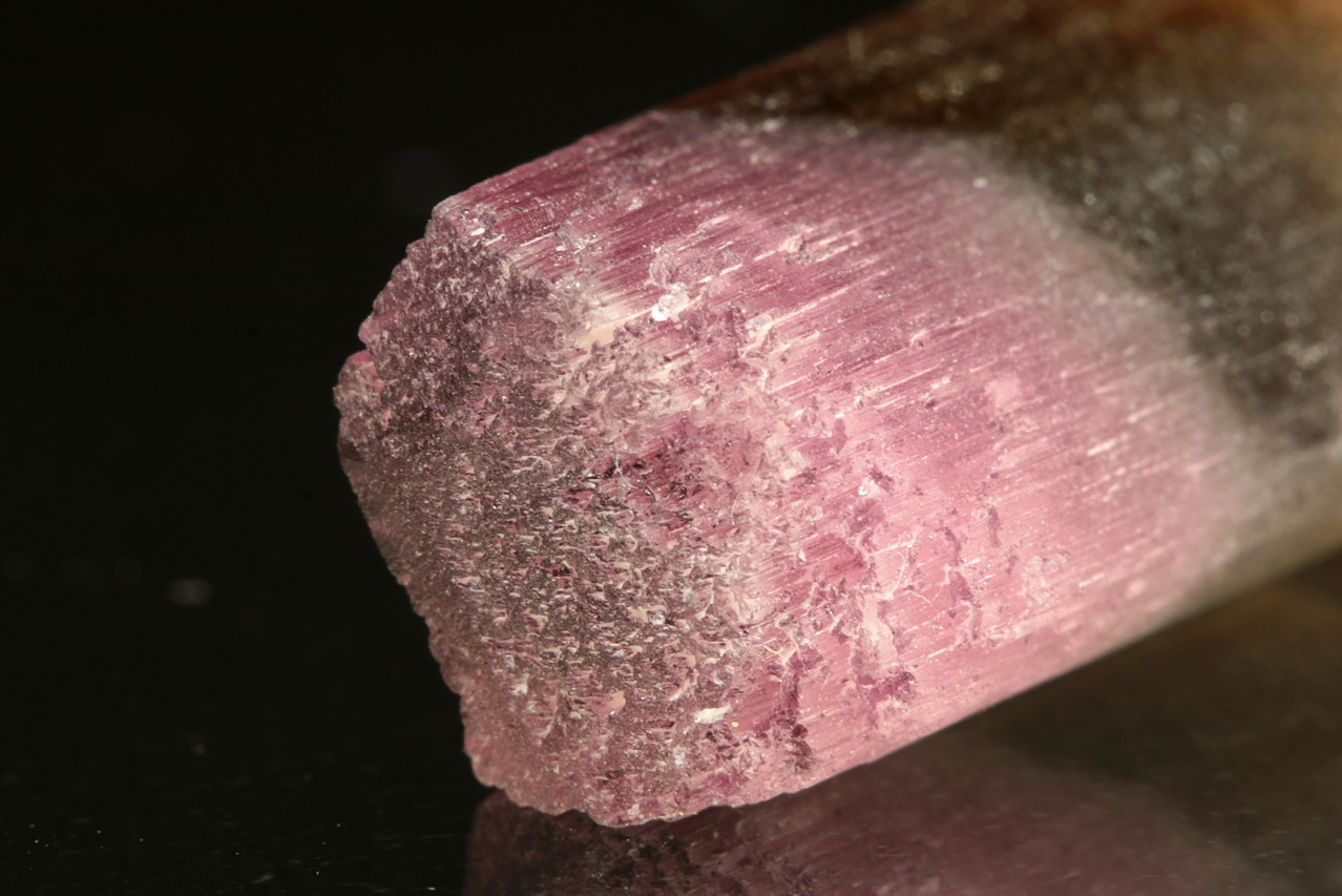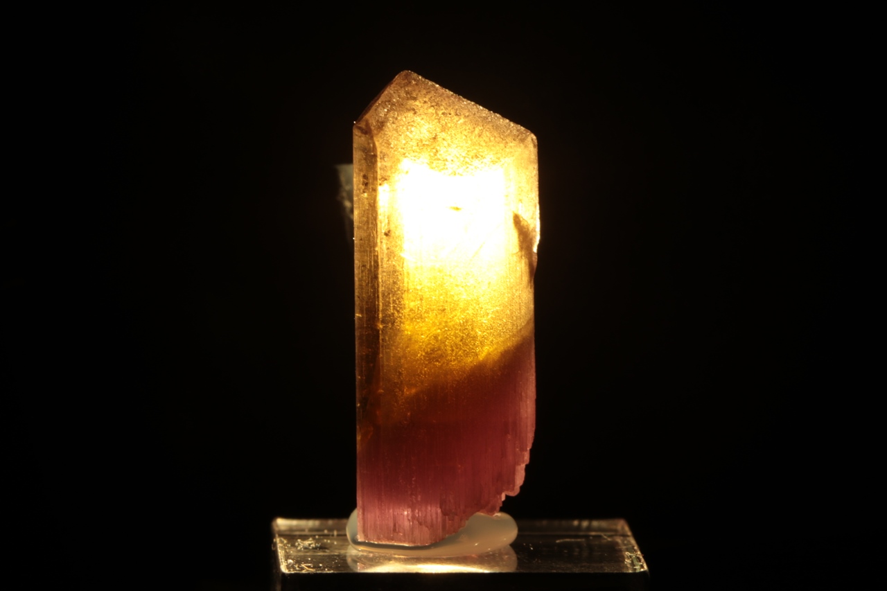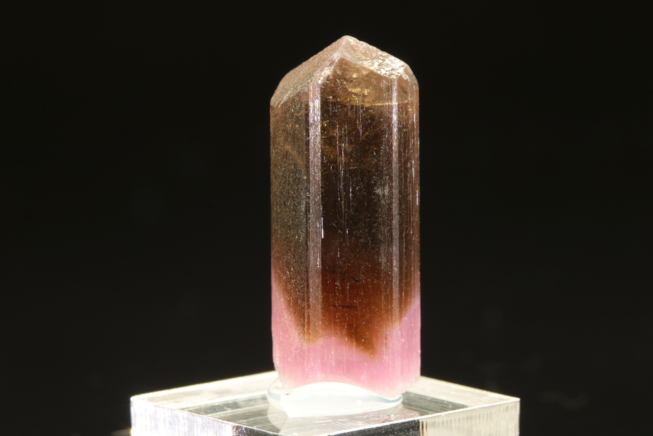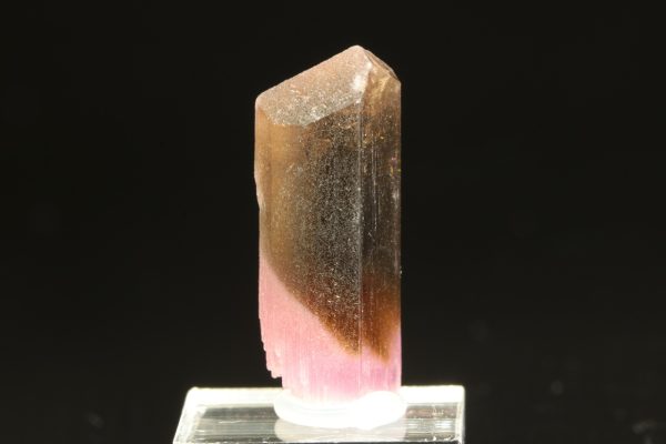 Oboustranně ukončený krystal turmalínu s béžovým, průsvitným vrškem a růžovým spodkem.
