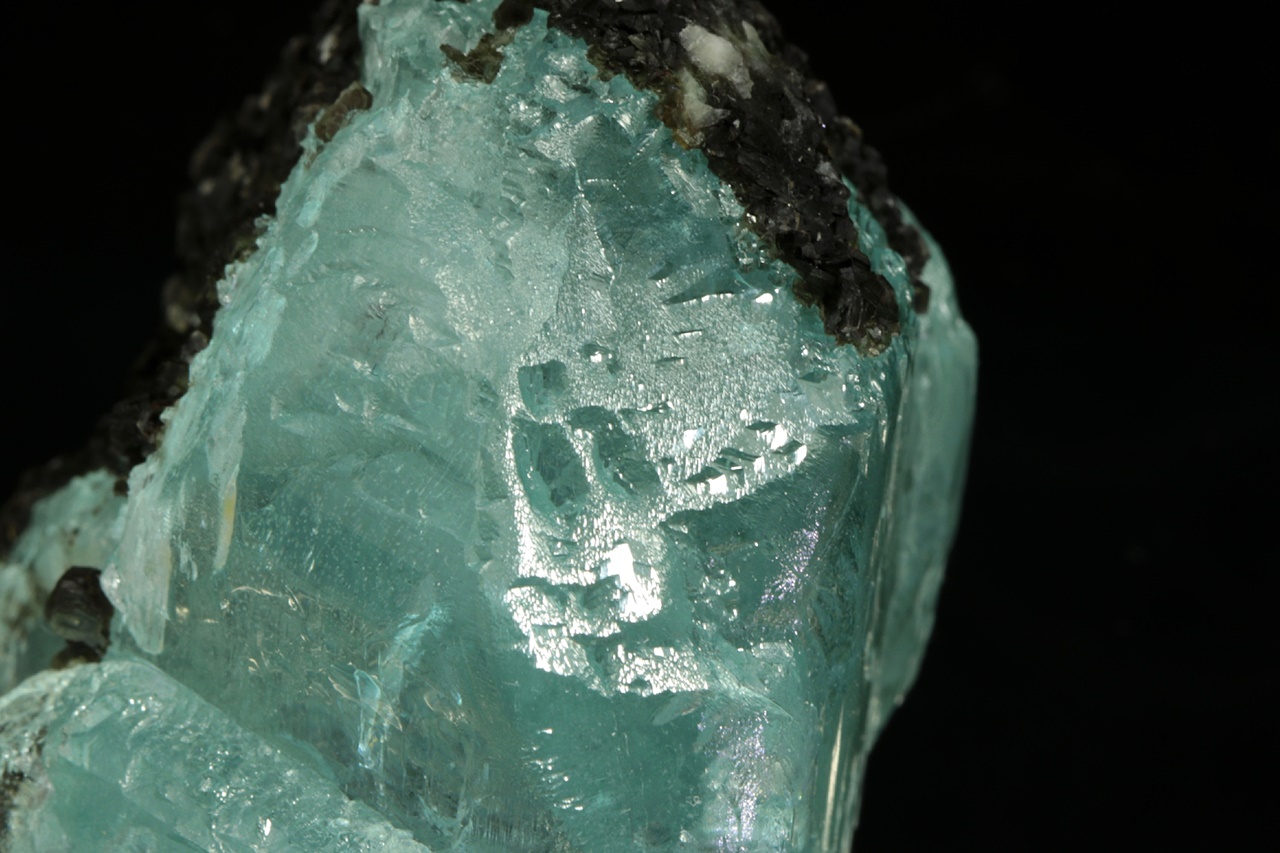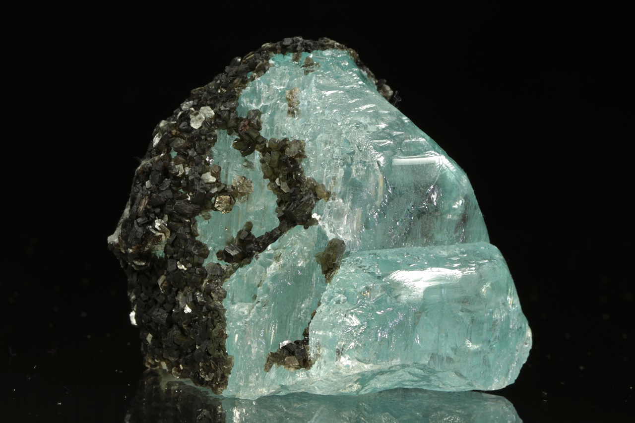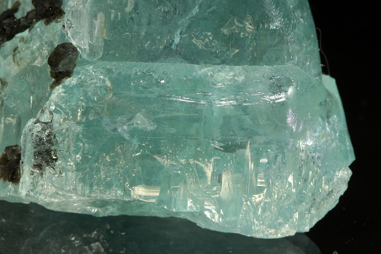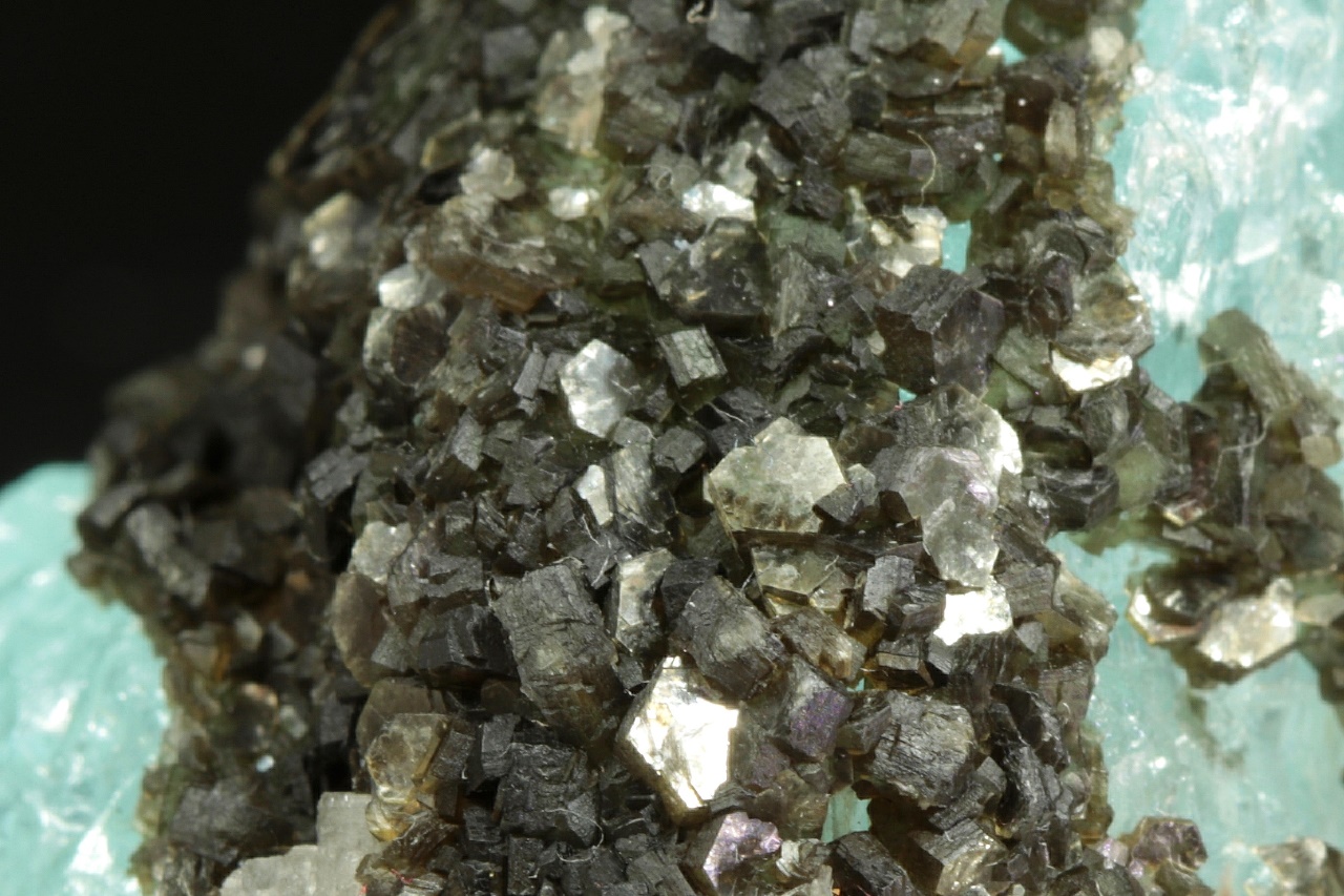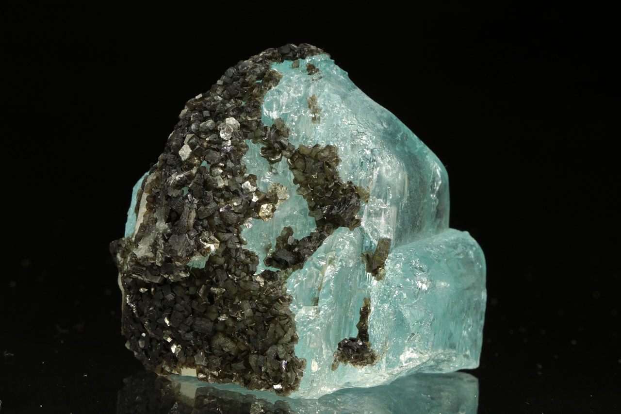 Hypoparalelní srostlice několika intenzivně modrých krytalů topazu z části pokrytých krystaly biotitu až 5 mm velkými. Krystal je zespodu uštíplý podle báze.