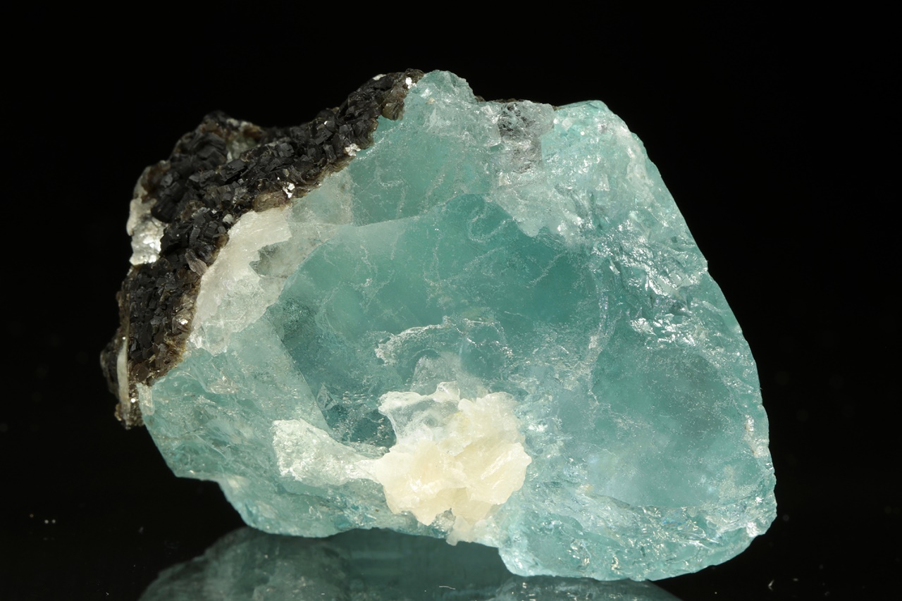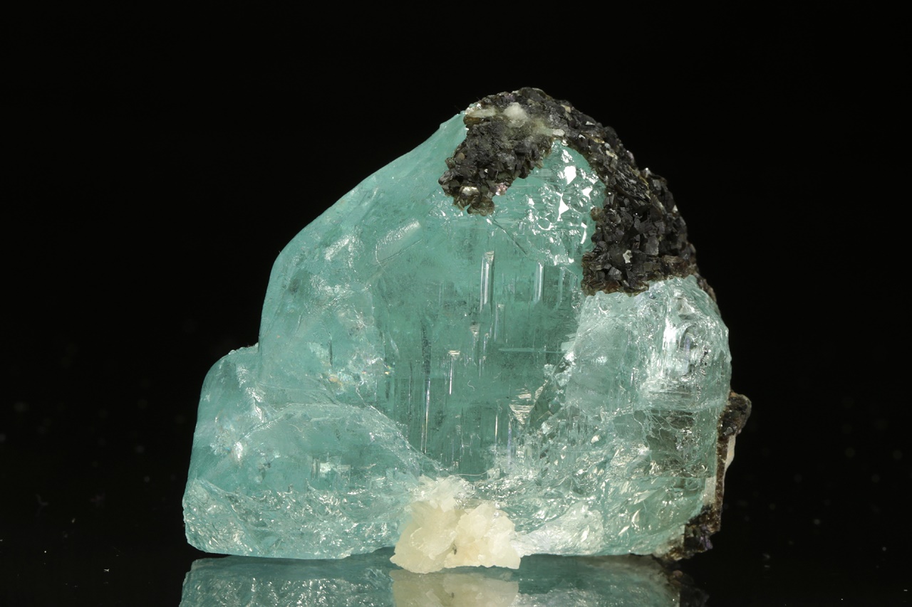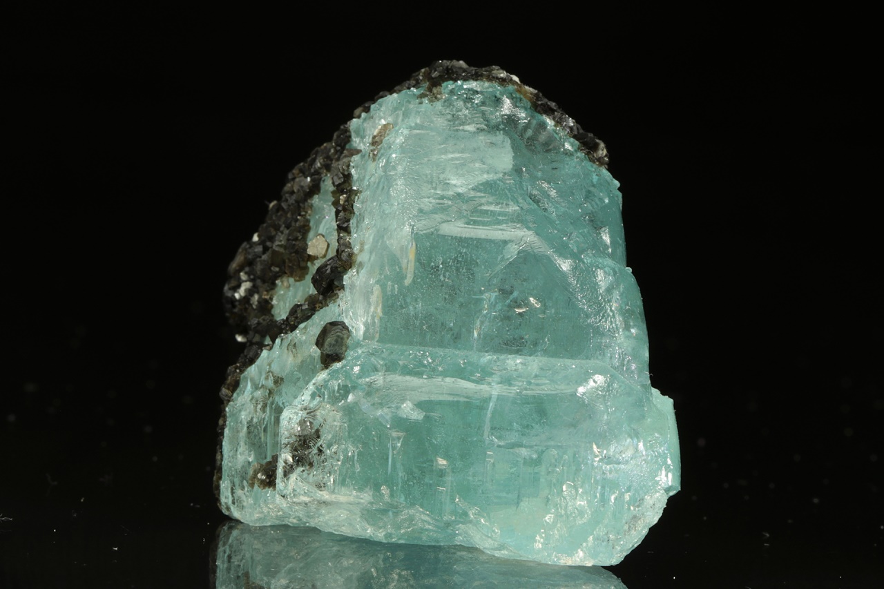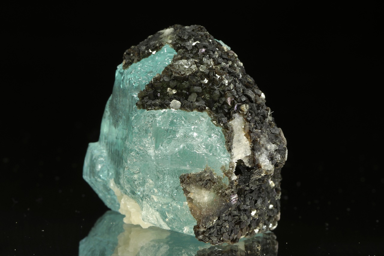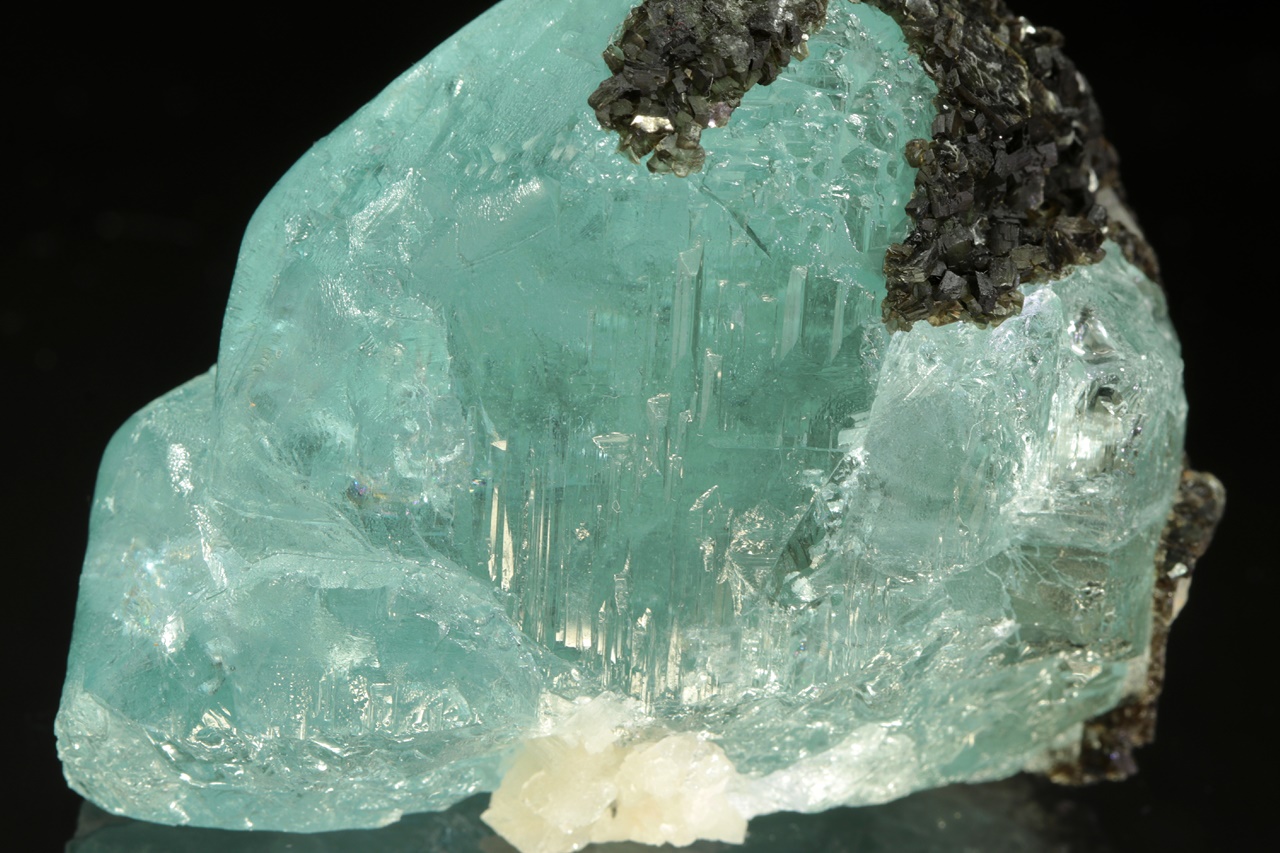 Hypoparalelní srostlice několika intenzivně modrých krytalů topazu z části pokrytých krystaly biotitu až 5 mm velkými. Krystal je zespodu uštíplý podle báze.