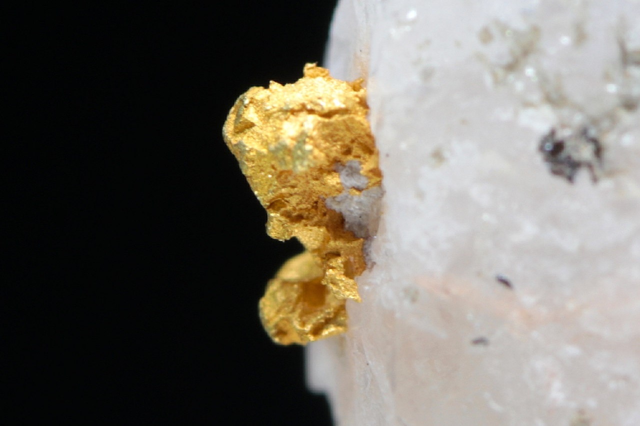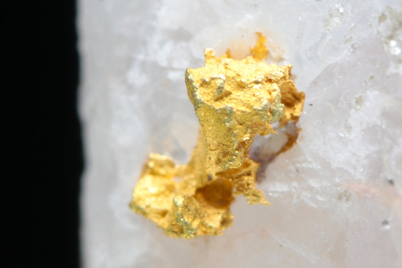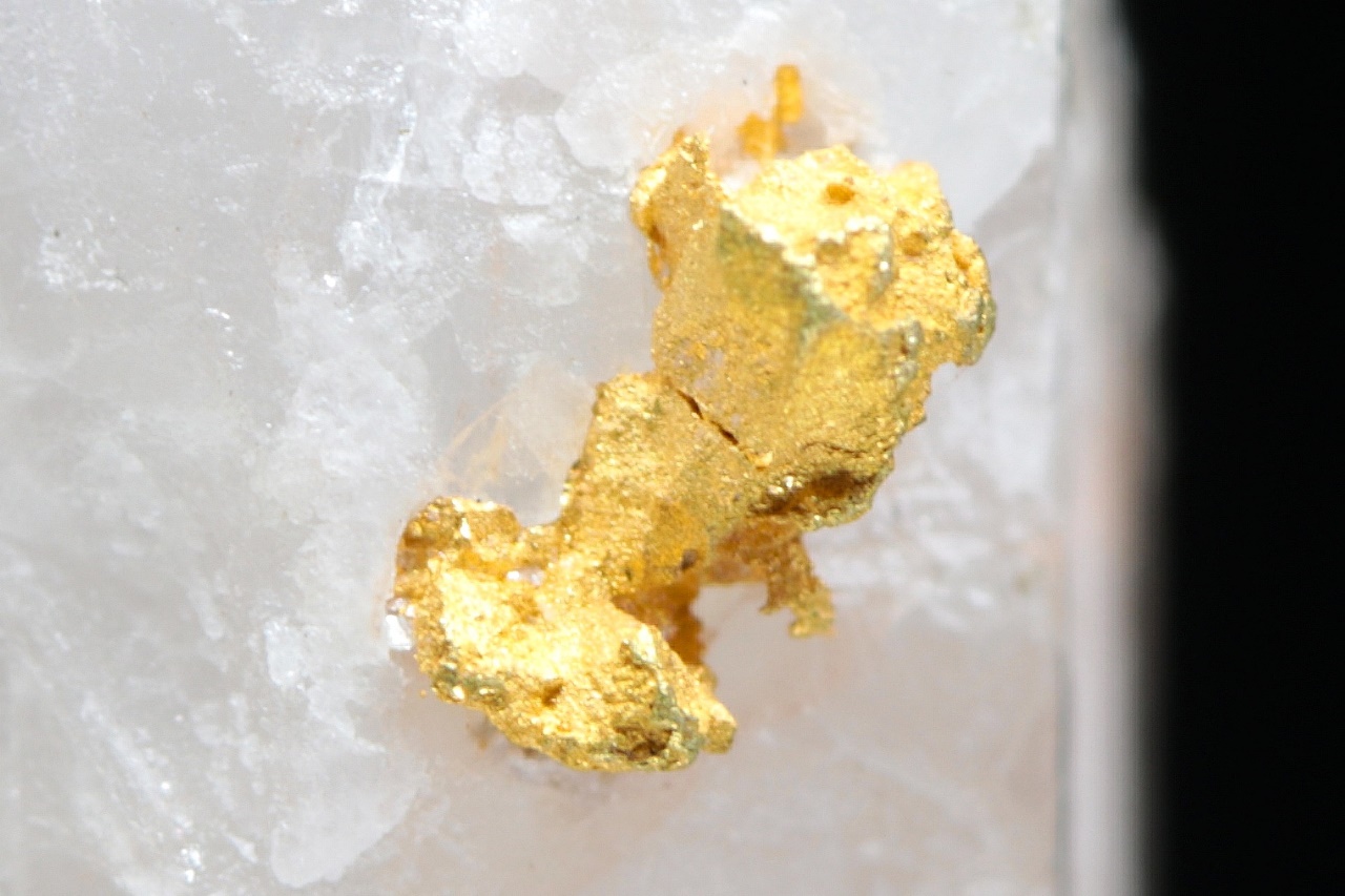Tři milimetry velký kus ryzího zlata narostlý na krystalu křemene.