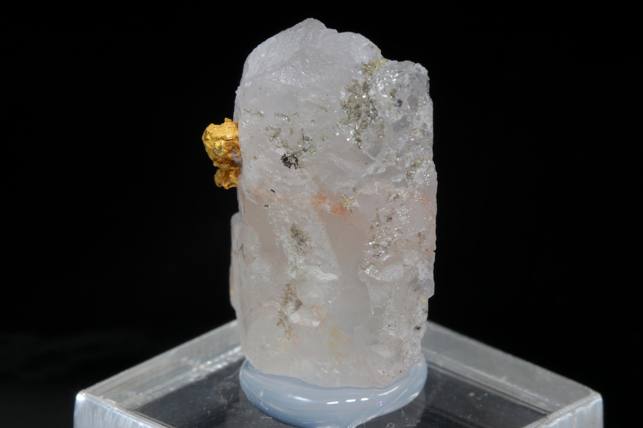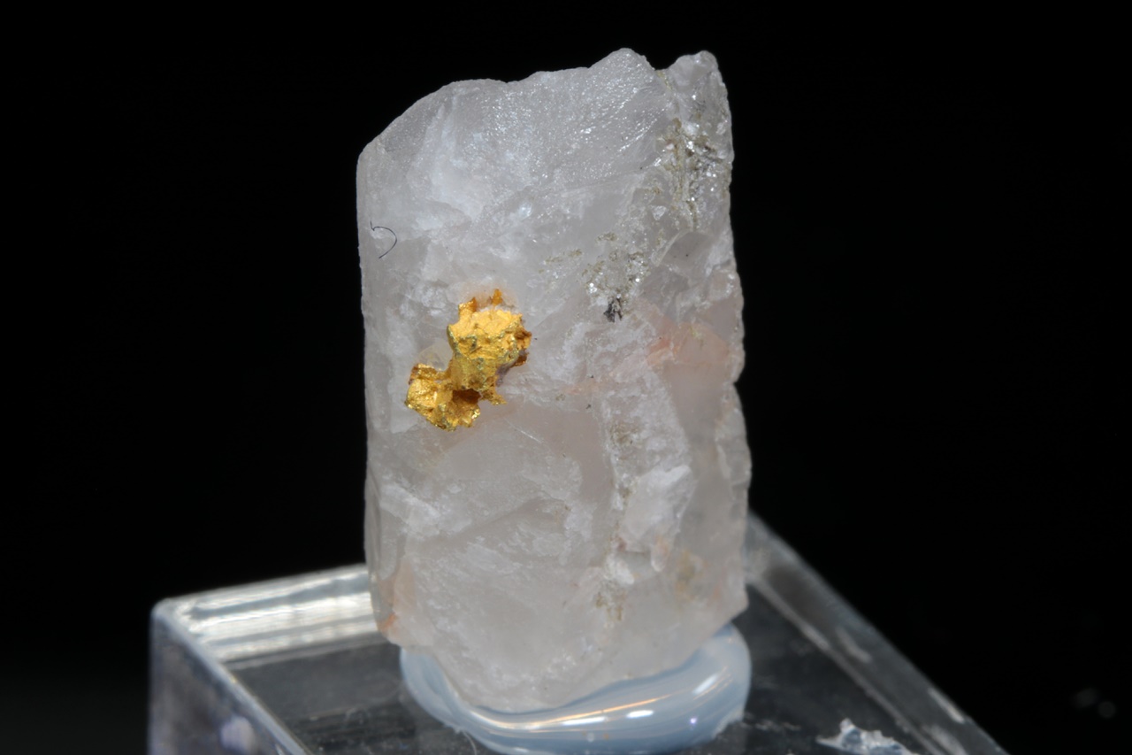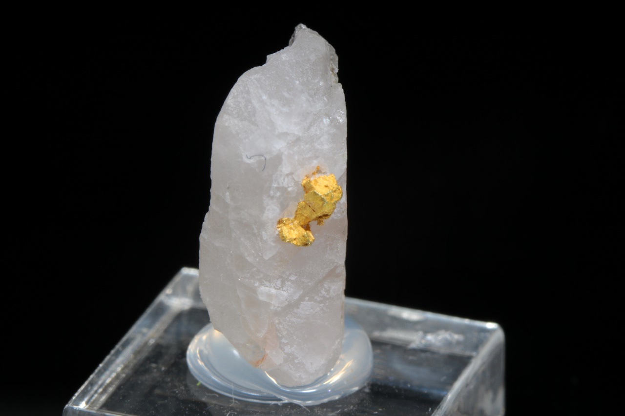 Tři milimetry velký kus ryzího zlata narostlý na krystalu křemene.