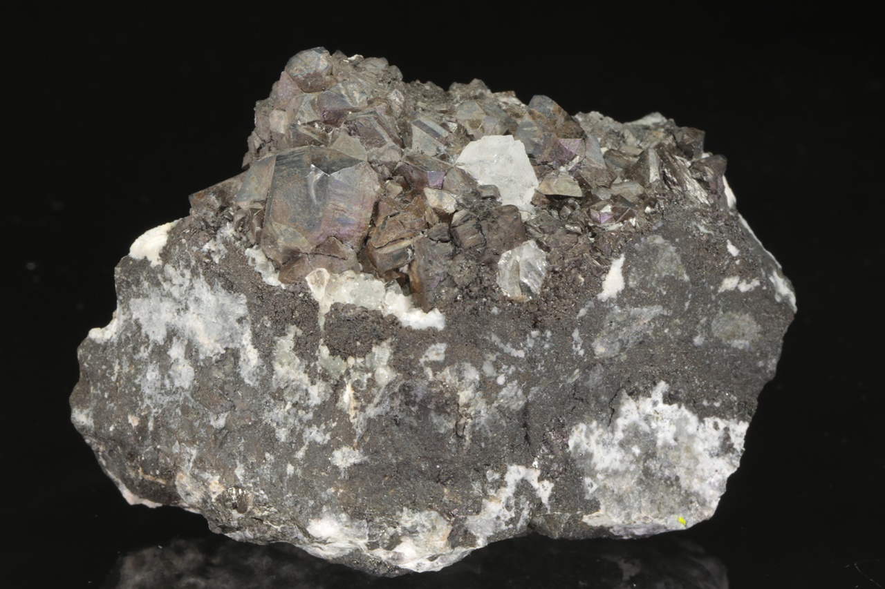 Drúza matně lesklých krystalů sulfidu manganu – alabandinu s bílým průsvitným krystalem fluoritu. Největší krystal alabandinu je 10 mm velký, krystal fluoritu je 6 mm velký.