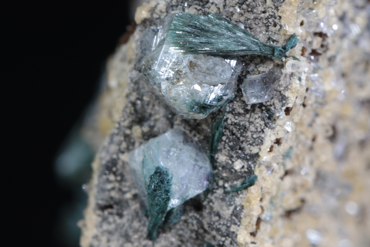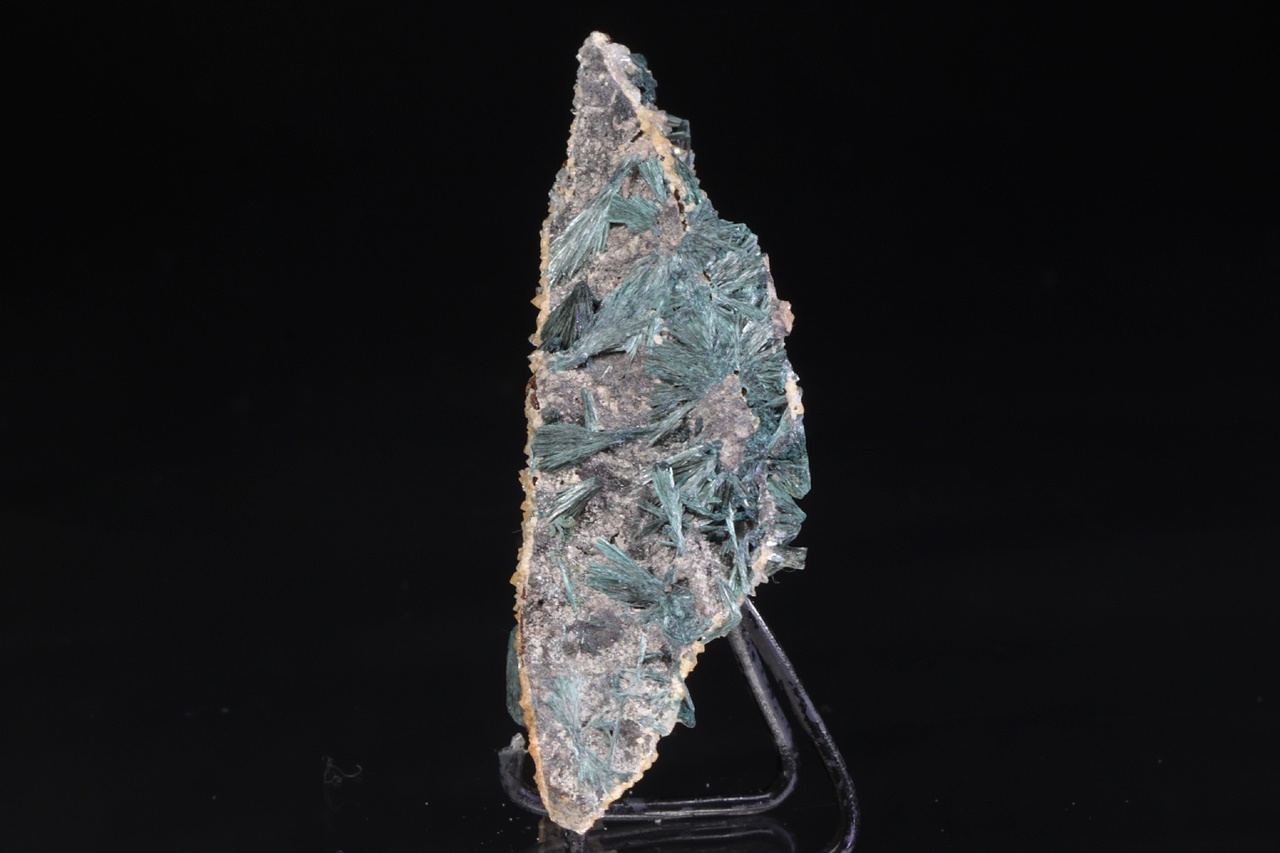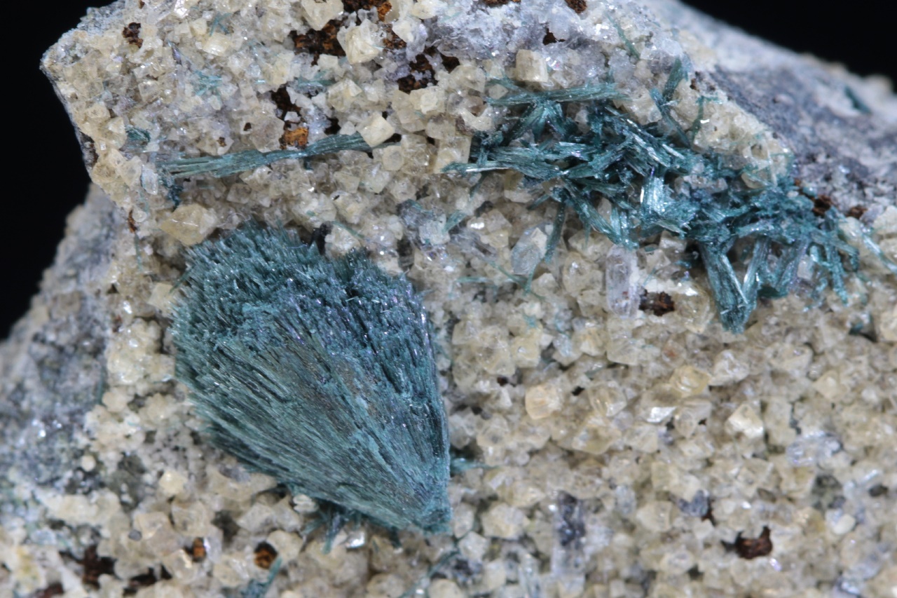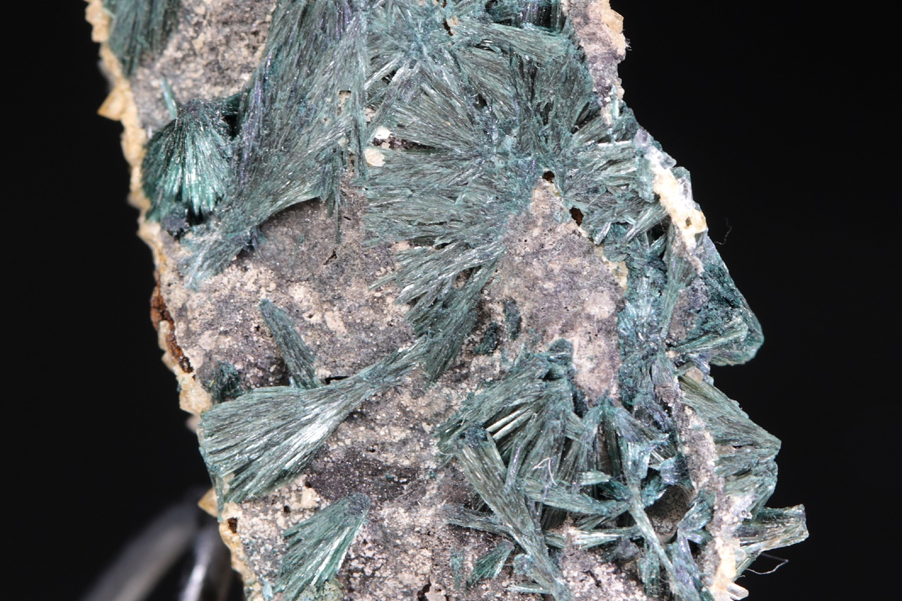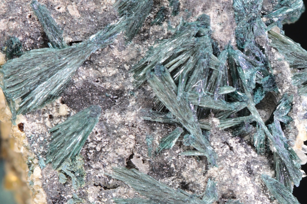 Tmavě zelené, hedvábně lesklé jehlicovité agregáty vzácného fosfátu – gormanitu z typové lokality. Jehličky gormanitu jsou až 7 mm velké.