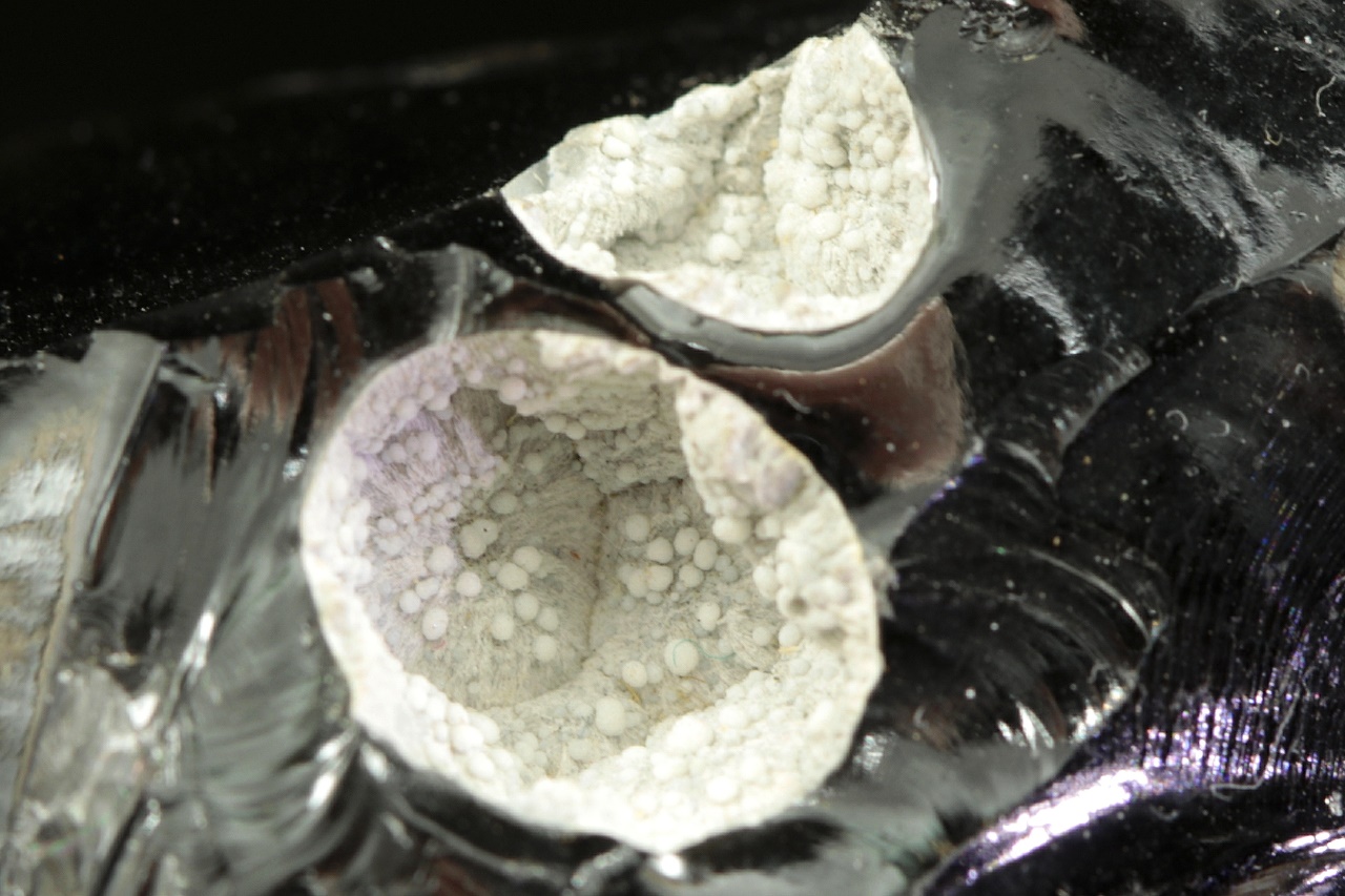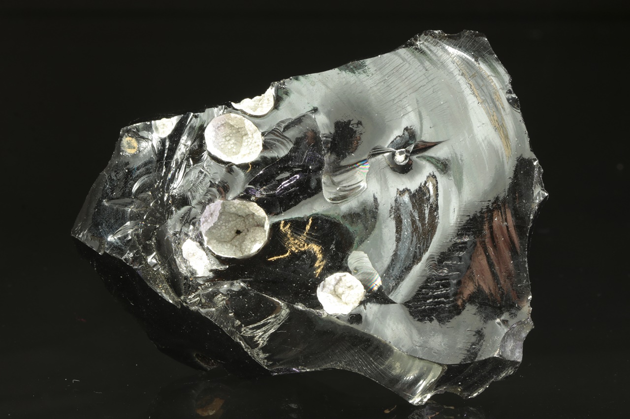 Milimetr velké kuličky s krystalovými plochami na povrch sněhově bílého cristobalitu, vzácného polymorfu křemene, v cca 1 cm velkých bublinách v obsidiánu. Estetická ukázka této vysokoteplotní a nízkotlaké fáze SiO2 v typickém vulkanickém vzorku.