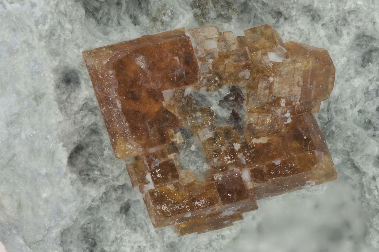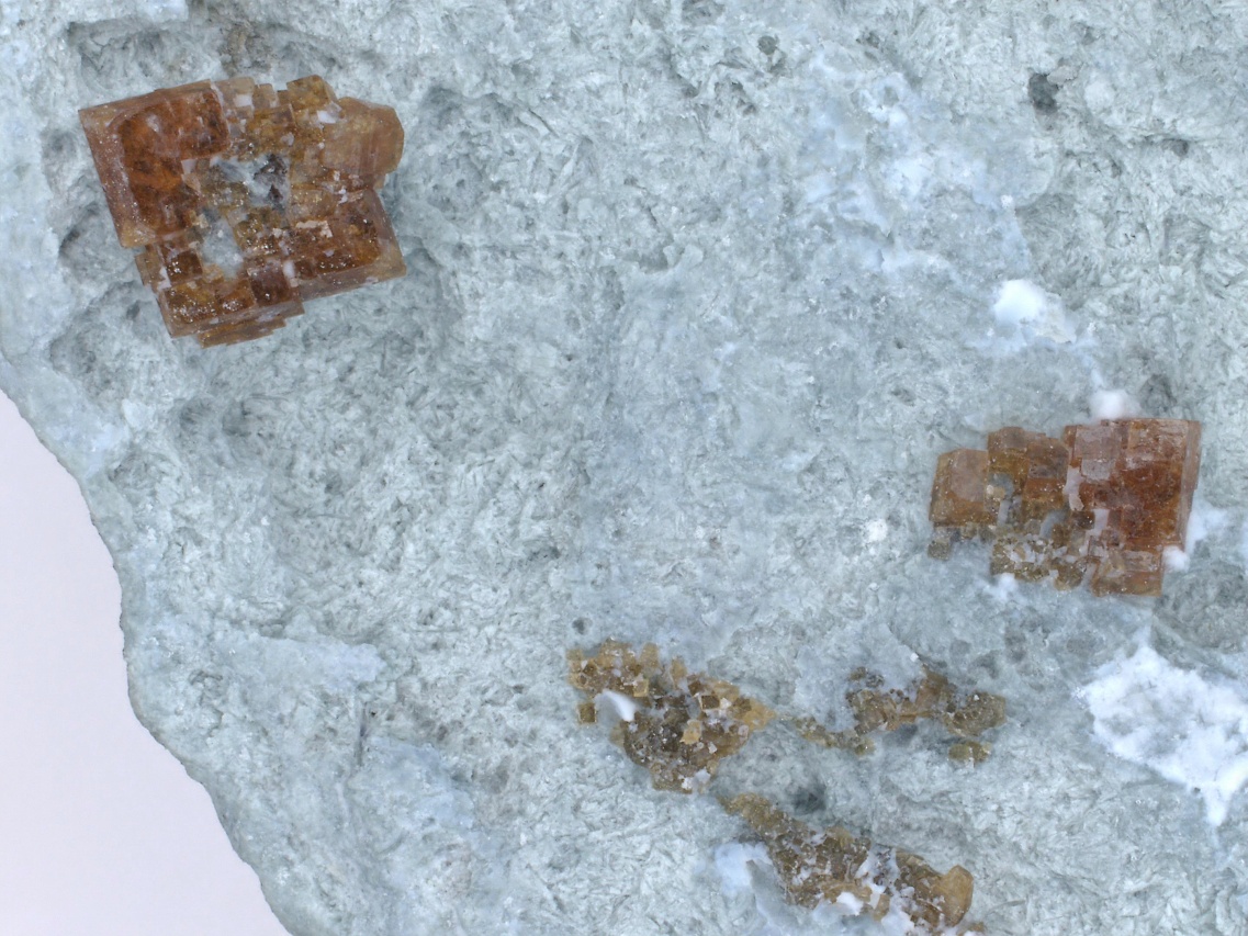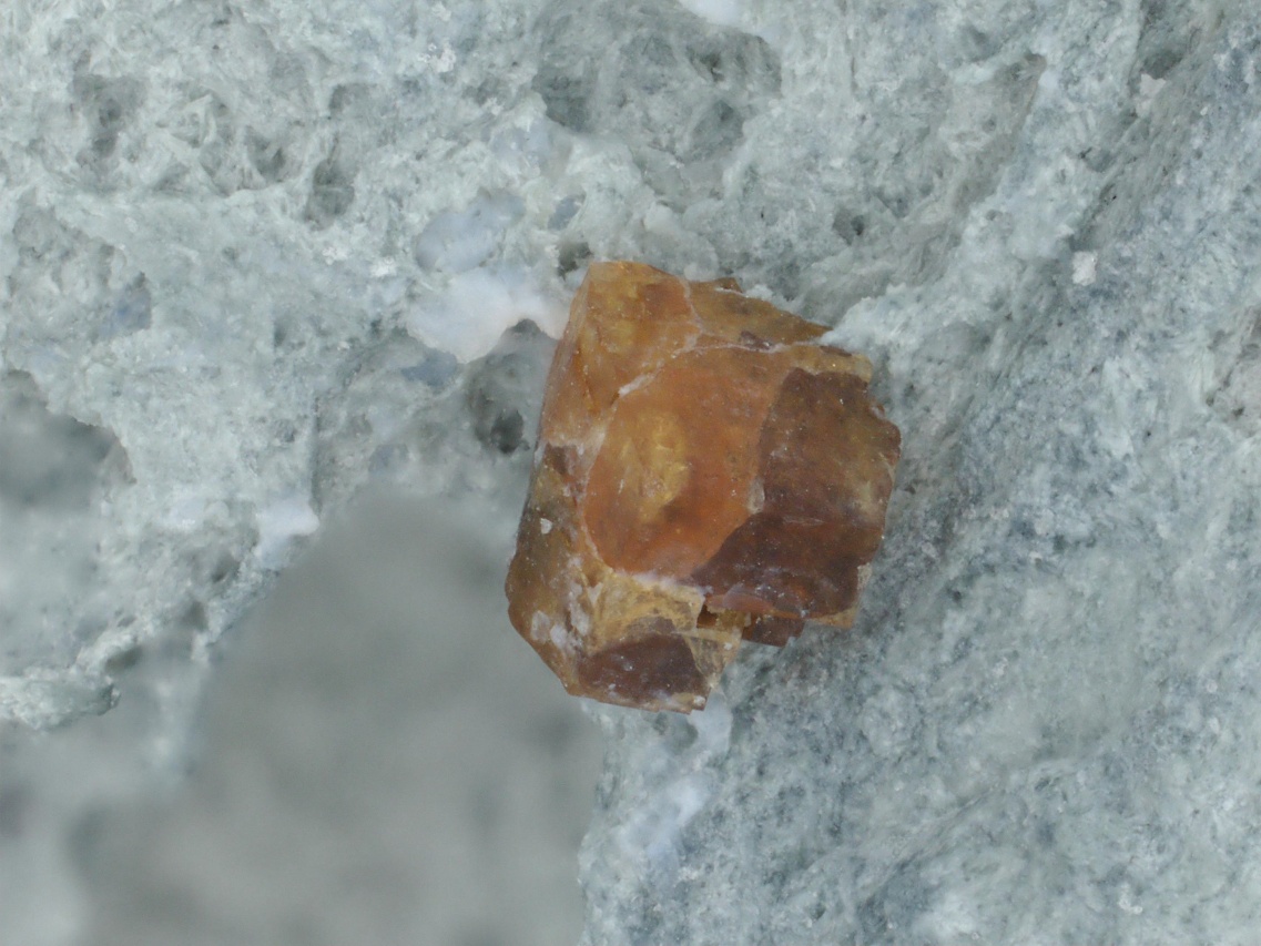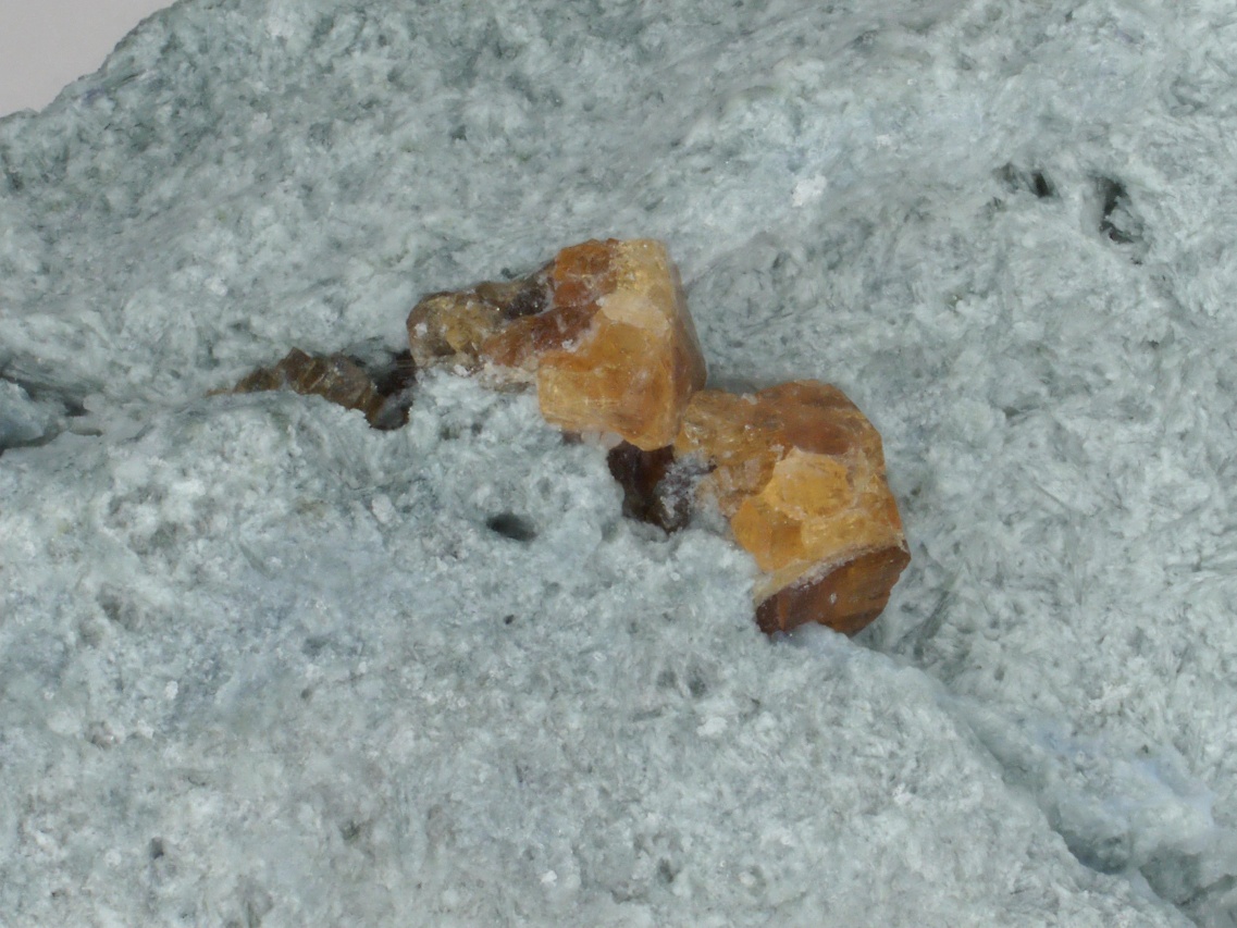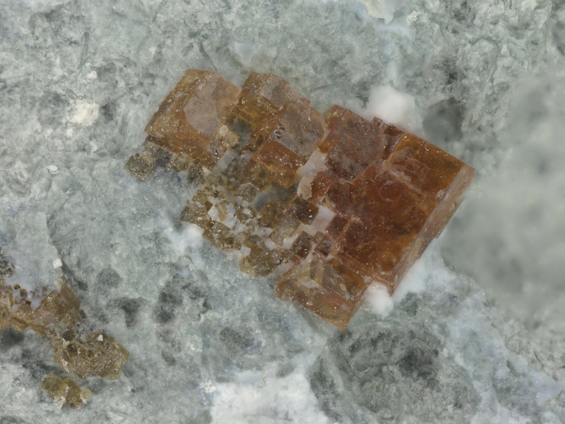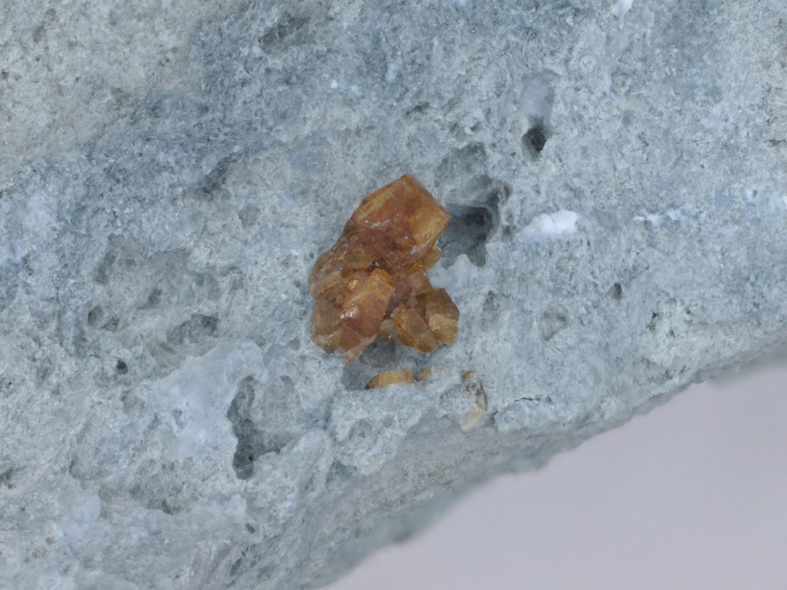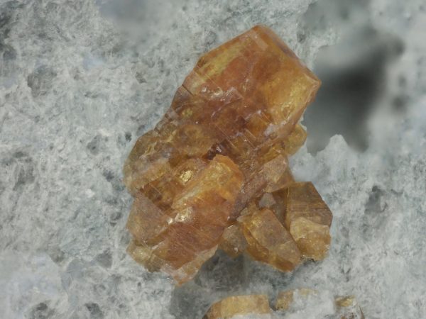 Žluto hnědé krystaly a srostlice vzácného silikátu ceru a barya z typové lokality. Srostlice jsou až 1,5 mm velké.