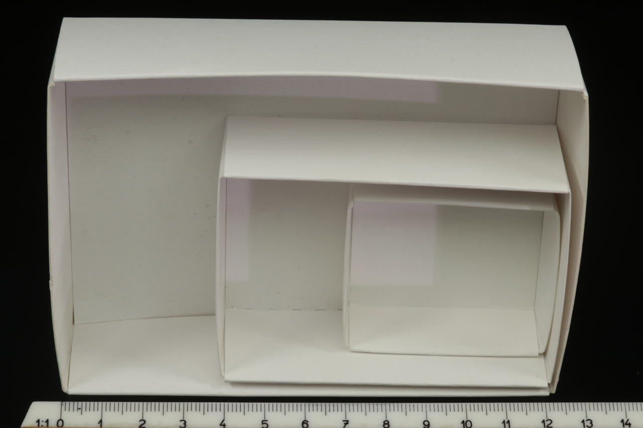 Bílá kartonová krabička určená na uspořádání vnitřku fletu. Rozměry složené krabičky jsou 50 × 46 × 20 mm, 40 krabiček do flatu. Krabičky jsou nesložené.