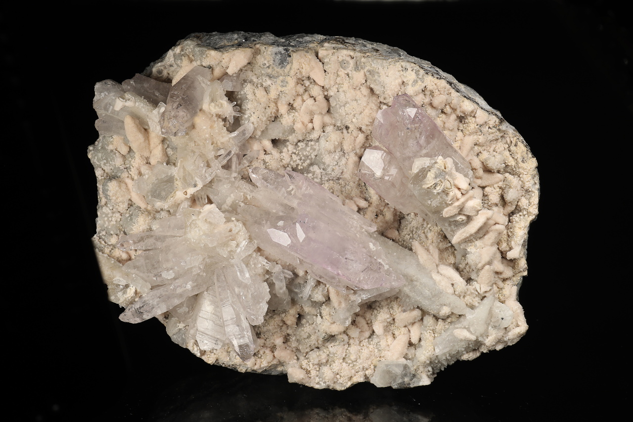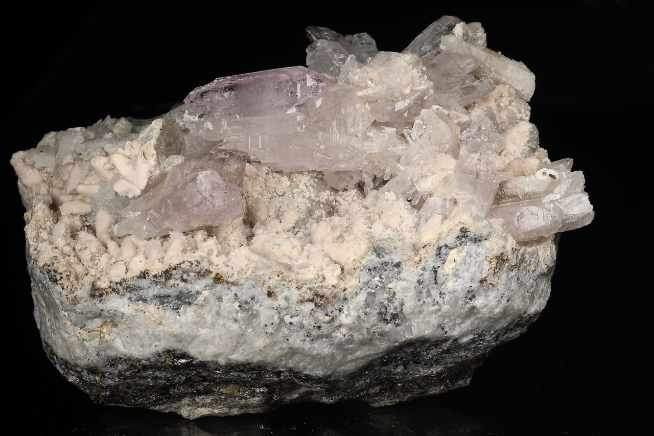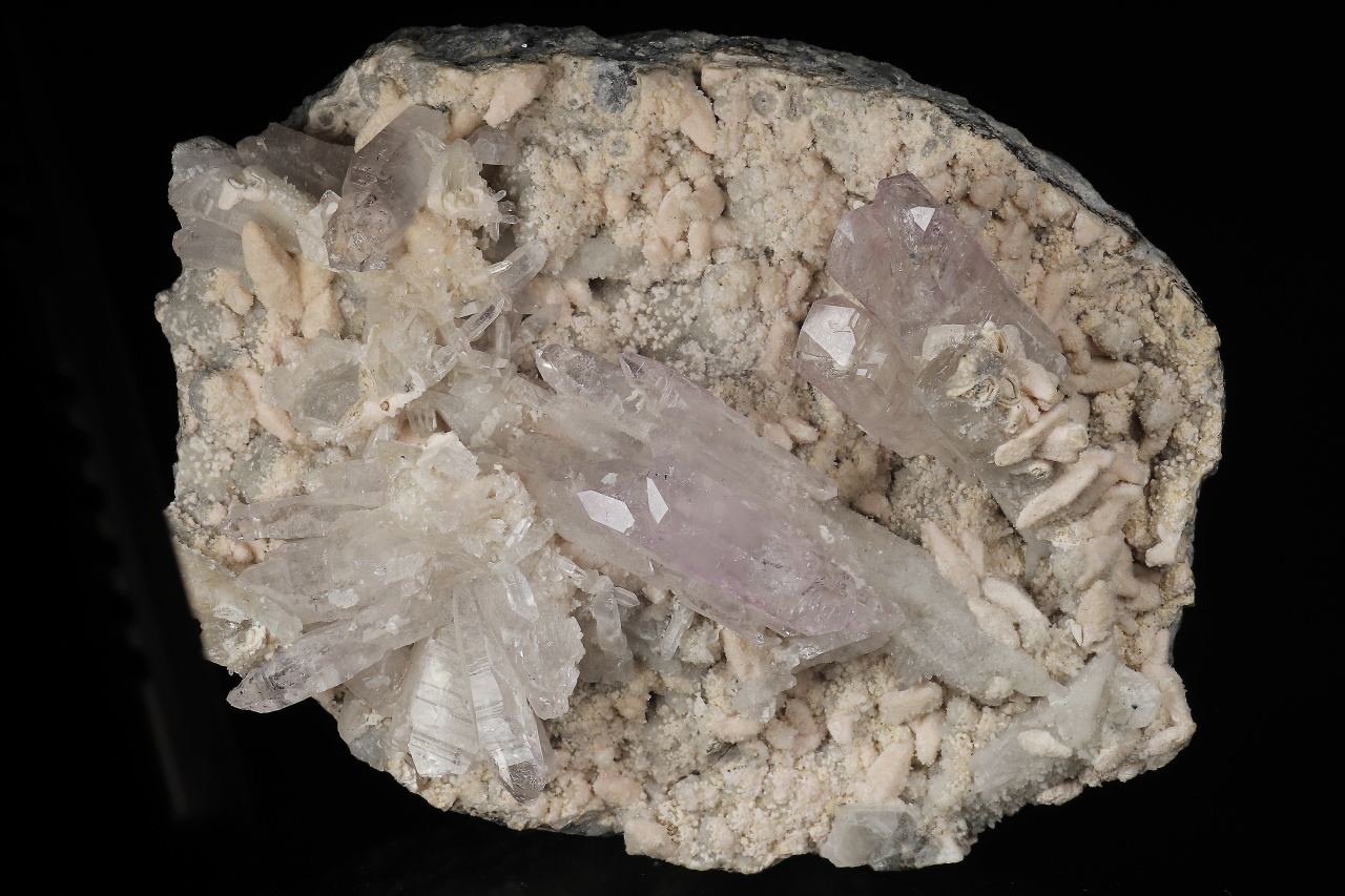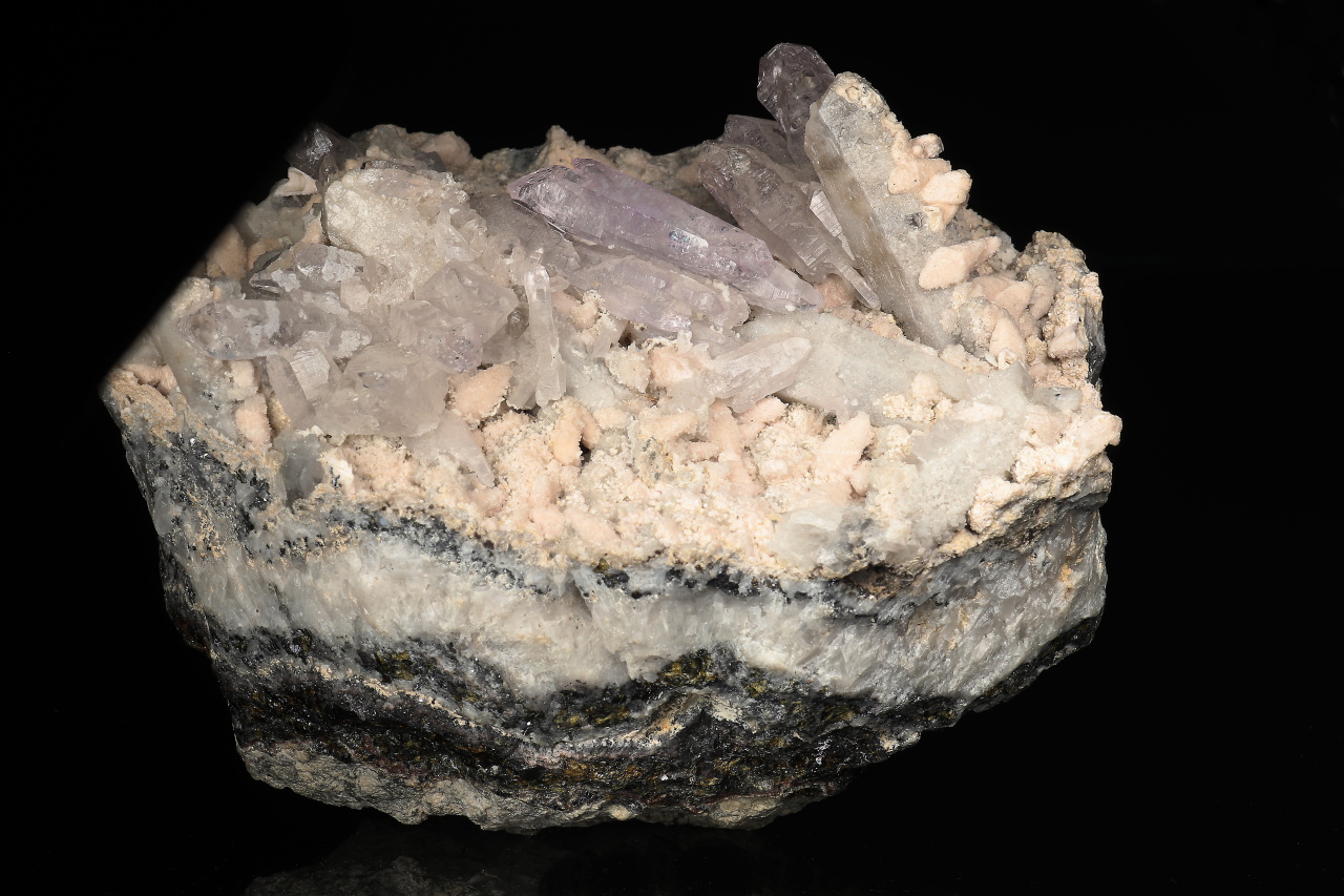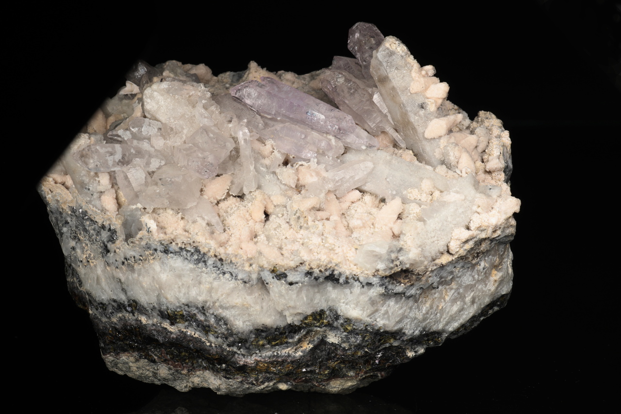 Estetická velká ukázka narůžovělých krystalů dolomitu s žezlovitými krystaly světlého ametystu tzv. „holubníky“. Ukázka je tvořena čirými oboustranně ukončenými krystaly křemene s bílou mladší krustou, na jejichž vrcholy nasedají průhledné světle fialové oboustranně ukončené krystaly ametystu. Tyto krystaly jsou doprovázeny narůžovělým dolomitem. Tyto minerály narůstají na masivní galenit-sfaleritovou žílu. Historický větší velmi elegantní vzorek z Banské Štiavnice.