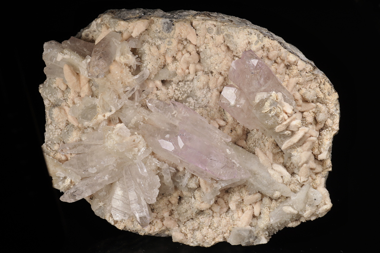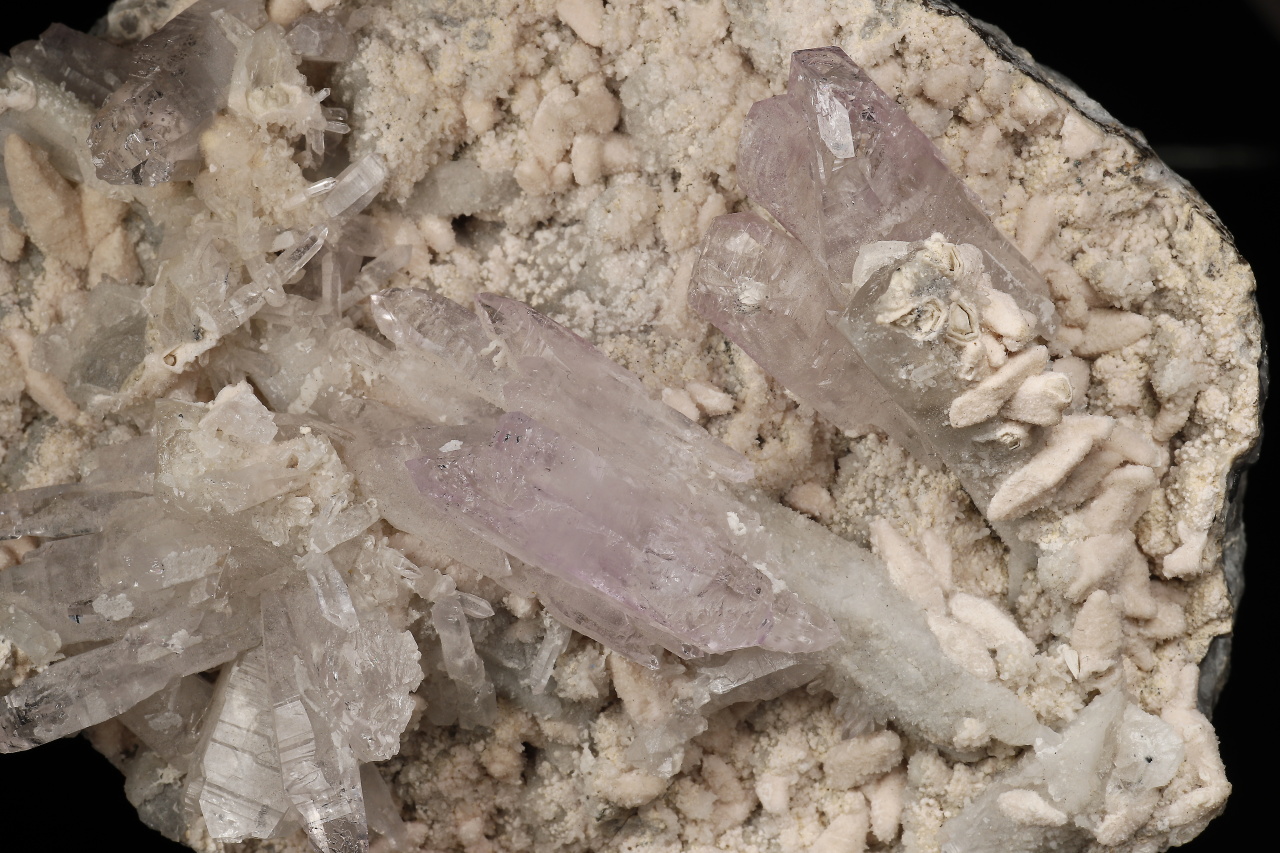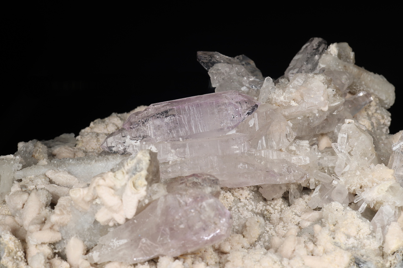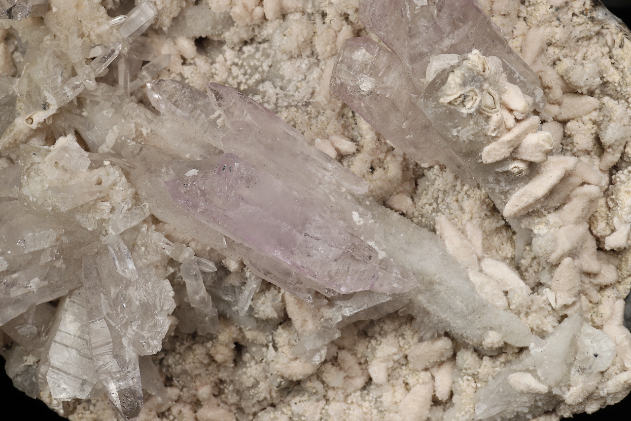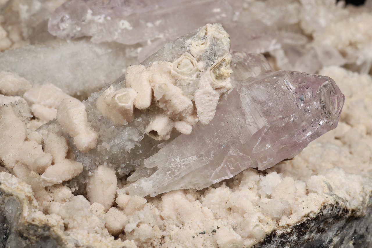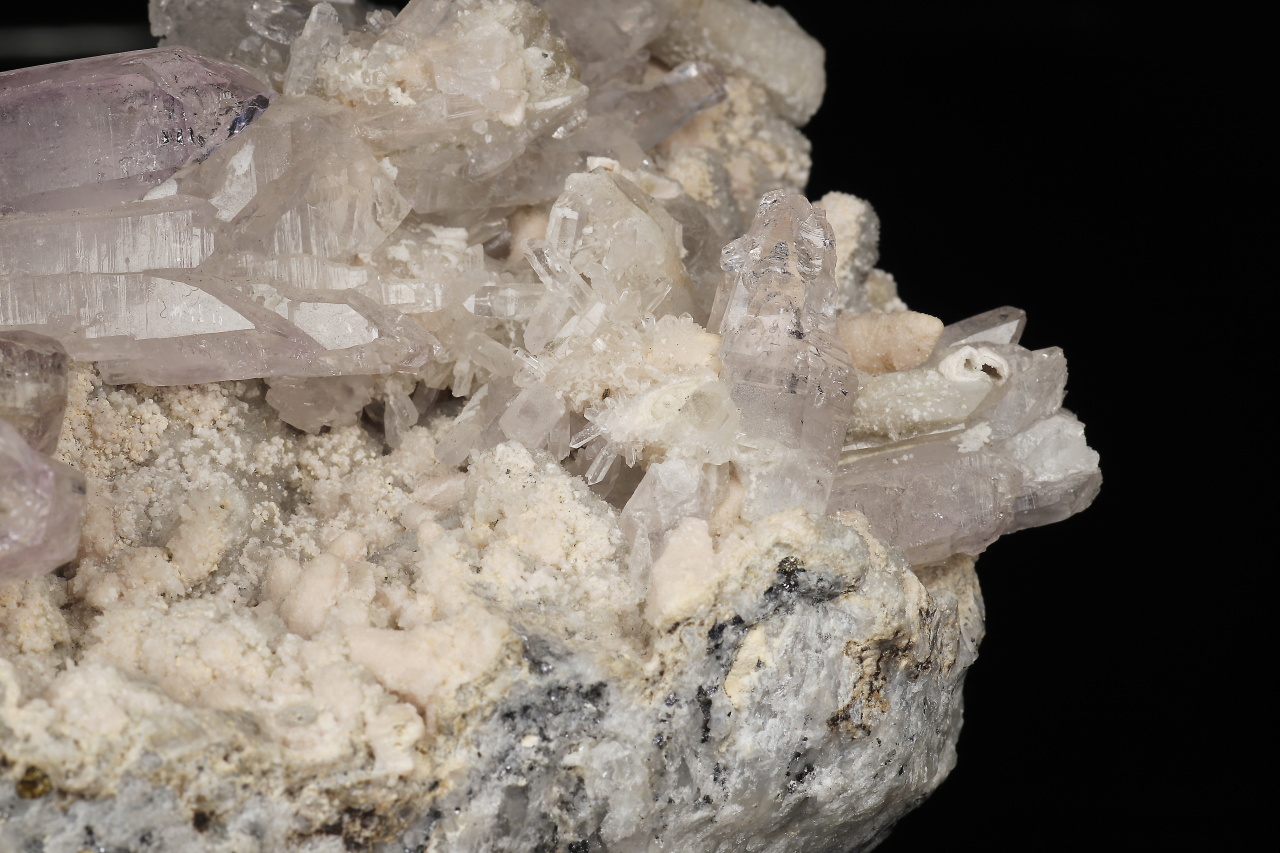 Estetická velká ukázka narůžovělých krystalů dolomitu s žezlovitými krystaly světlého ametystu tzv. „holubníky“. Ukázka je tvořena čirými oboustranně ukončenými krystaly křemene s bílou mladší krustou, na jejichž vrcholy nasedají průhledné světle fialové oboustranně ukončené krystaly ametystu. Tyto krystaly jsou doprovázeny narůžovělým dolomitem. Tyto minerály narůstají na masivní galenit-sfaleritovou žílu. Historický větší velmi elegantní vzorek z Banské Štiavnice.