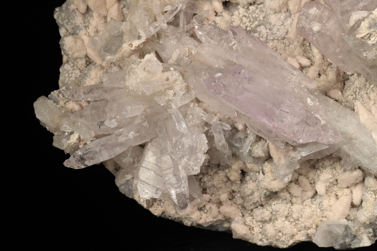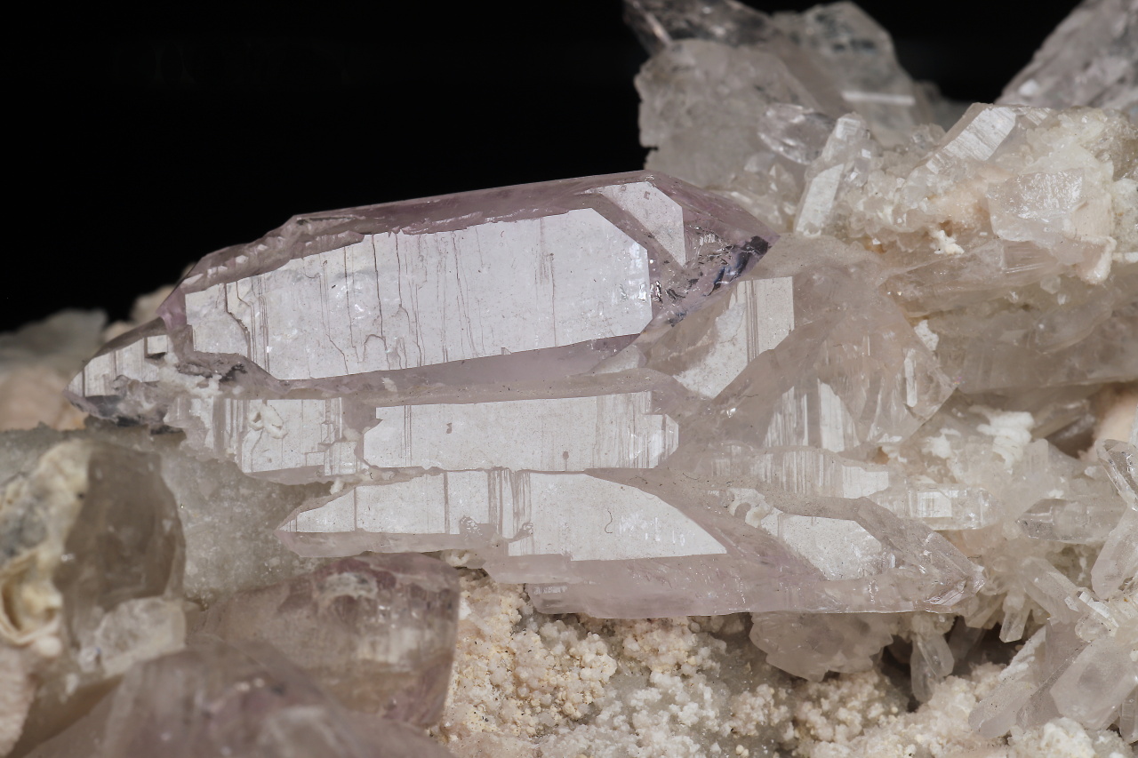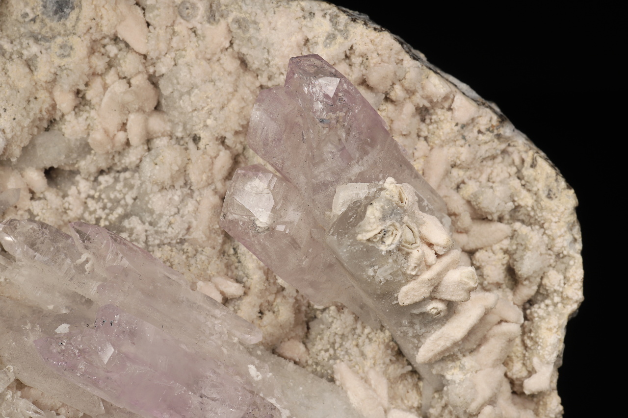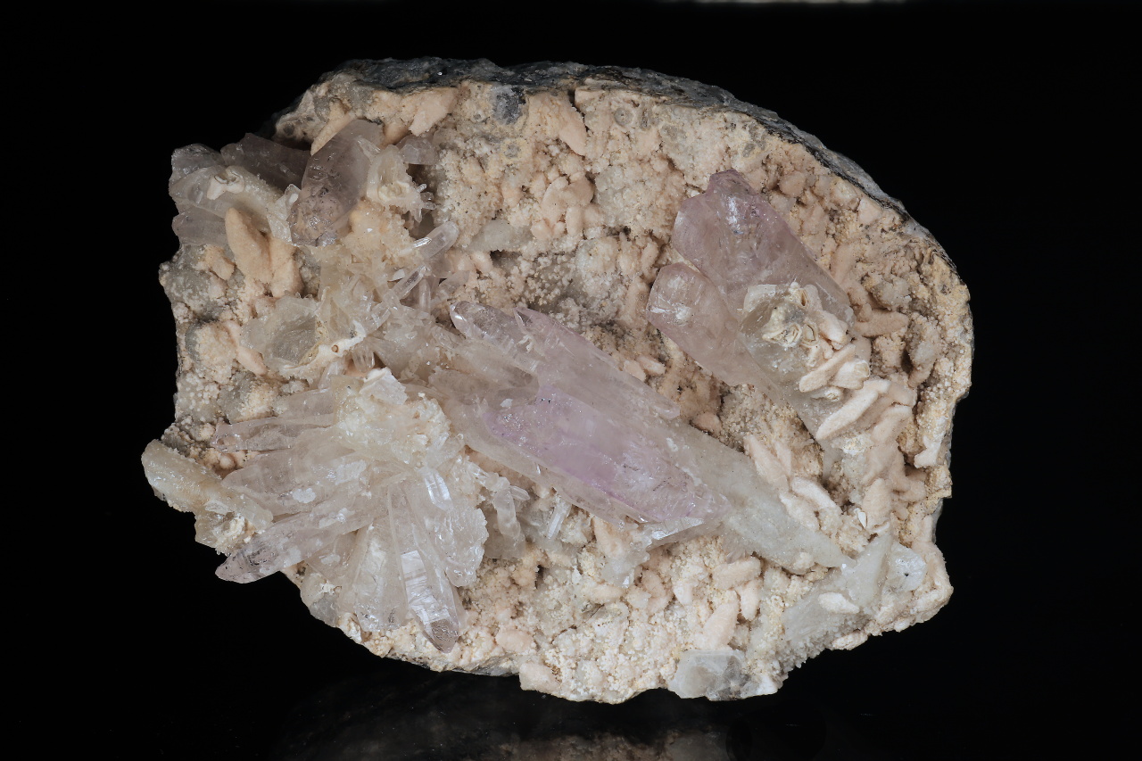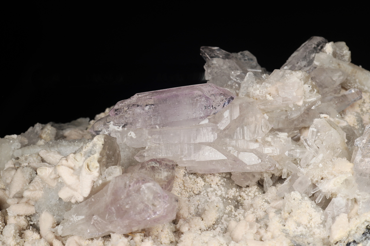Estetická velká ukázka narůžovělých krystalů dolomitu s žezlovitými krystaly světlého ametystu tzv. „holubníky“. Ukázka je tvořena čirými oboustranně ukončenými krystaly křemene s bílou mladší krustou, na jejichž vrcholy nasedají průhledné světle fialové oboustranně ukončené krystaly ametystu. Tyto krystaly jsou doprovázeny narůžovělým dolomitem. Tyto minerály narůstají na masivní galenit-sfaleritovou žílu. Historický větší velmi elegantní vzorek z Banské Štiavnice.