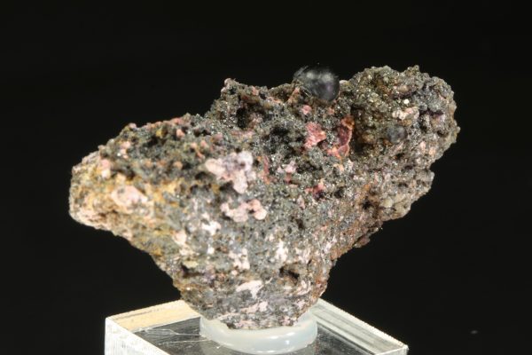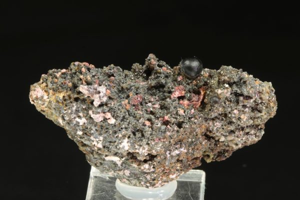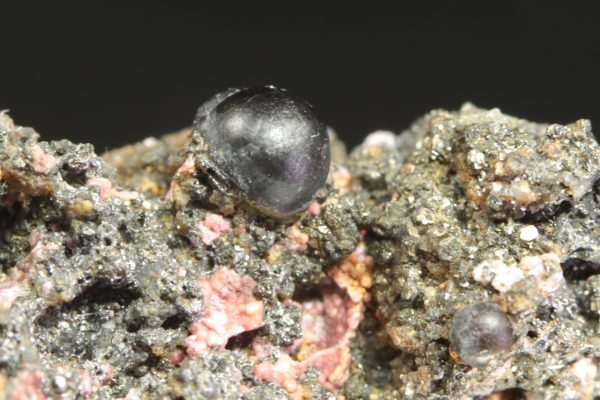Tři milimetry velký kulovitý agregát černého silikátu bismutu eulitinu. Vzorek pochází ze štoly Adam.
